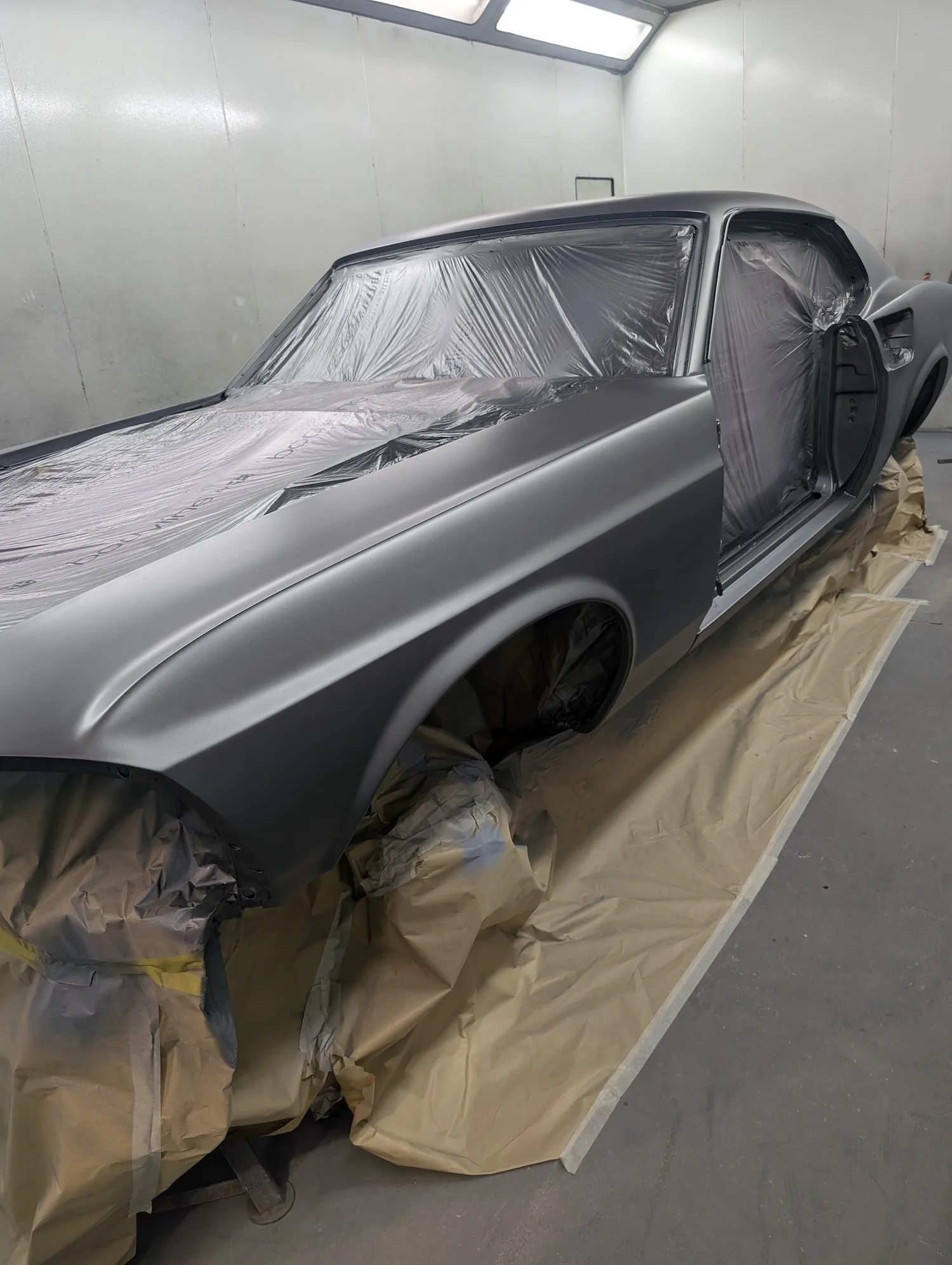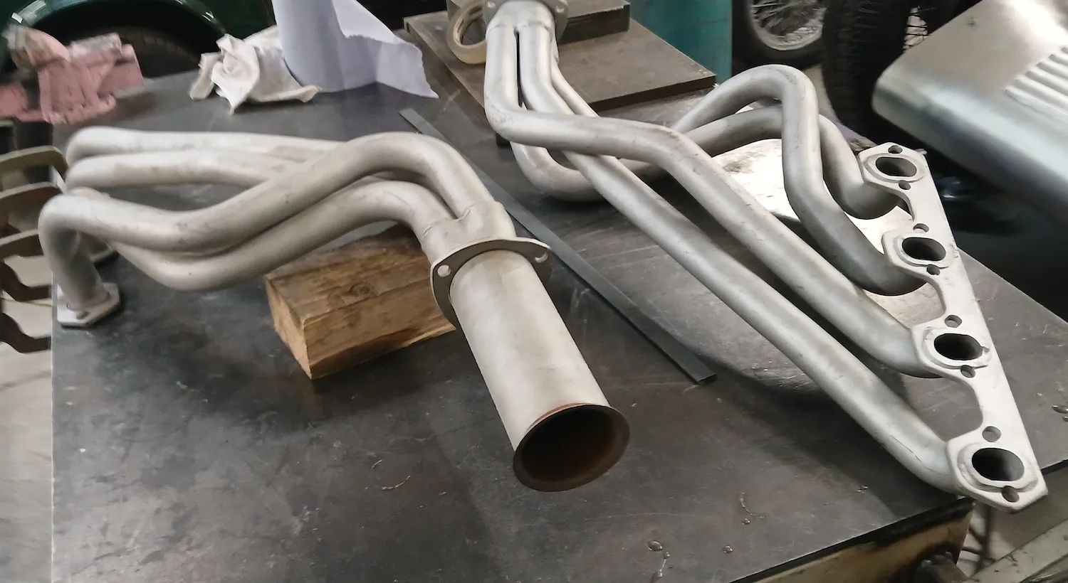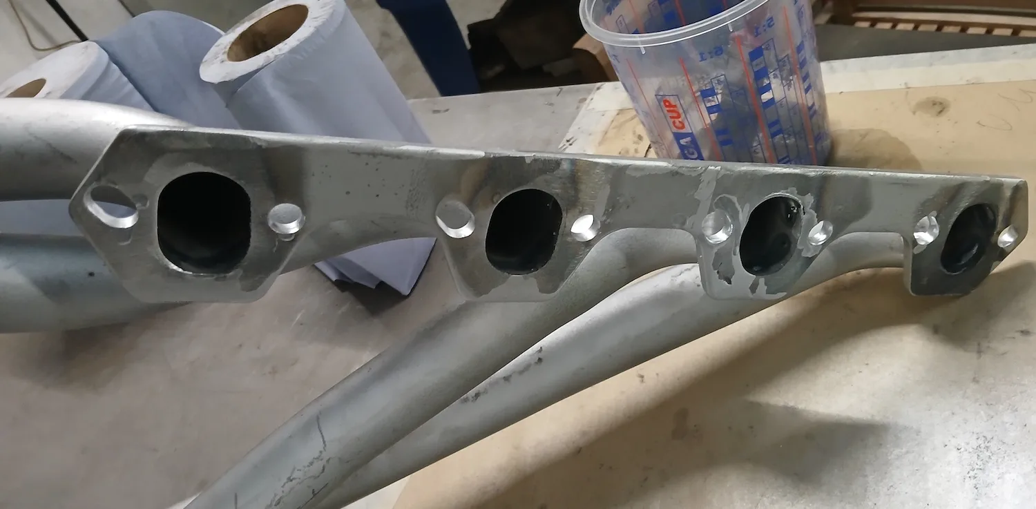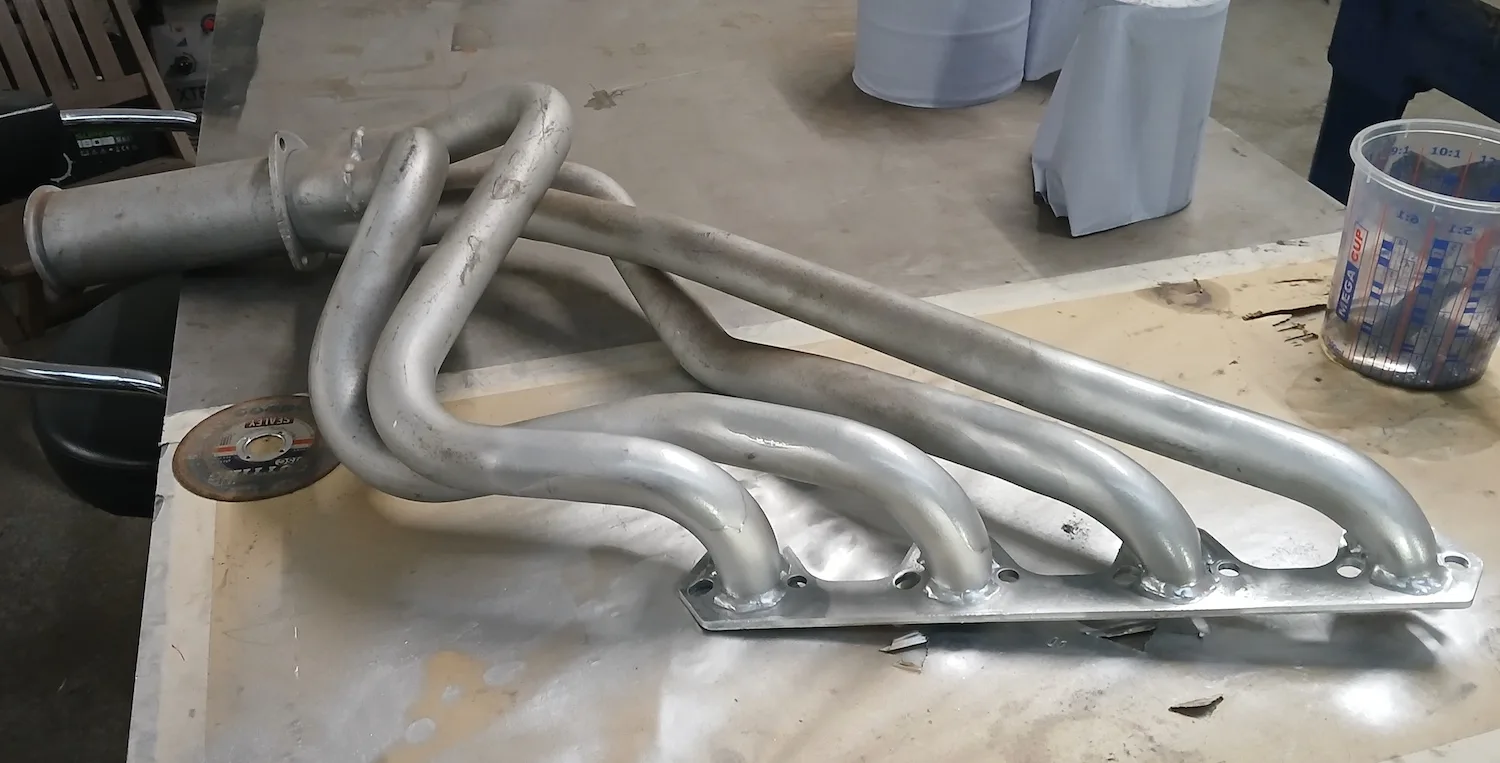 20th December 2025: All prep and prime stages have been completed and now the body is going into paint. These pictures show the paint fresh of the gun. Engine has been removed for setup and a test run. Headers needed quite a lot of tweaking and welding to make them fit and seal correctly to the block.