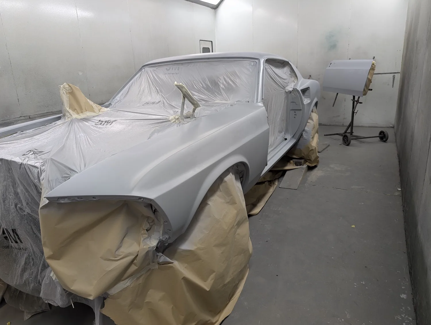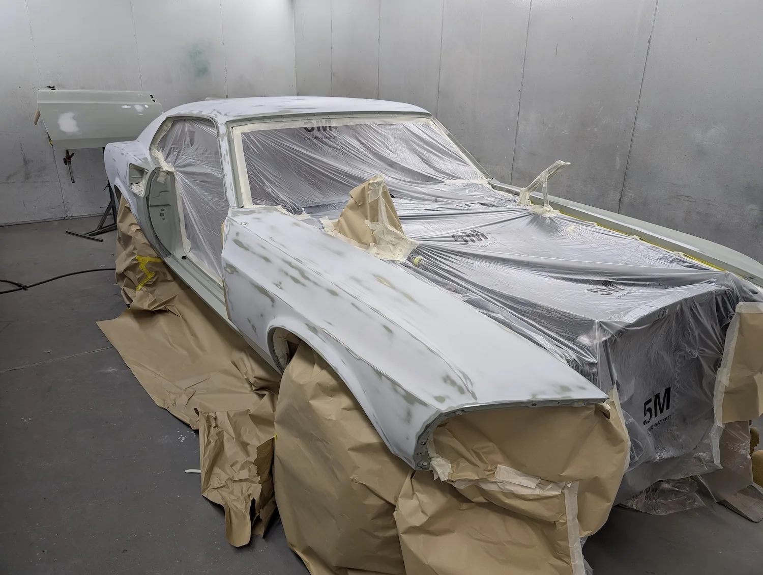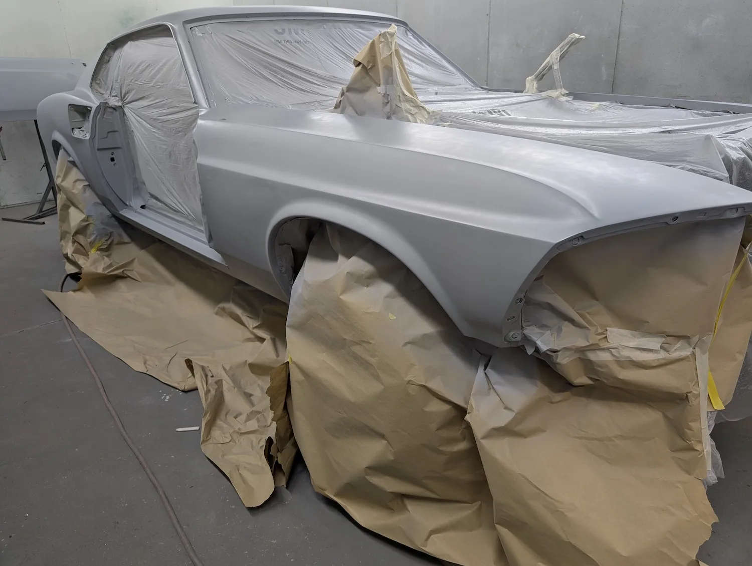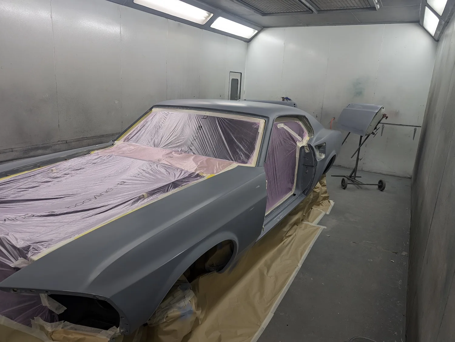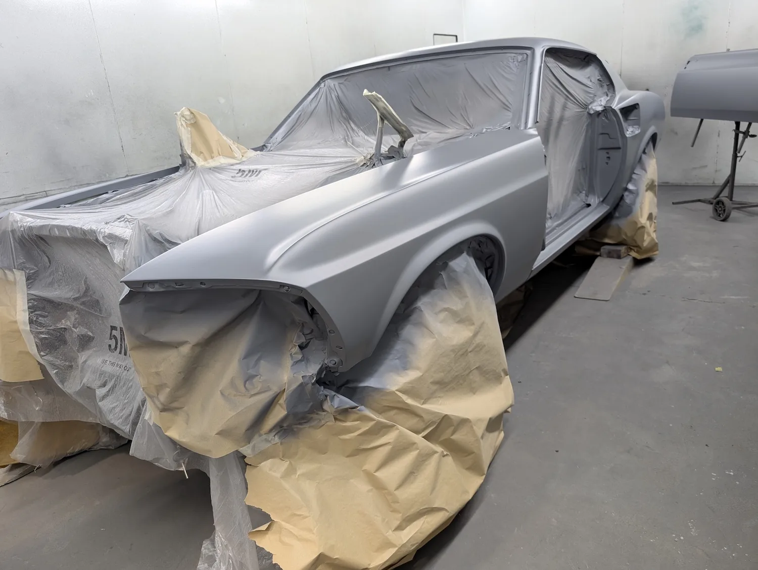 20th December 2025: All prep and prime stages have been completed and now the body is going into paint. These pictures show the paint fresh of the gun. Engine has been removed for setup and a test run. Headers needed quite a lot of tweaking and welding to make them fit and seal correctly to the block.