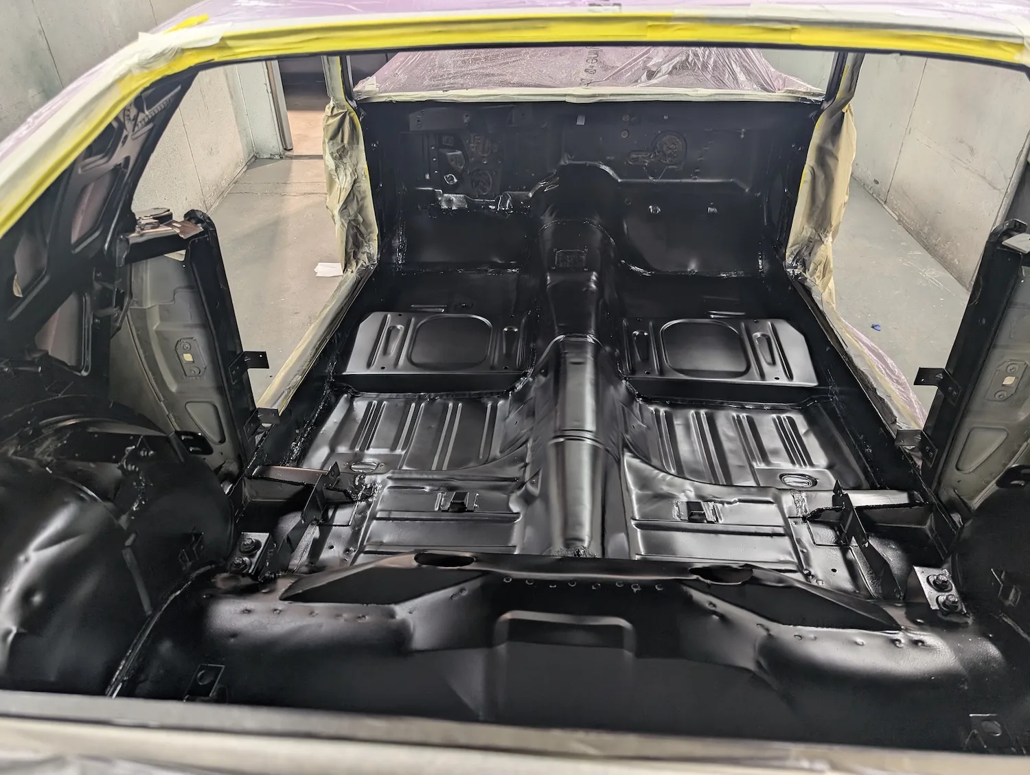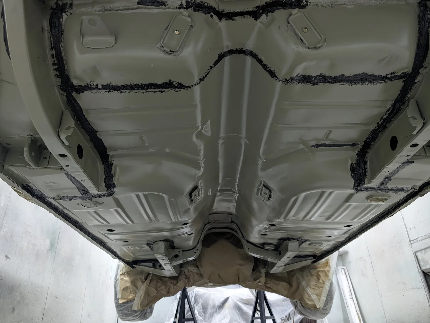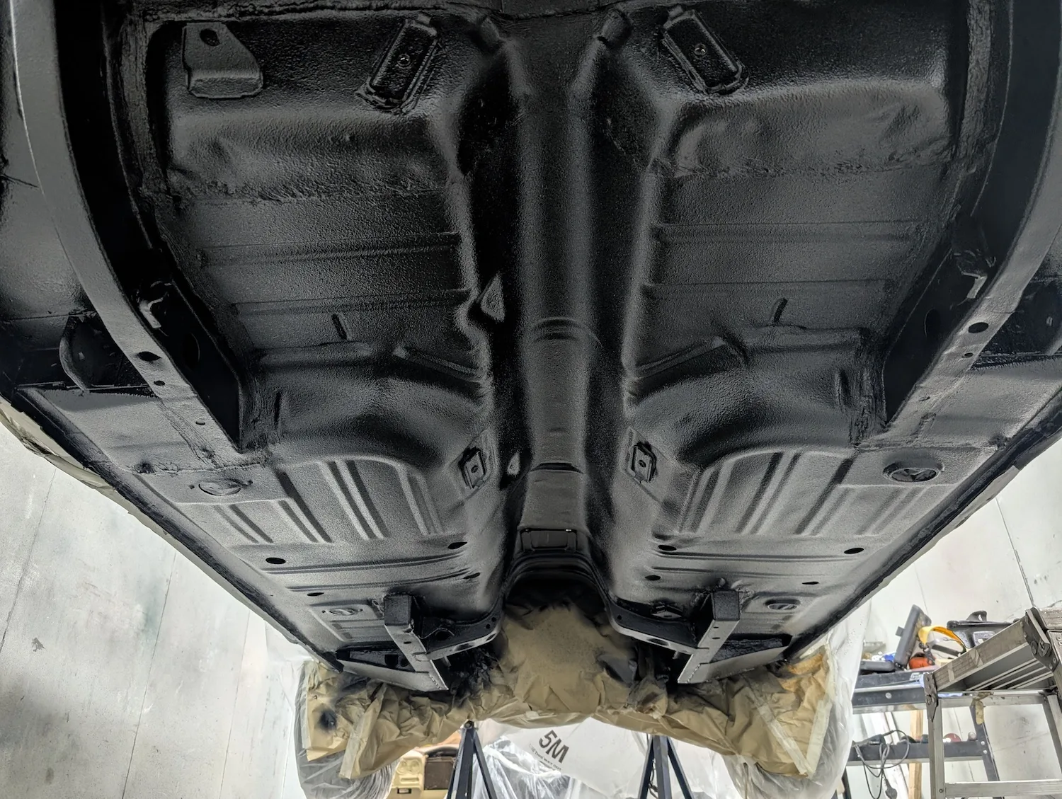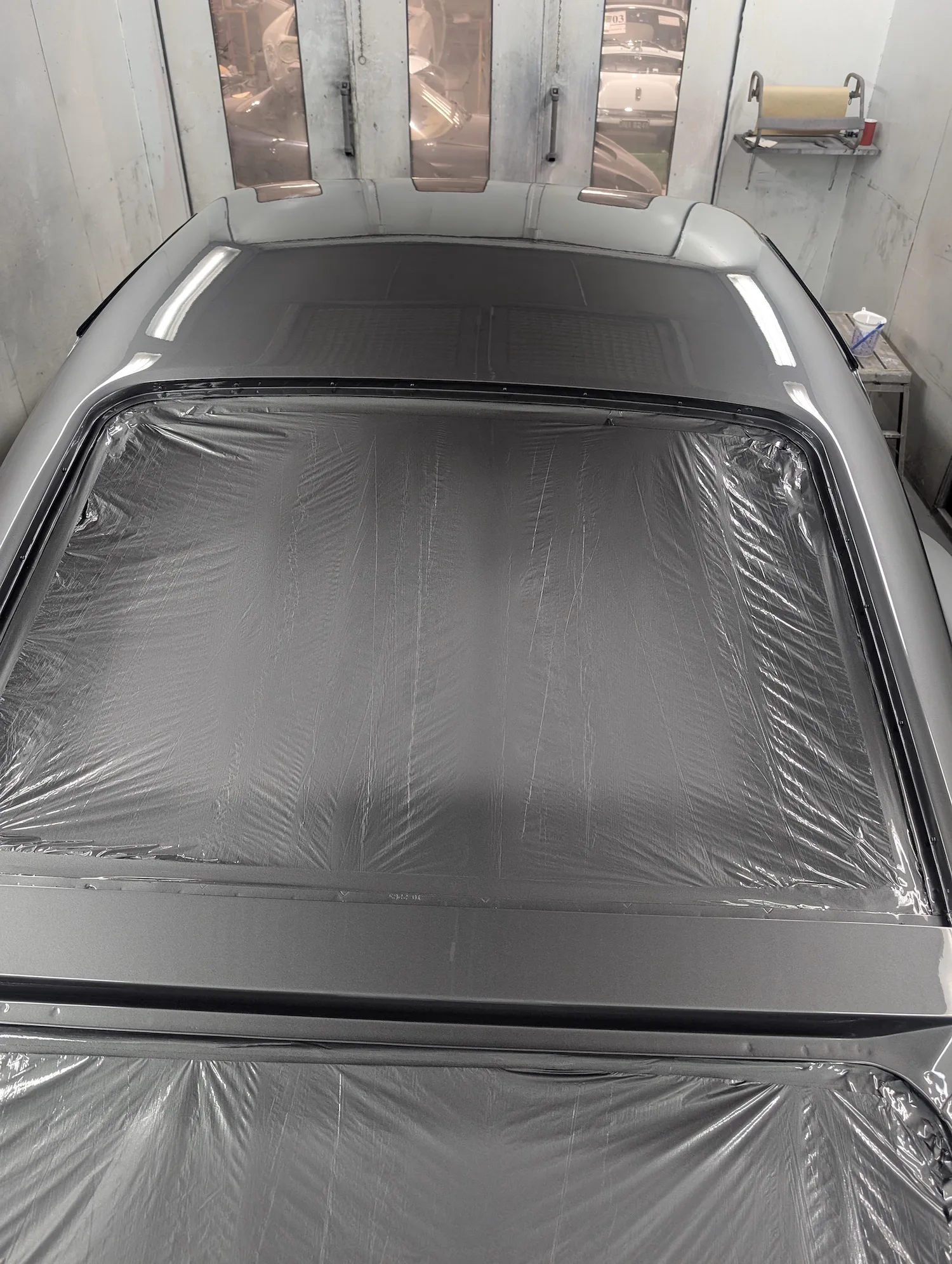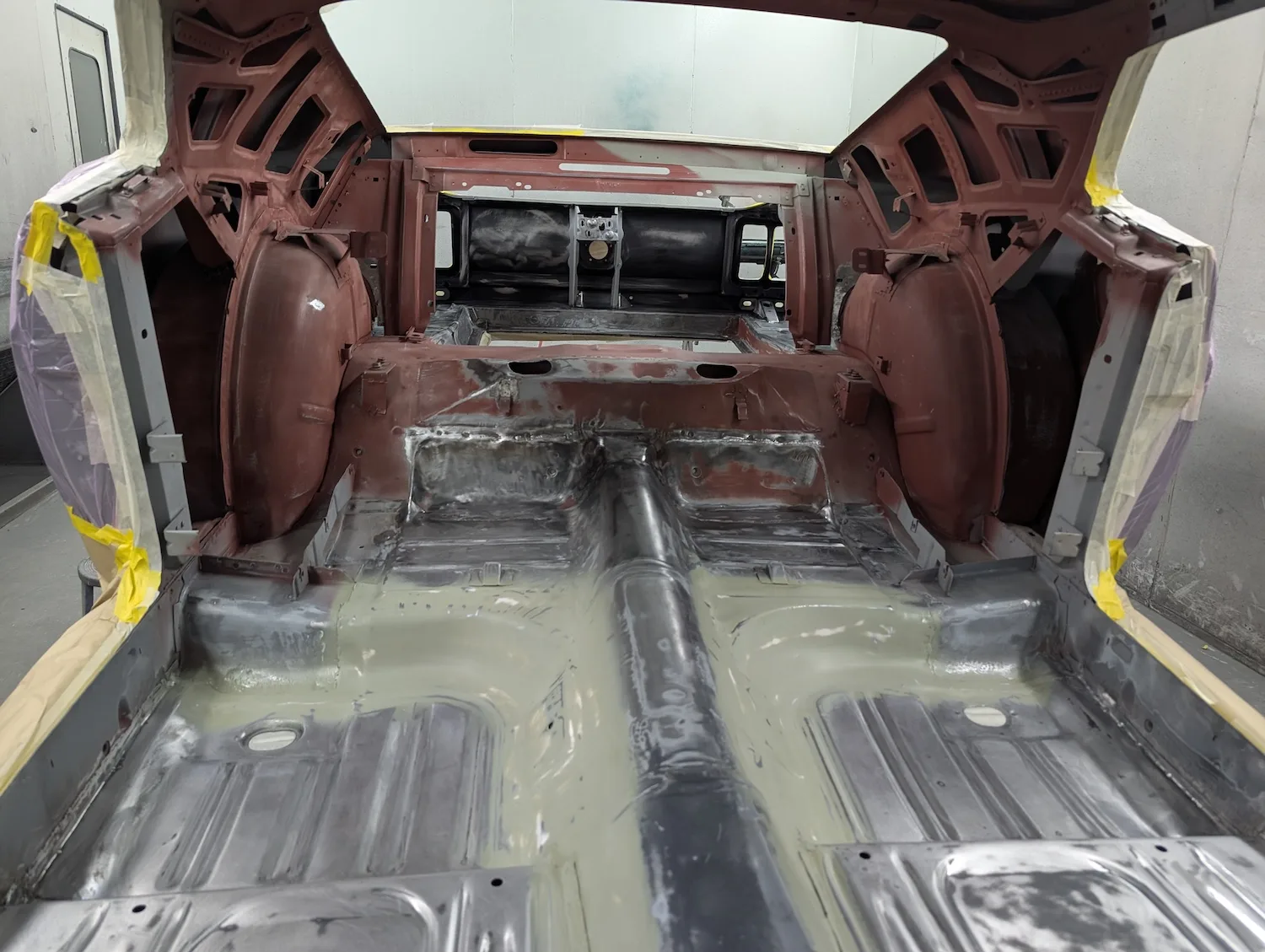5th December 2025: Spray filler blocked and final repairs done. Masked and now ready for final primer coats. A coat of isolator primer and 3 coats of spectral acrylic primer applied and it’s now ready to block the next step colour. Under floor tidied up, epoxy primed, sealed and Novol cobra underbody protection applied. Bonnet epoxy primed, new hinges fitted and finally bonnet fitted. Cabin painted. Prepped, masked, epoxy primed, sealed and painted matt black.