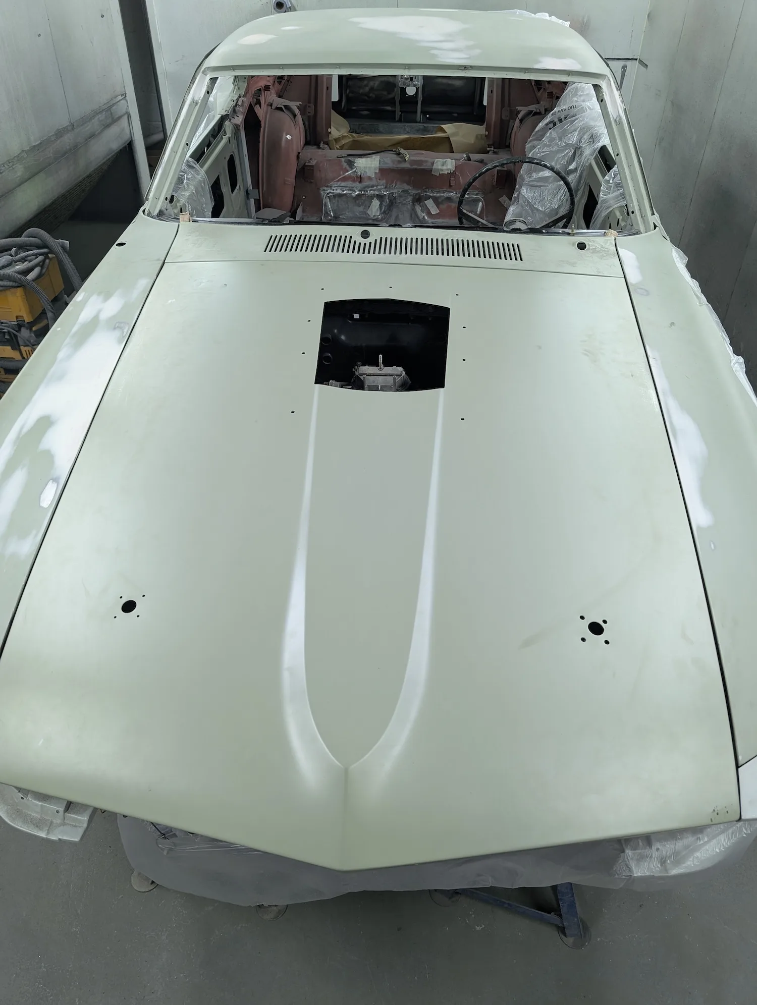 18th June 2025: Wings scrubbed with Jenolite rust remover sanded and epoxy primed and in underside of wings coated in Novol Polycoat. Bonnet cut to make scoop functional.