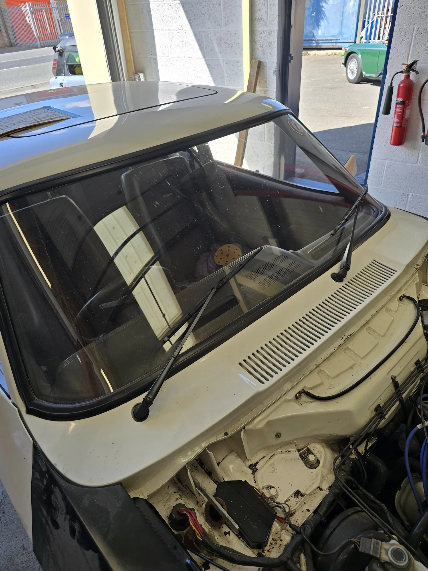 1st October 2025: The doors were stripped out along with the remaining parts in the engine bay. The lights and wipers were also removed. The next stage was to remove the paint on the wings and to grind out any rust on the front panel. Repairs were then started on the left door. Finally, the filler and bare metal work were completed and the high build primer was applied.