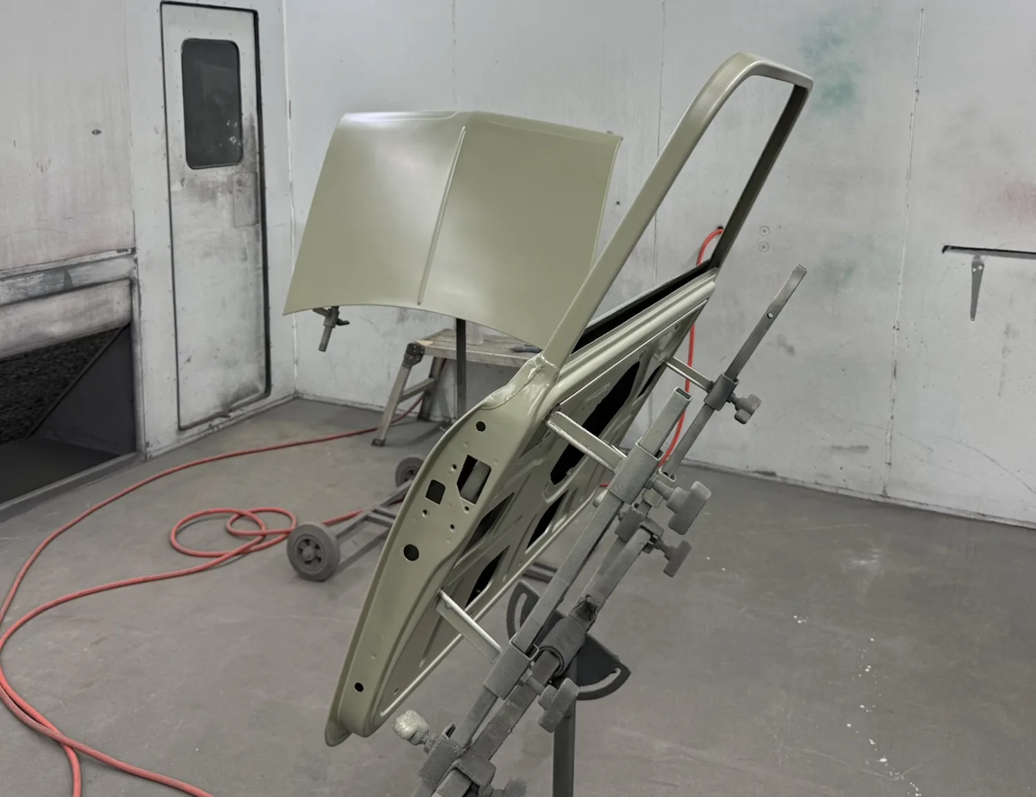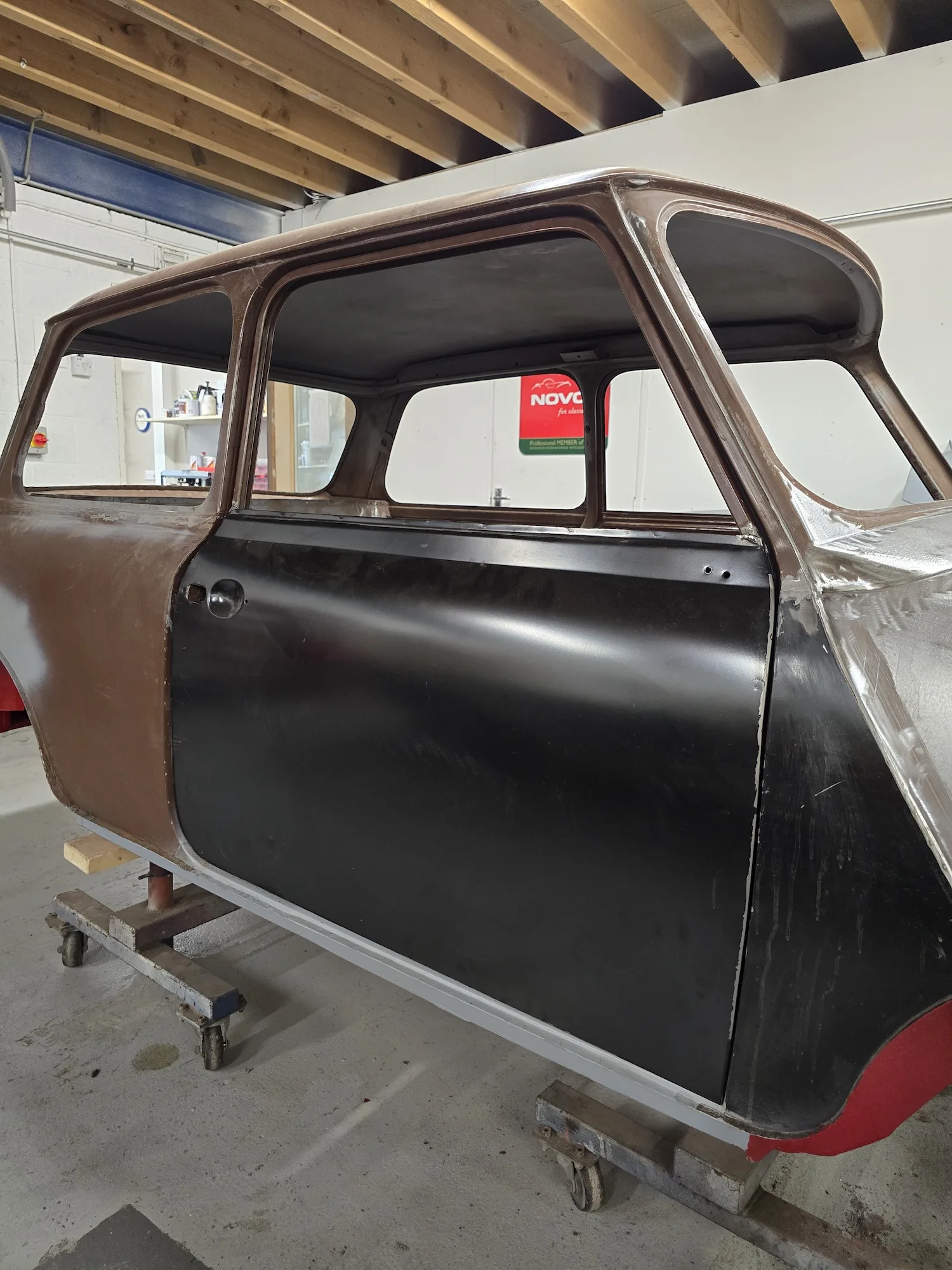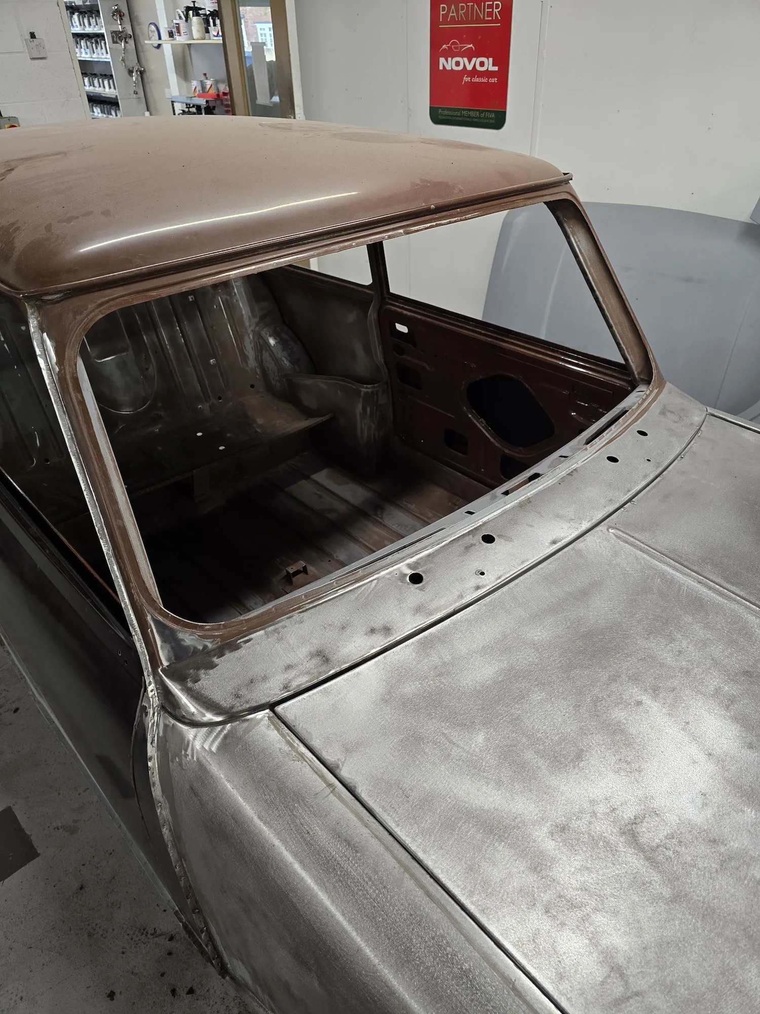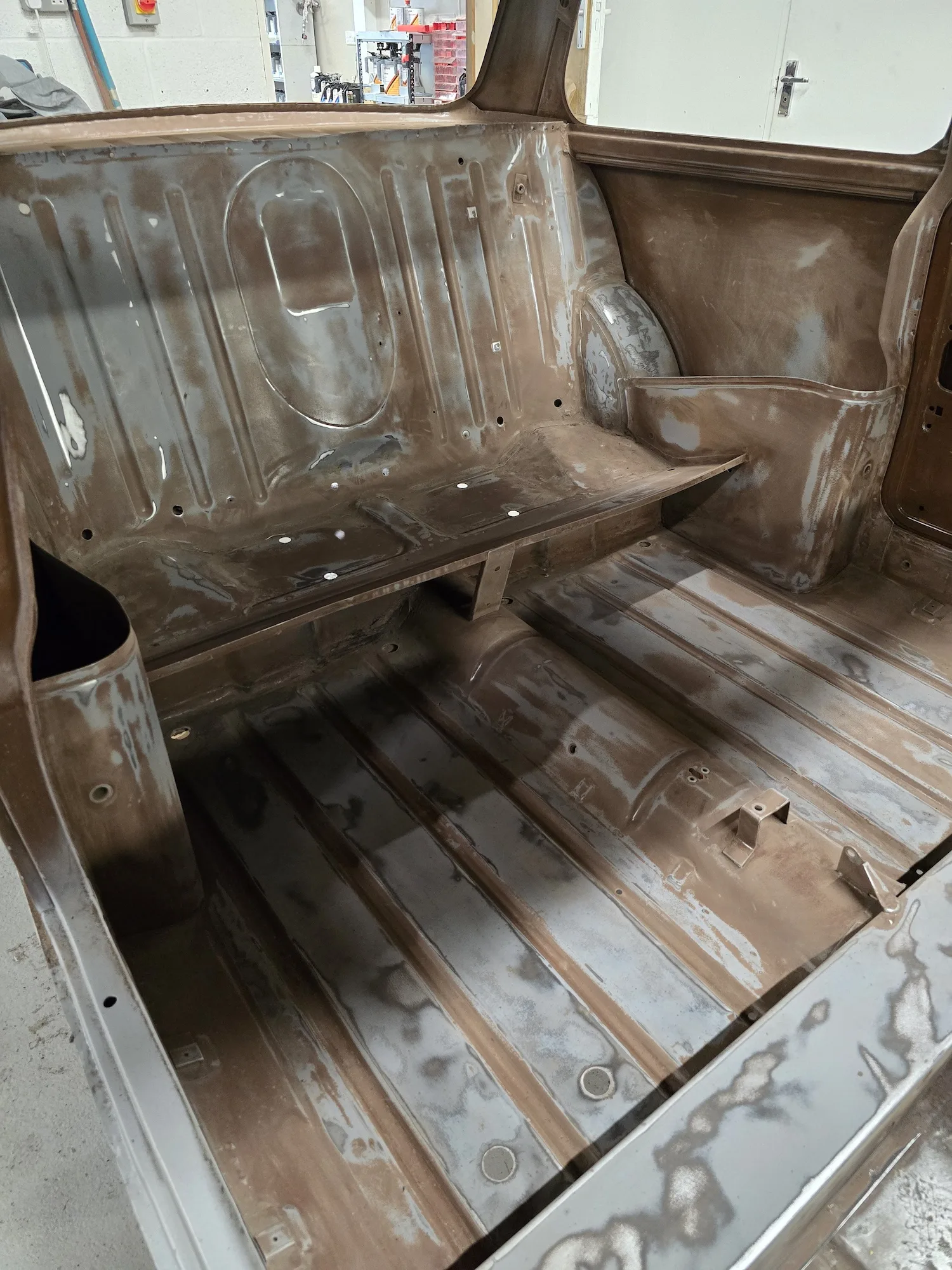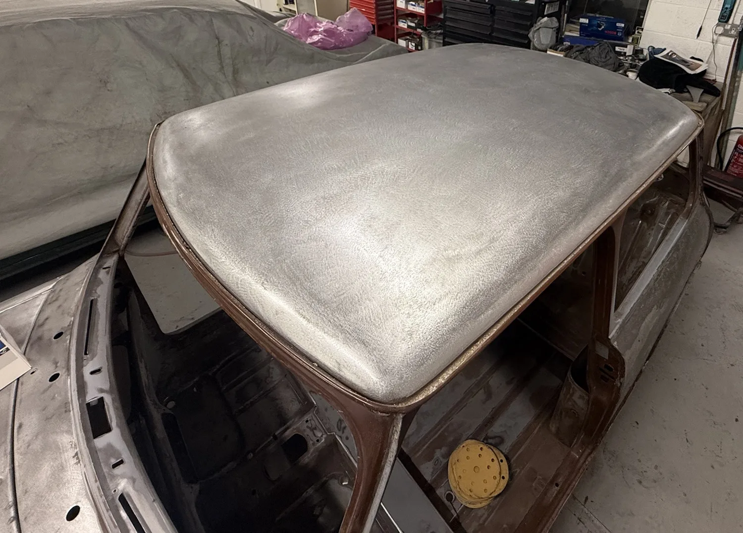 1st October 2025: The doors were test fitted, but the passenger side door in particular wasn’t lining up well with the front wing as it had previously been welded out of place. This was rectified by our fabricators in preparation for paint. The front end, bonnet, doors, roof and quarter panels were all stripped of their original paint and transport primer then sanded down. The inside was also prepped up ready for primer and paint. Both n/s and o/s doors, bonnet and bootlid were then prepped and Jenolite applied before a final sand and two coats of hybrid epoxy primer. Rust was found on the sill, backpanel and rear window, so these were all repaired.
