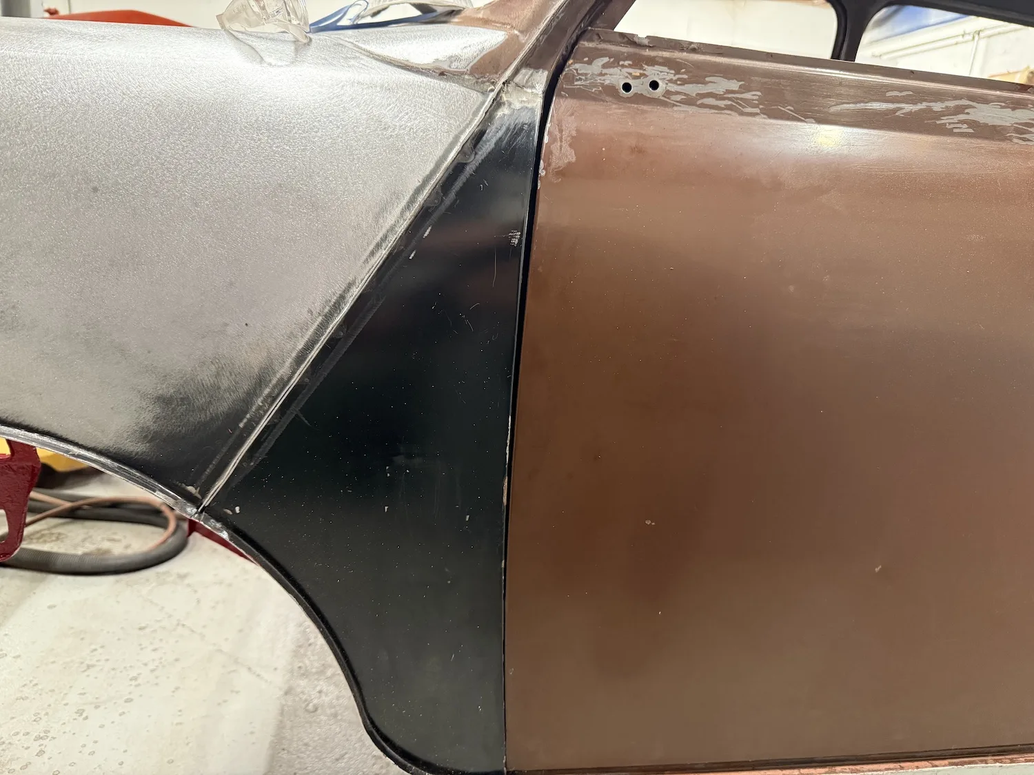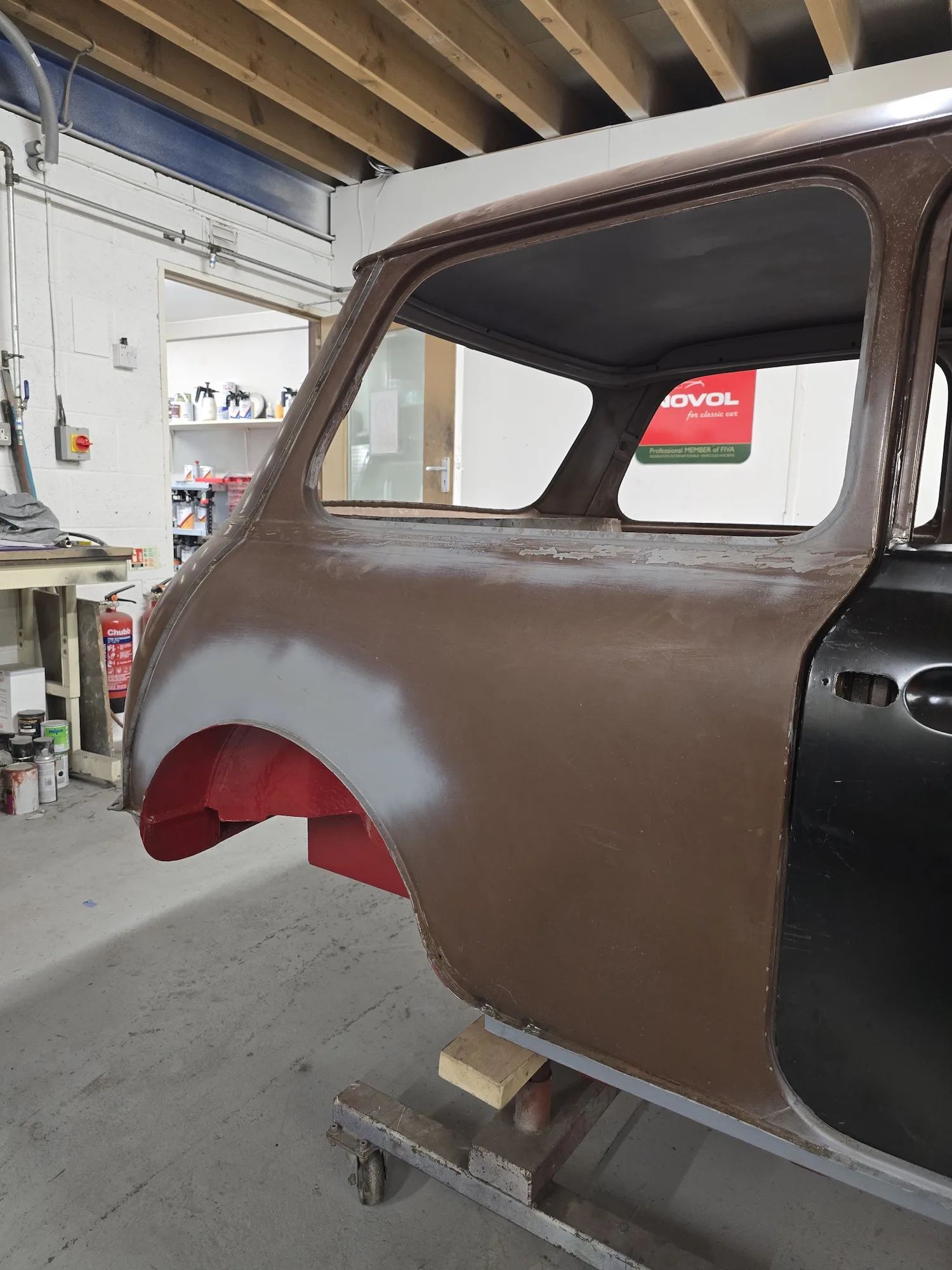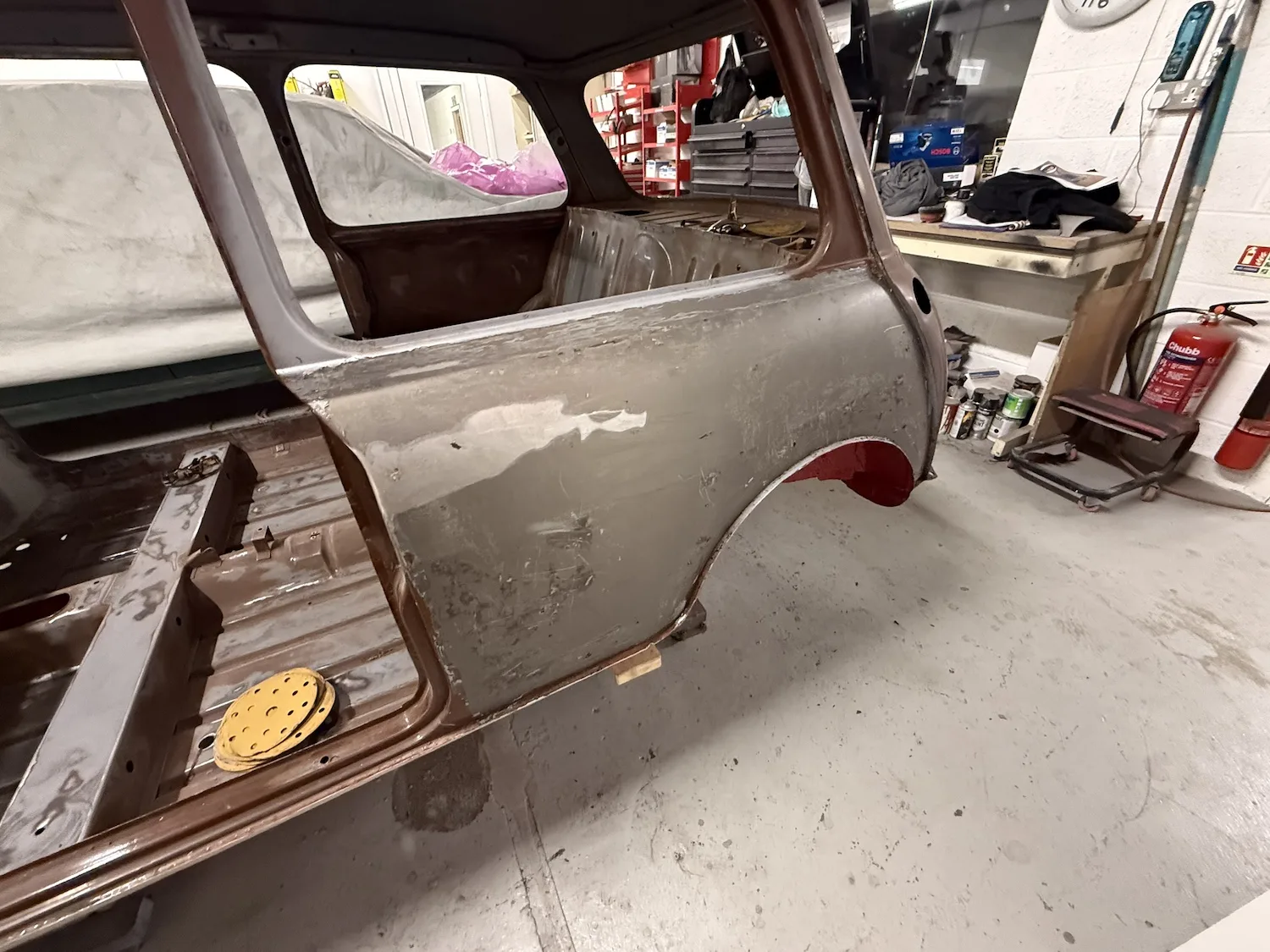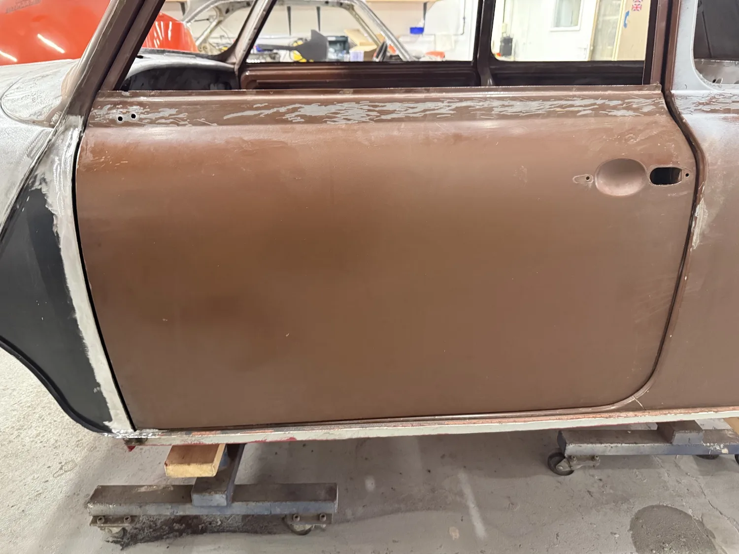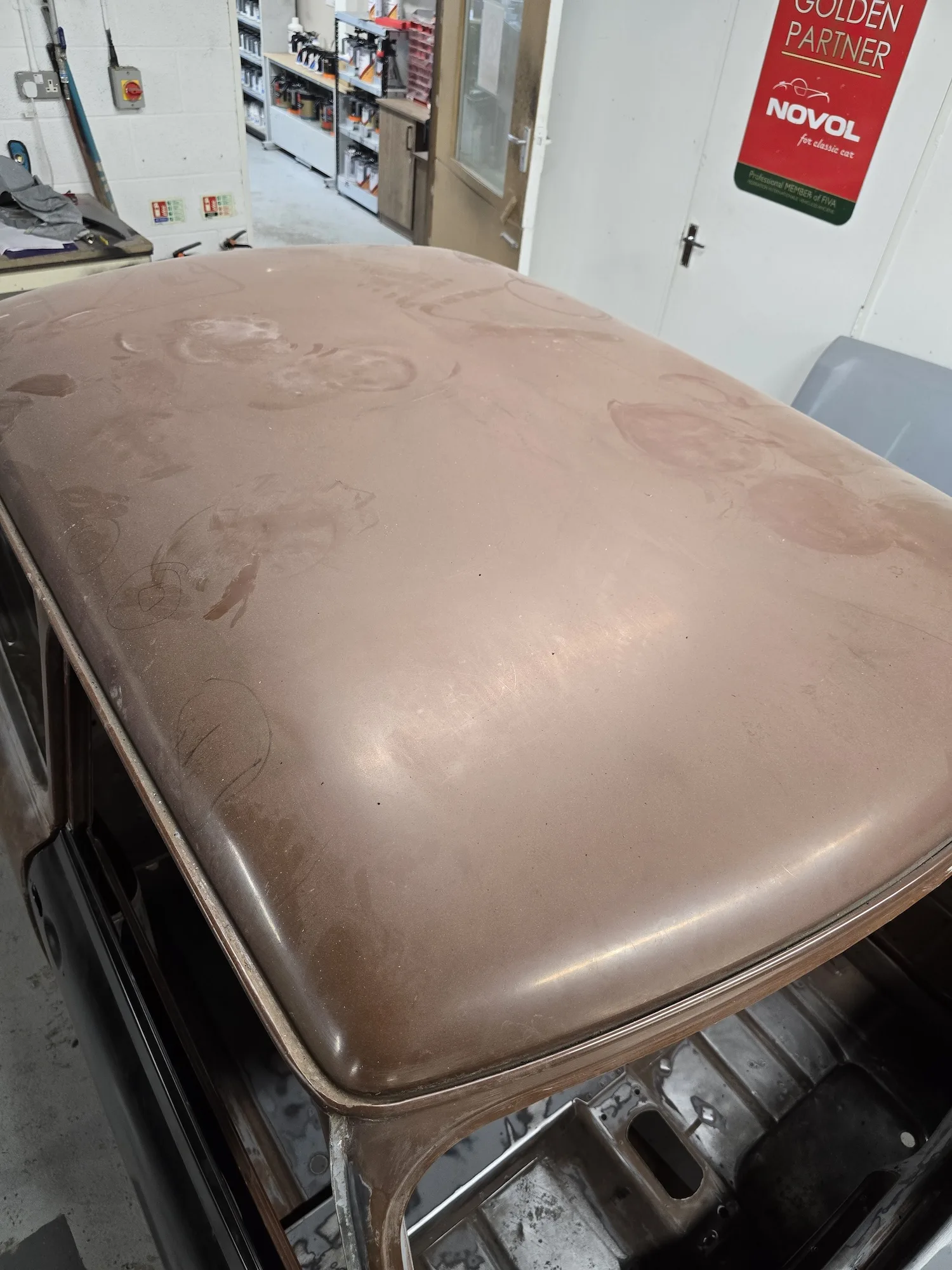 1st October 2025: The doors were test fitted, but the passenger side door in particular wasn’t lining up well with the front wing as it had previously been welded out of place. This was rectified by our fabricators in preparation for paint. The front end, bonnet, doors, roof and quarter panels were all stripped of their original paint and transport primer then sanded down. The inside was also prepped up ready for primer and paint. Both n/s and o/s doors, bonnet and bootlid were then prepped and Jenolite applied before a final sand and two coats of hybrid epoxy primer. Rust was found on the sill, backpanel and rear window, so these were all repaired.