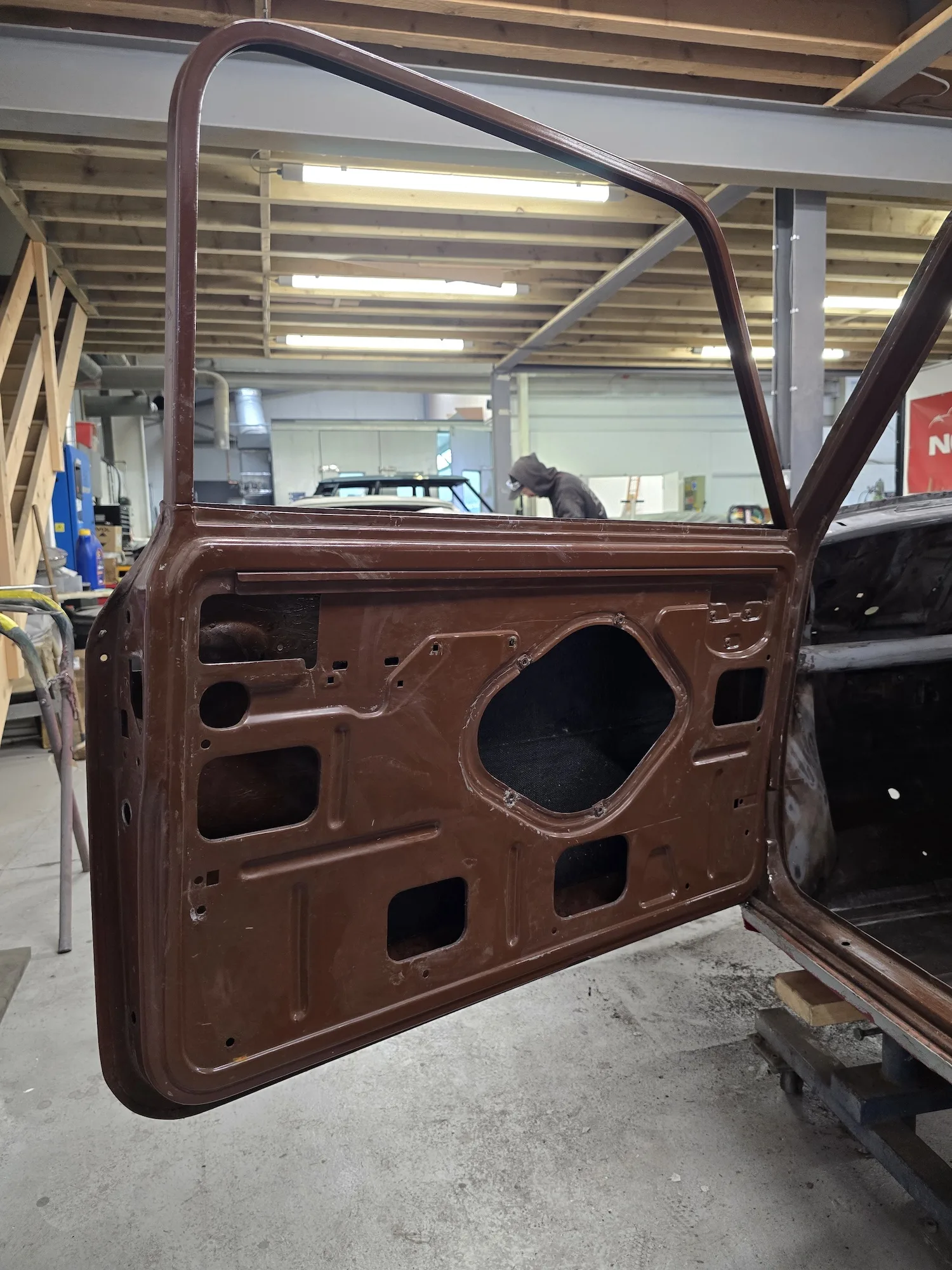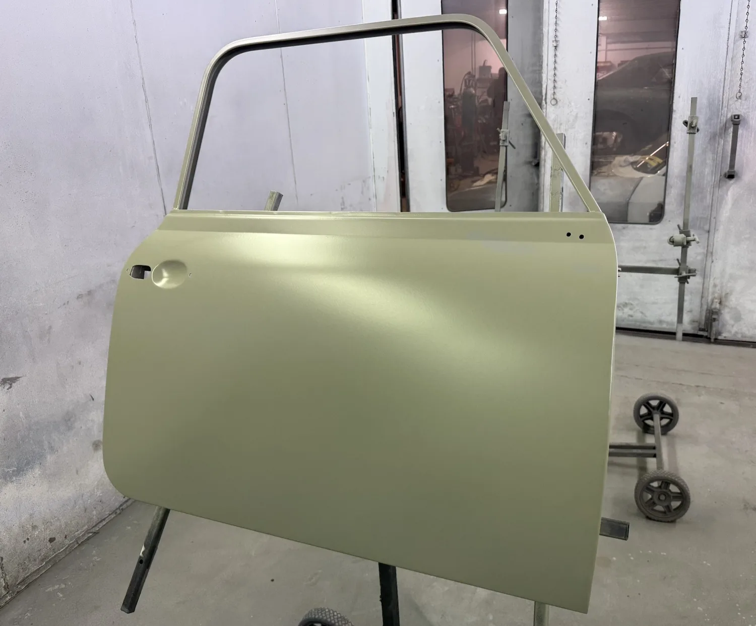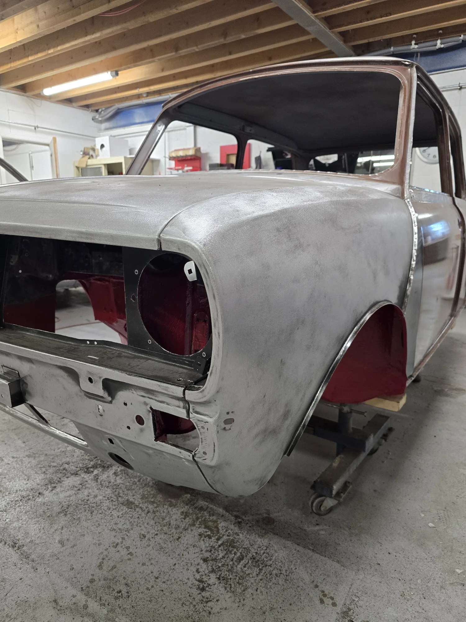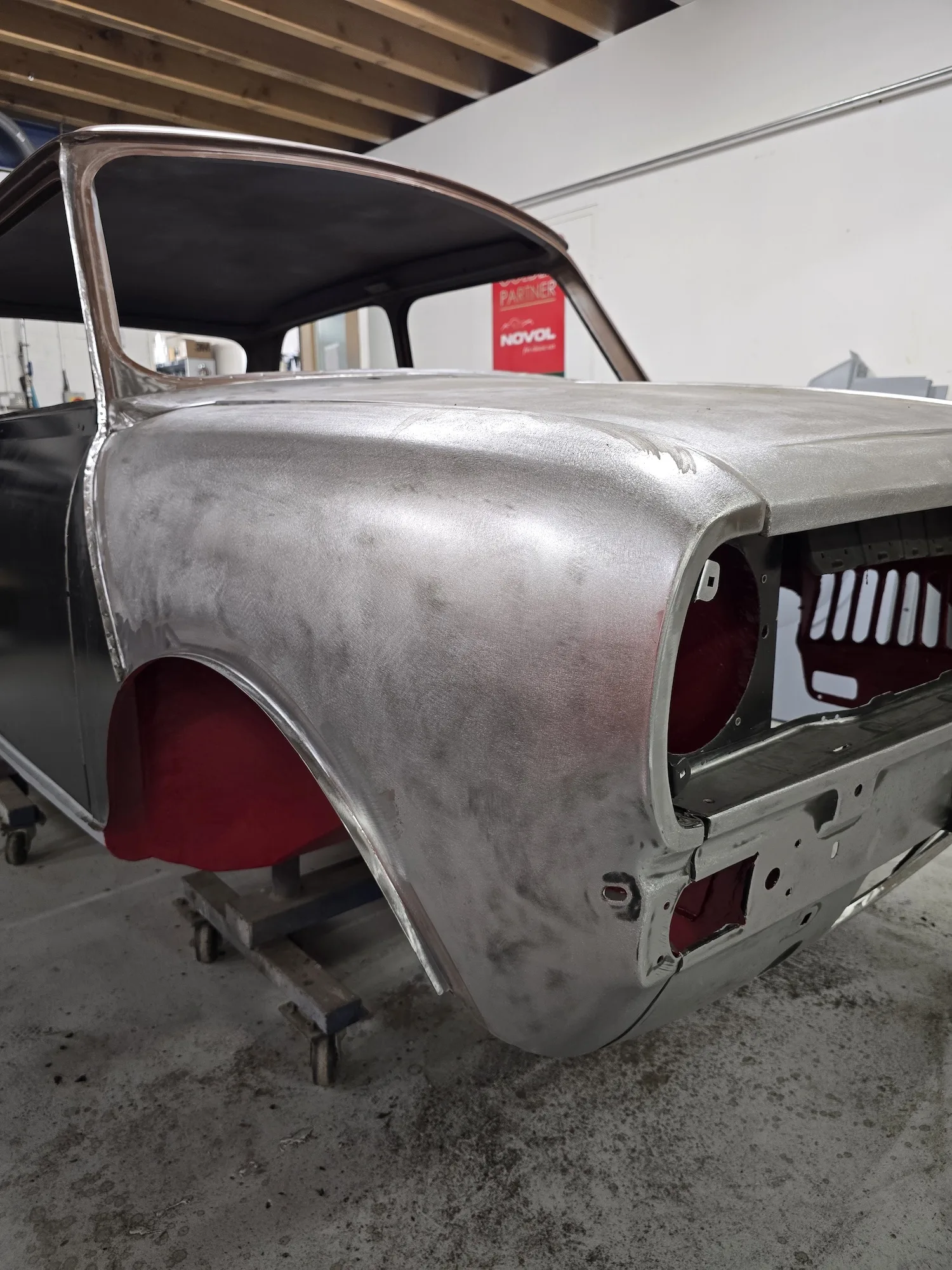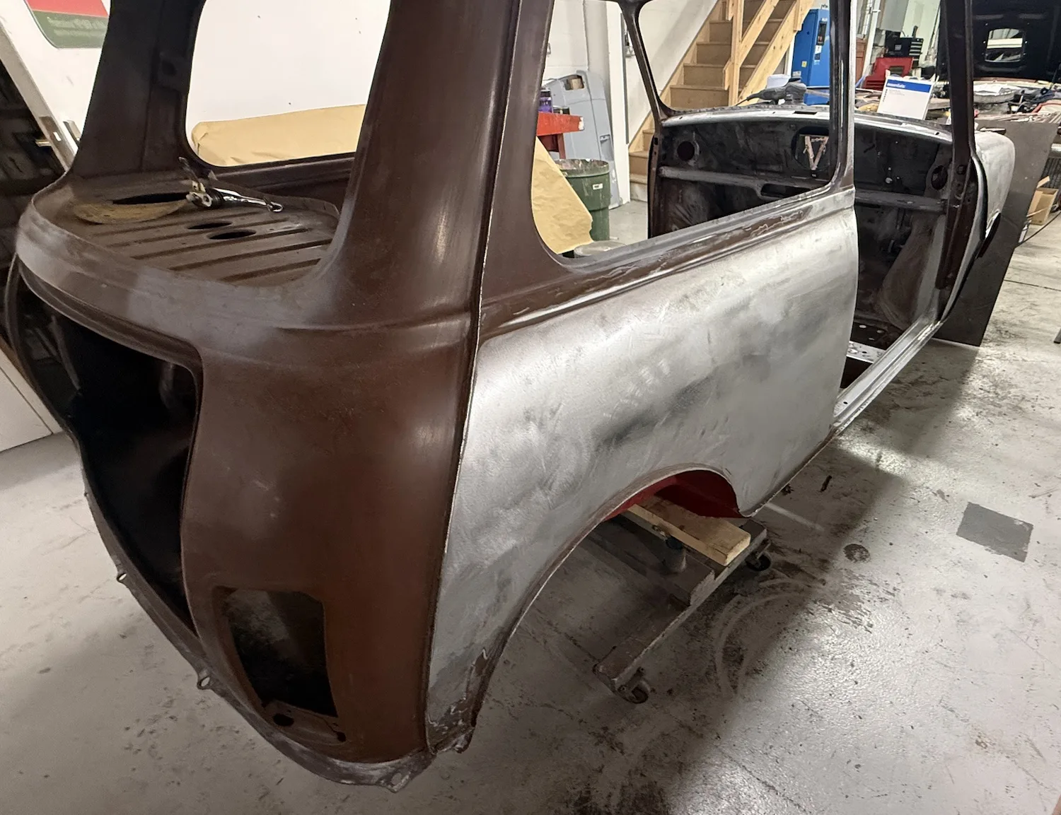 1st October 2025: The doors were test fitted, but the passenger side door in particular wasn’t lining up well with the front wing as it had previously been welded out of place. This was rectified by our fabricators in preparation for paint. The front end, bonnet, doors, roof and quarter panels were all stripped of their original paint and transport primer then sanded down. The inside was also prepped up ready for primer and paint. Both n/s and o/s doors, bonnet and bootlid were then prepped and Jenolite applied before a final sand and two coats of hybrid epoxy primer. Rust was found on the sill, backpanel and rear window, so these were all repaired.