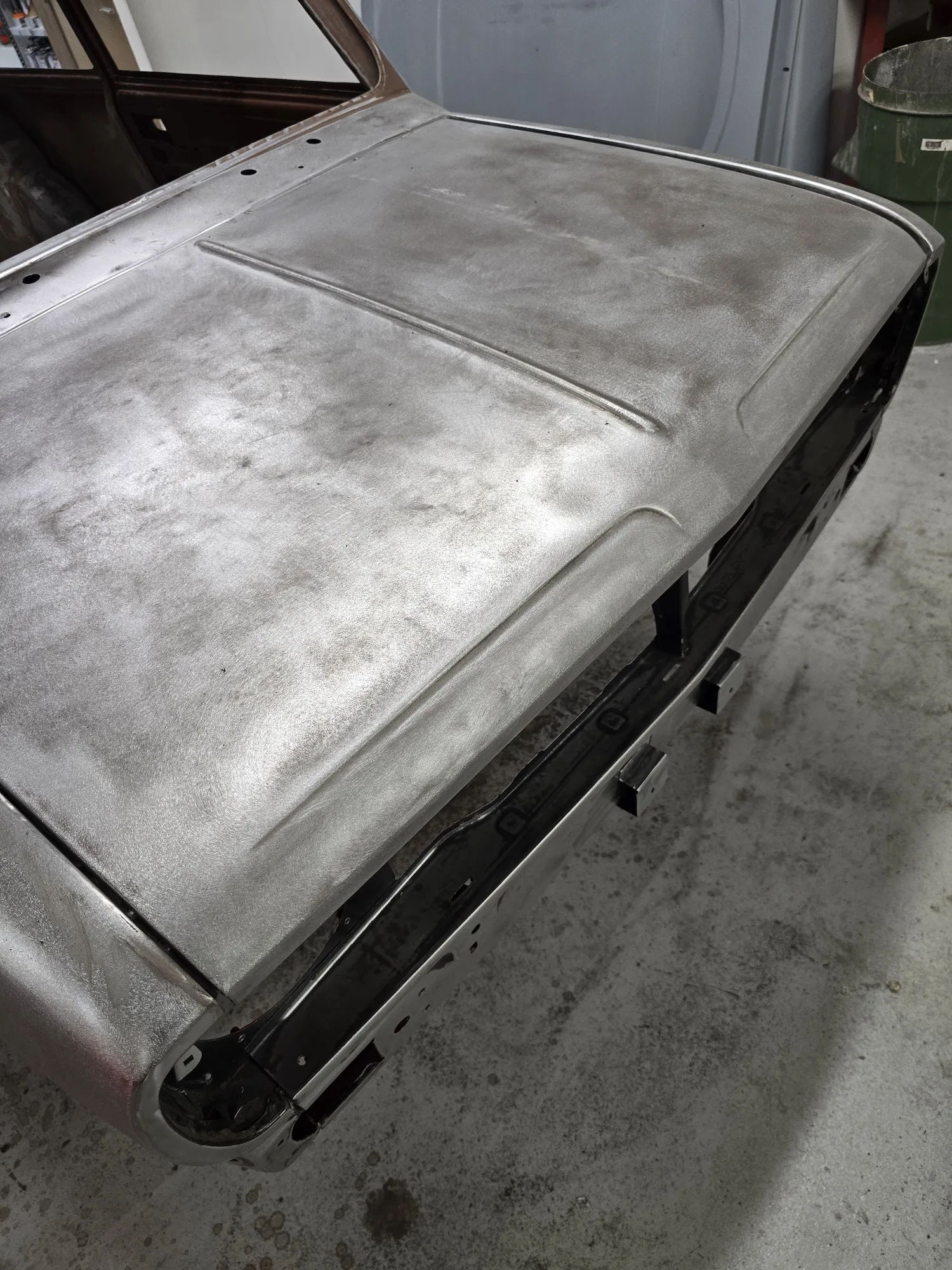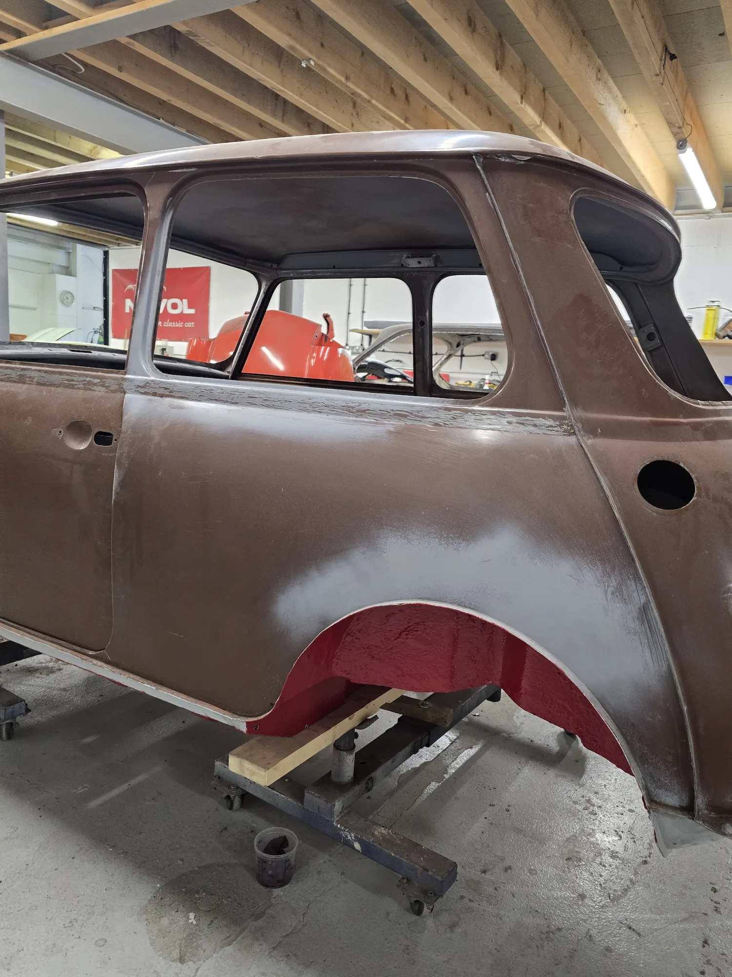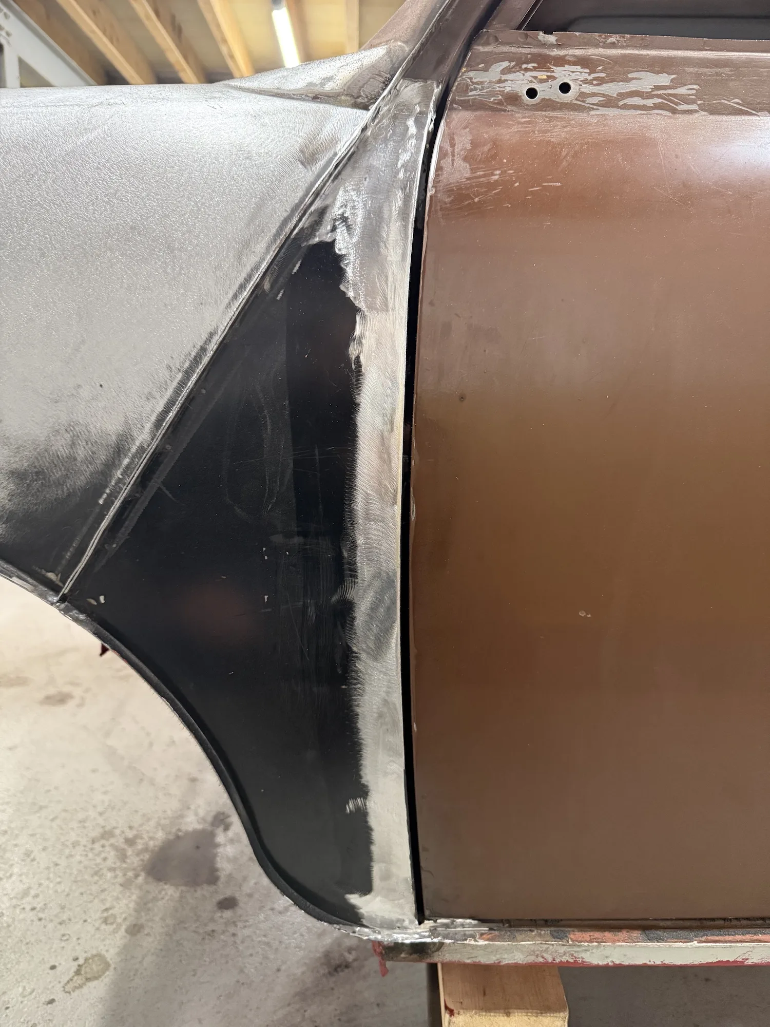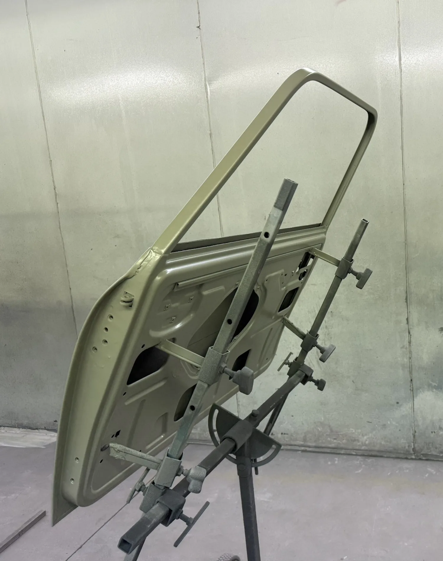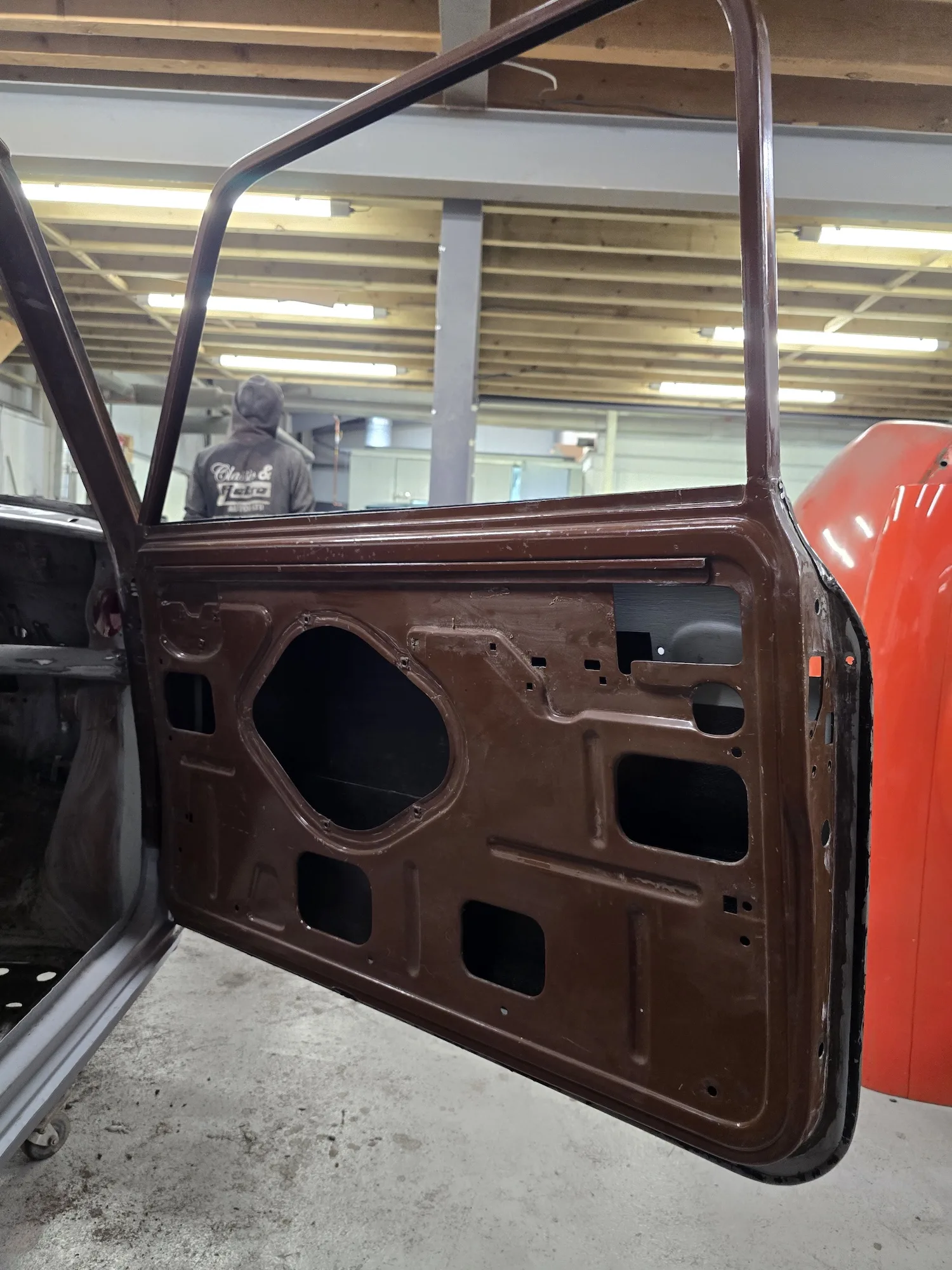 1st October 2025: The doors were test fitted, but the passenger side door in particular wasn’t lining up well with the front wing as it had previously been welded out of place. This was rectified by our fabricators in preparation for paint. The front end, bonnet, doors, roof and quarter panels were all stripped of their original paint and transport primer then sanded down. The inside was also prepped up ready for primer and paint. Both n/s and o/s doors, bonnet and bootlid were then prepped and Jenolite applied before a final sand and two coats of hybrid epoxy primer. Rust was found on the sill, backpanel and rear window, so these were all repaired.