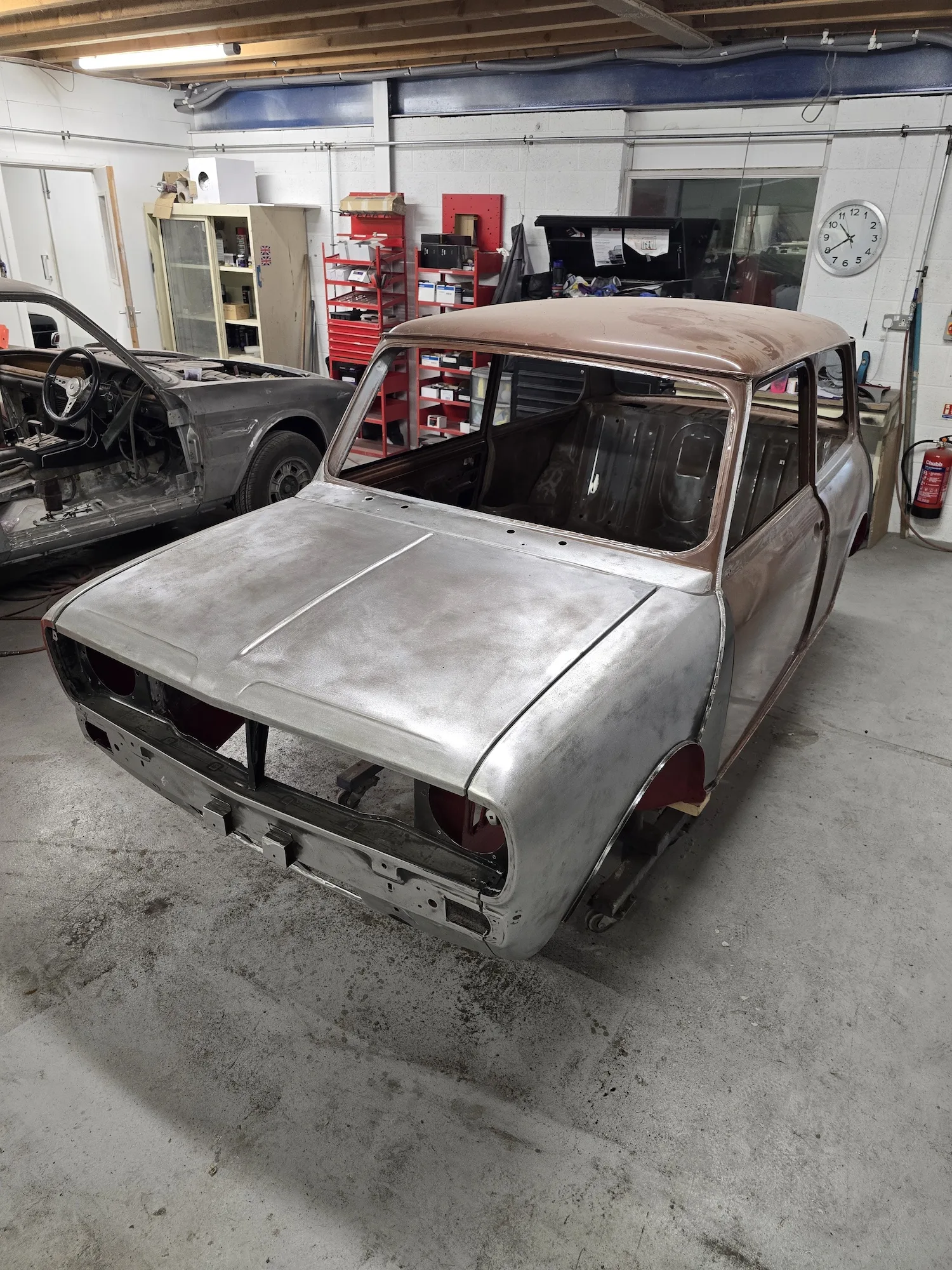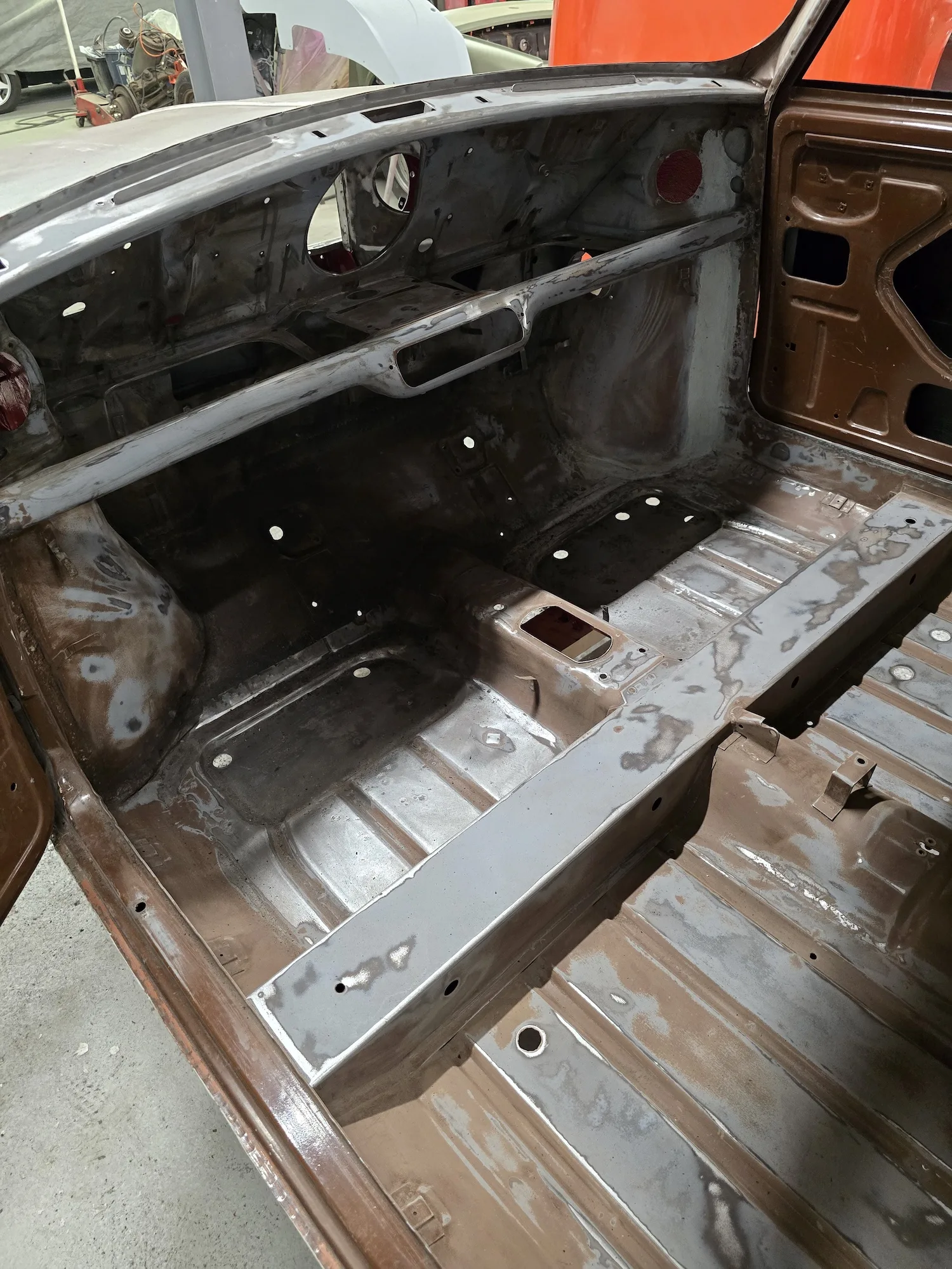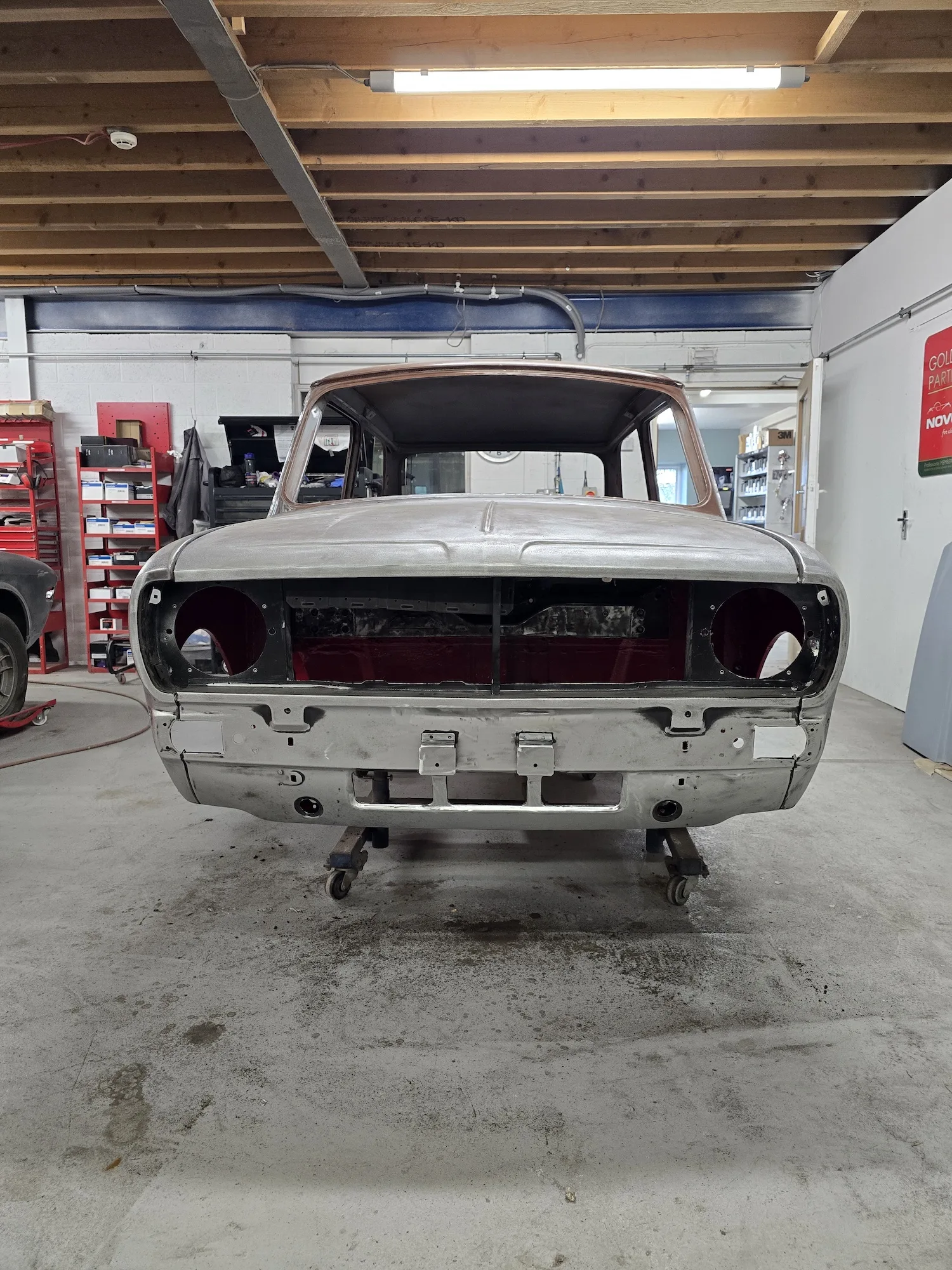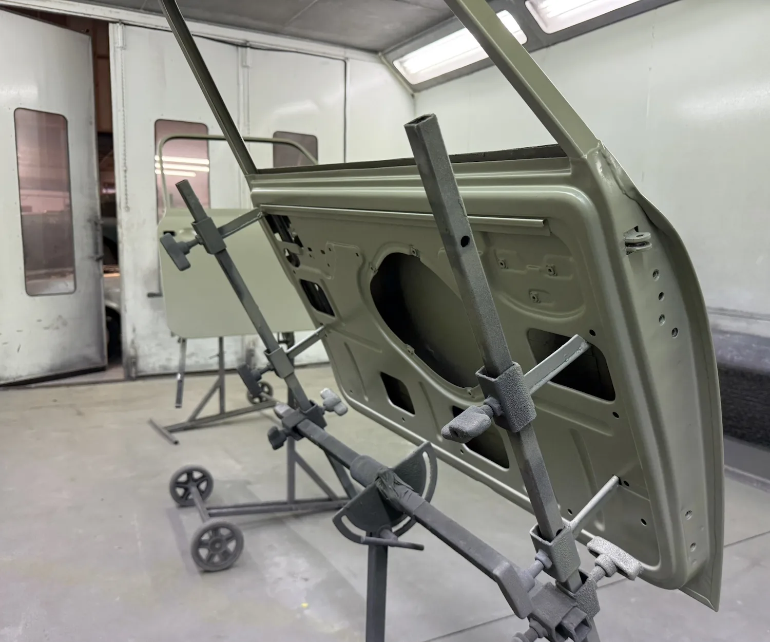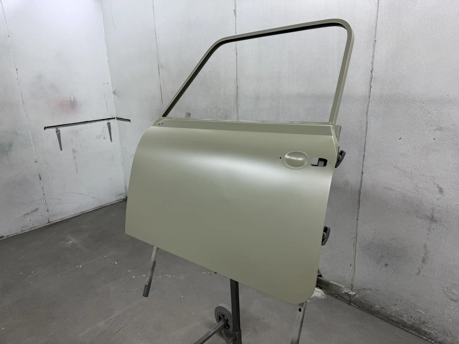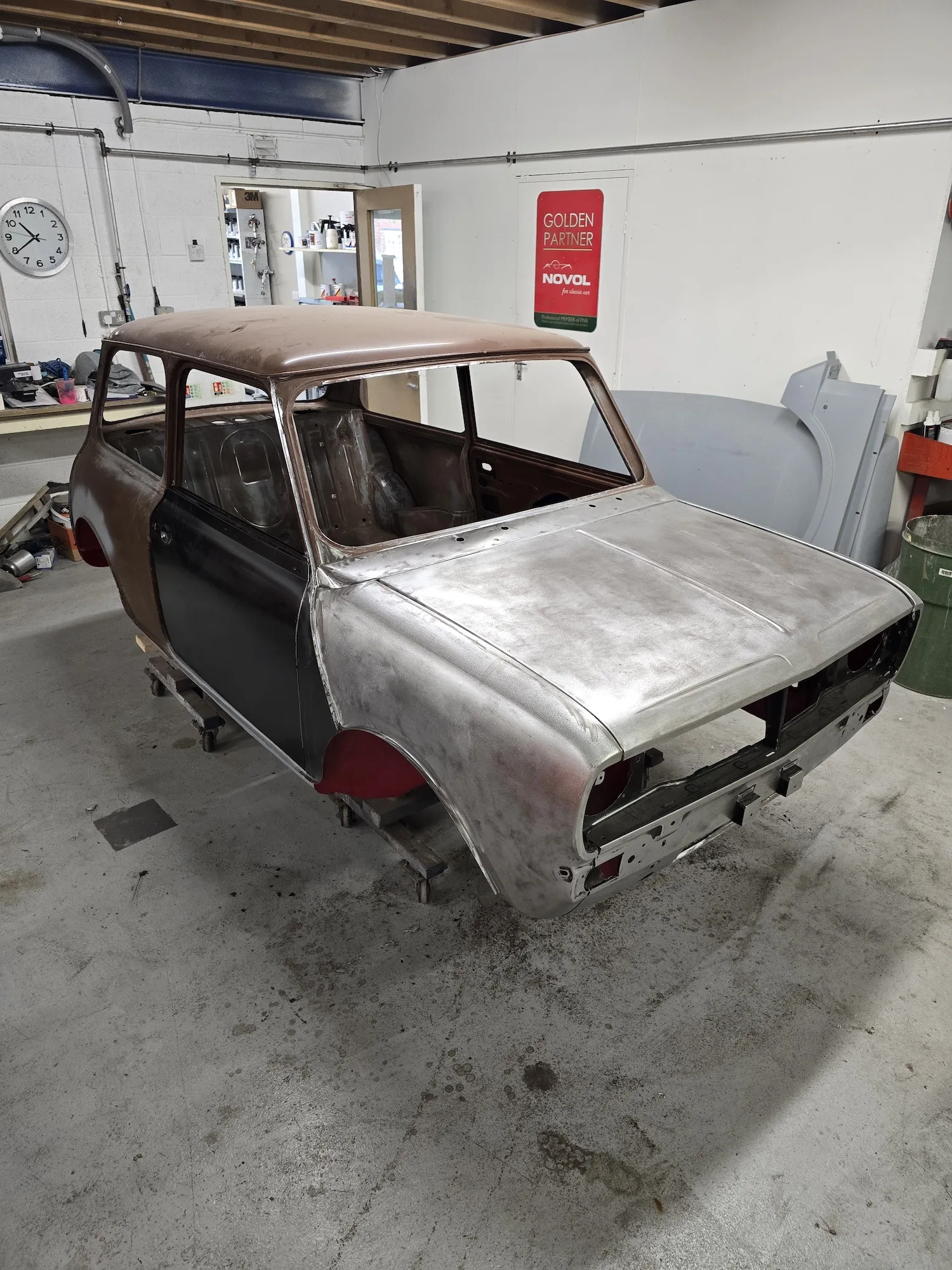 1st October 2025: The doors were test fitted, but the passenger side door in particular wasn’t lining up well with the front wing as it had previously been welded out of place. This was rectified by our fabricators in preparation for paint. The front end, bonnet, doors, roof and quarter panels were all stripped of their original paint and transport primer then sanded down. The inside was also prepped up ready for primer and paint. Both n/s and o/s doors, bonnet and bootlid were then prepped and Jenolite applied before a final sand and two coats of hybrid epoxy primer. Rust was found on the sill, backpanel and rear window, so these were all repaired.