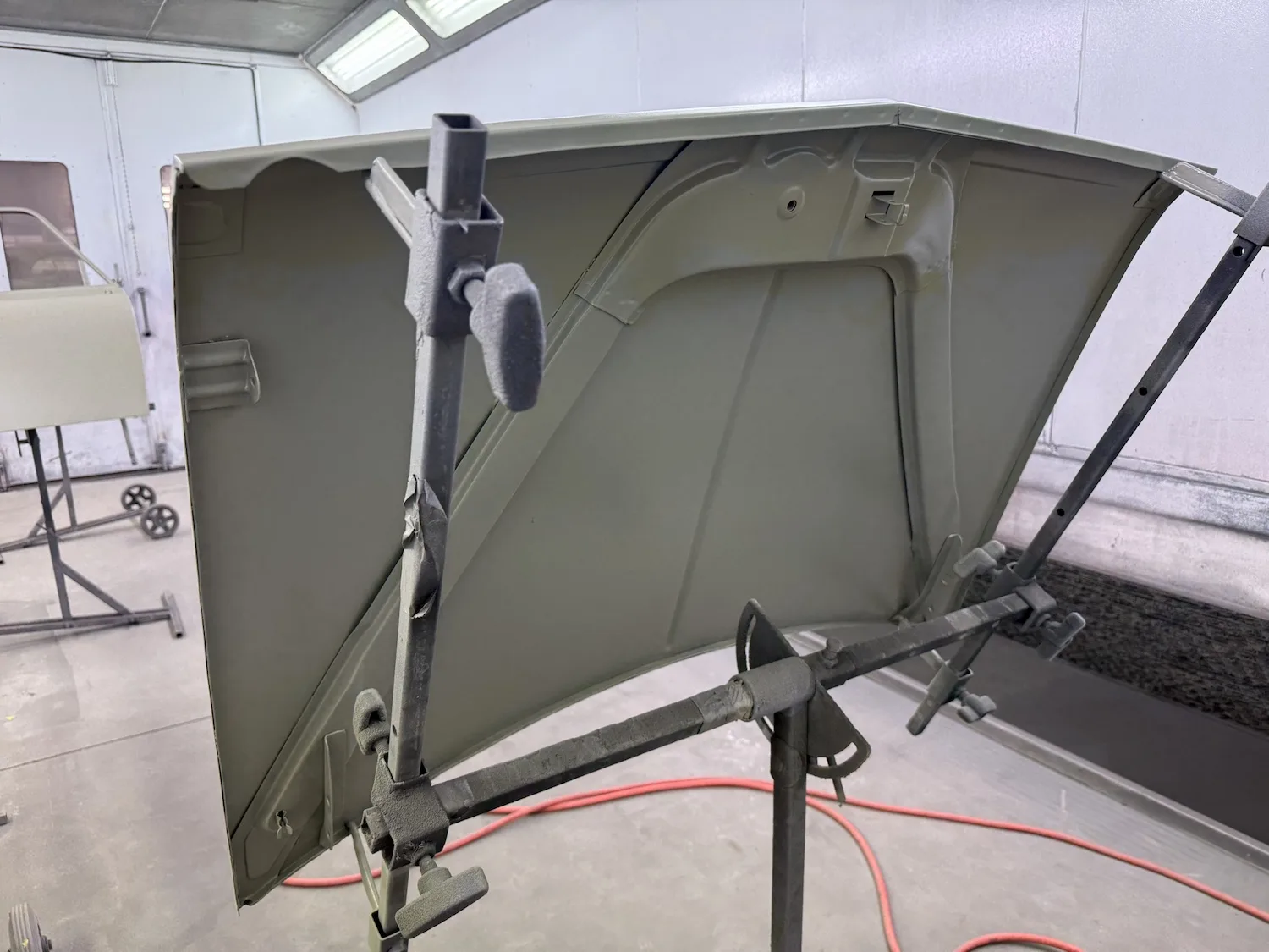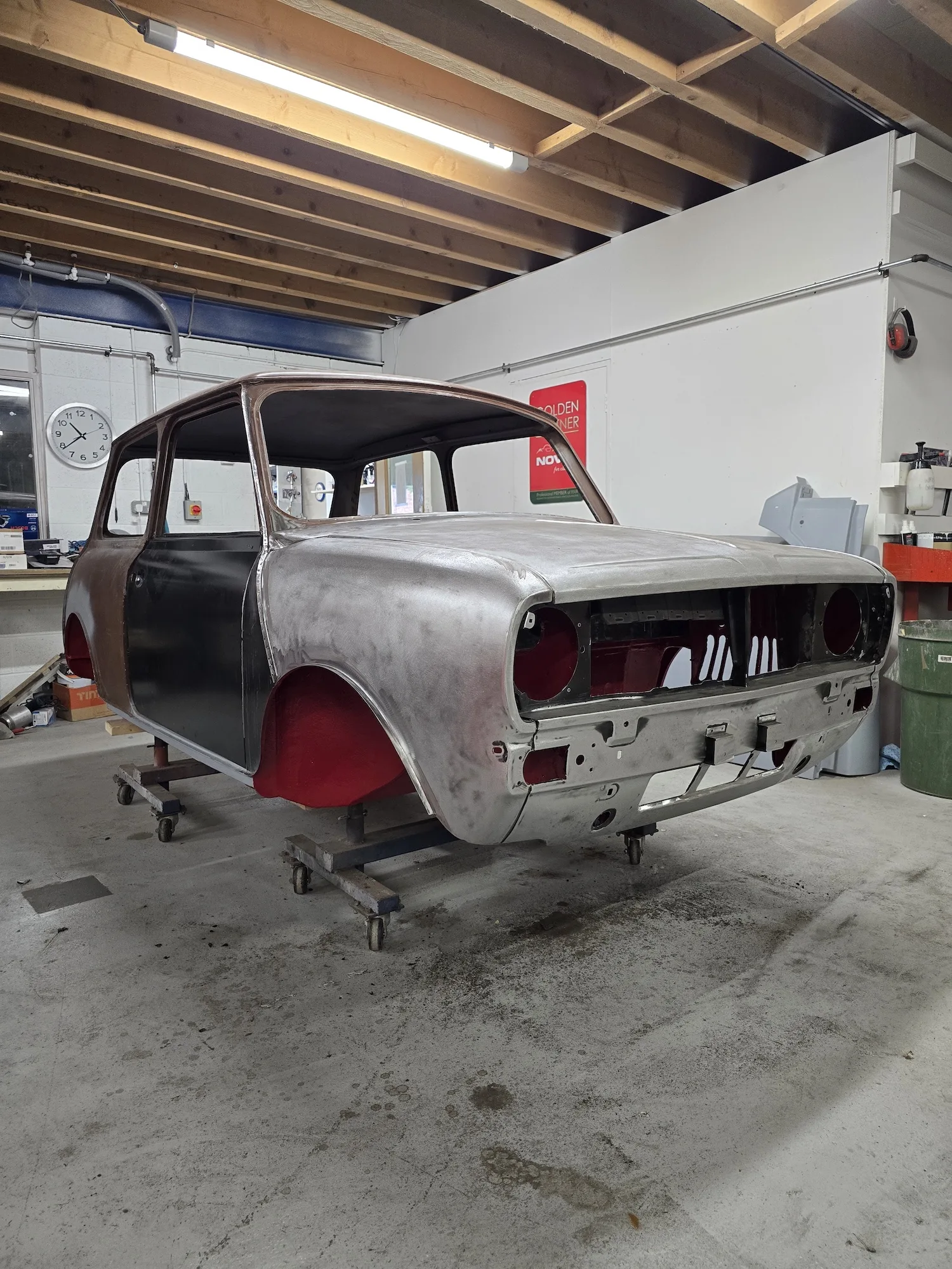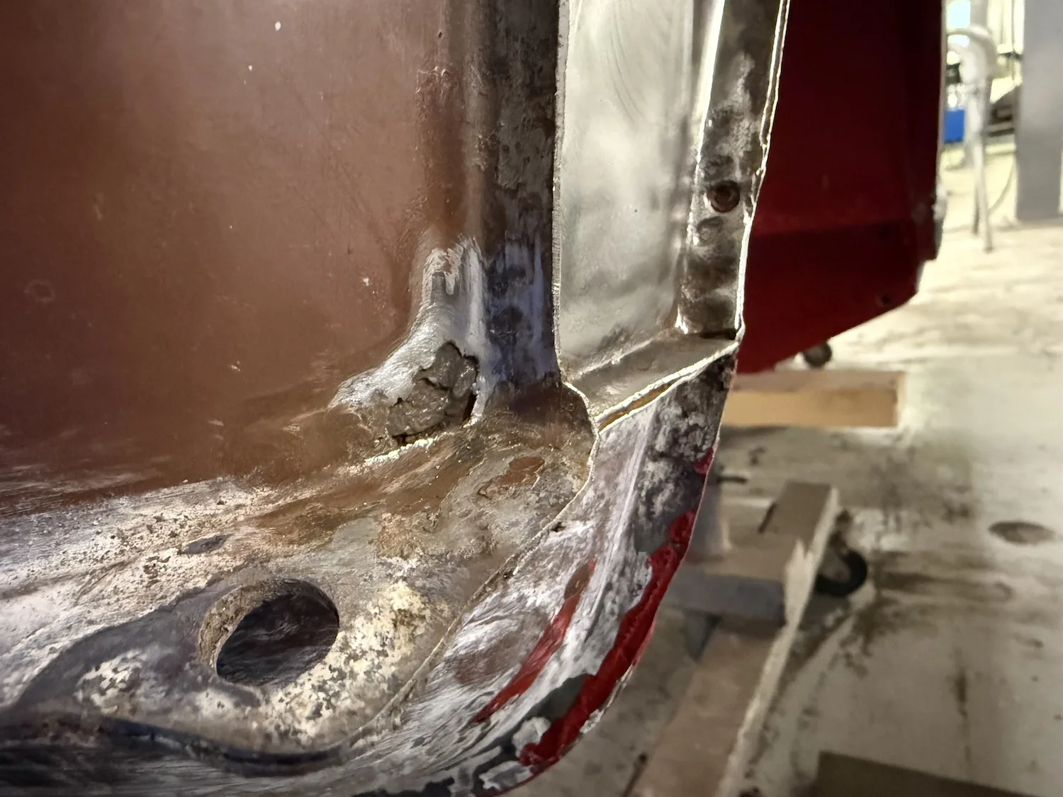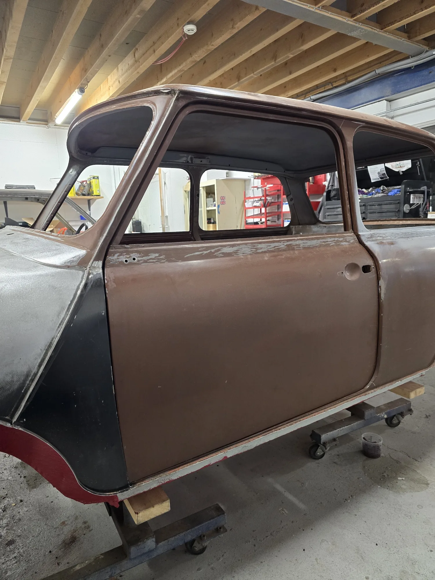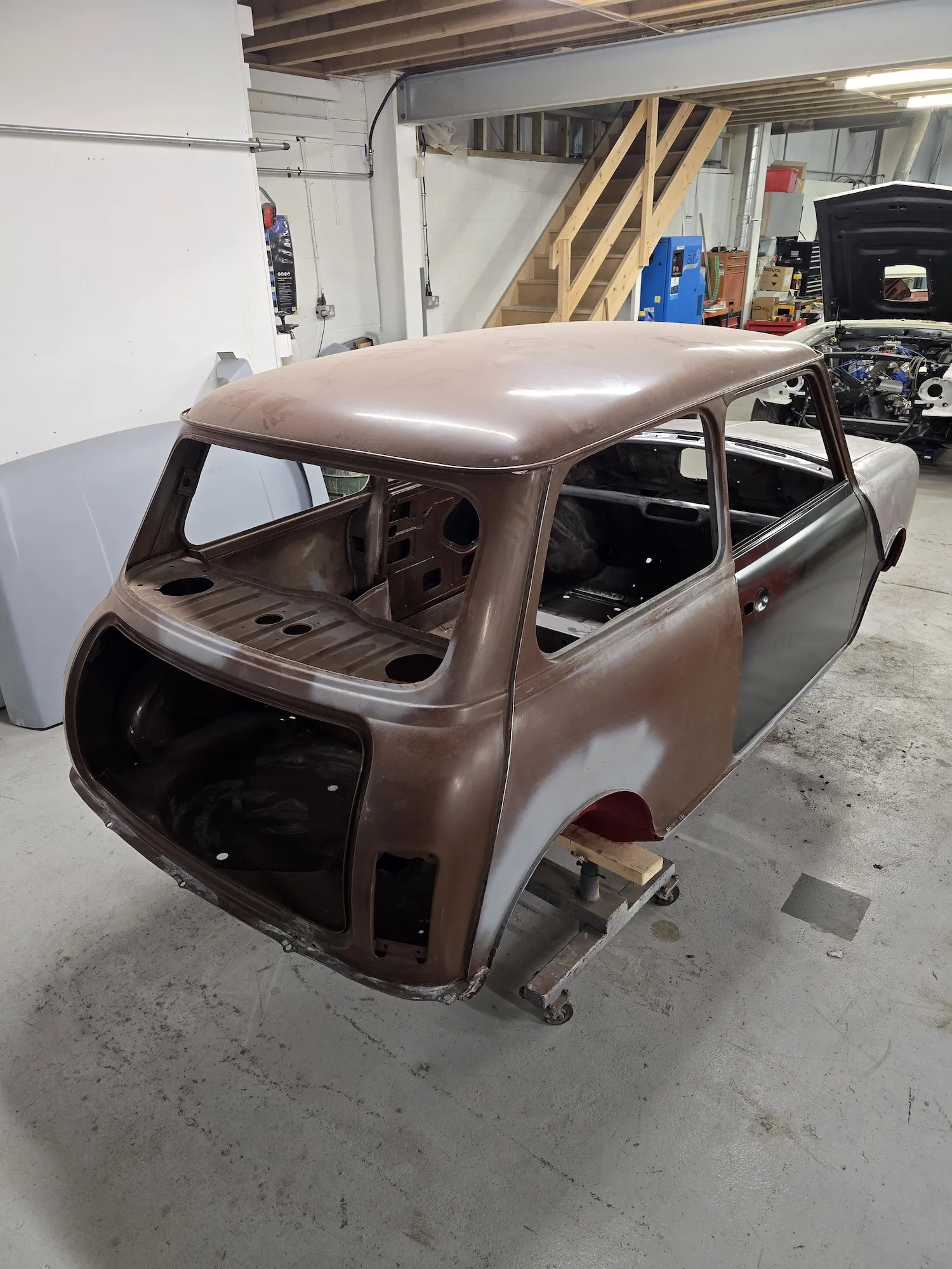 1st October 2025: The doors were test fitted, but the passenger side door in particular wasn’t lining up well with the front wing as it had previously been welded out of place. This was rectified by our fabricators in preparation for paint. The front end, bonnet, doors, roof and quarter panels were all stripped of their original paint and transport primer then sanded down. The inside was also prepped up ready for primer and paint. Both n/s and o/s doors, bonnet and bootlid were then prepped and Jenolite applied before a final sand and two coats of hybrid epoxy primer. Rust was found on the sill, backpanel and rear window, so these were all repaired.
