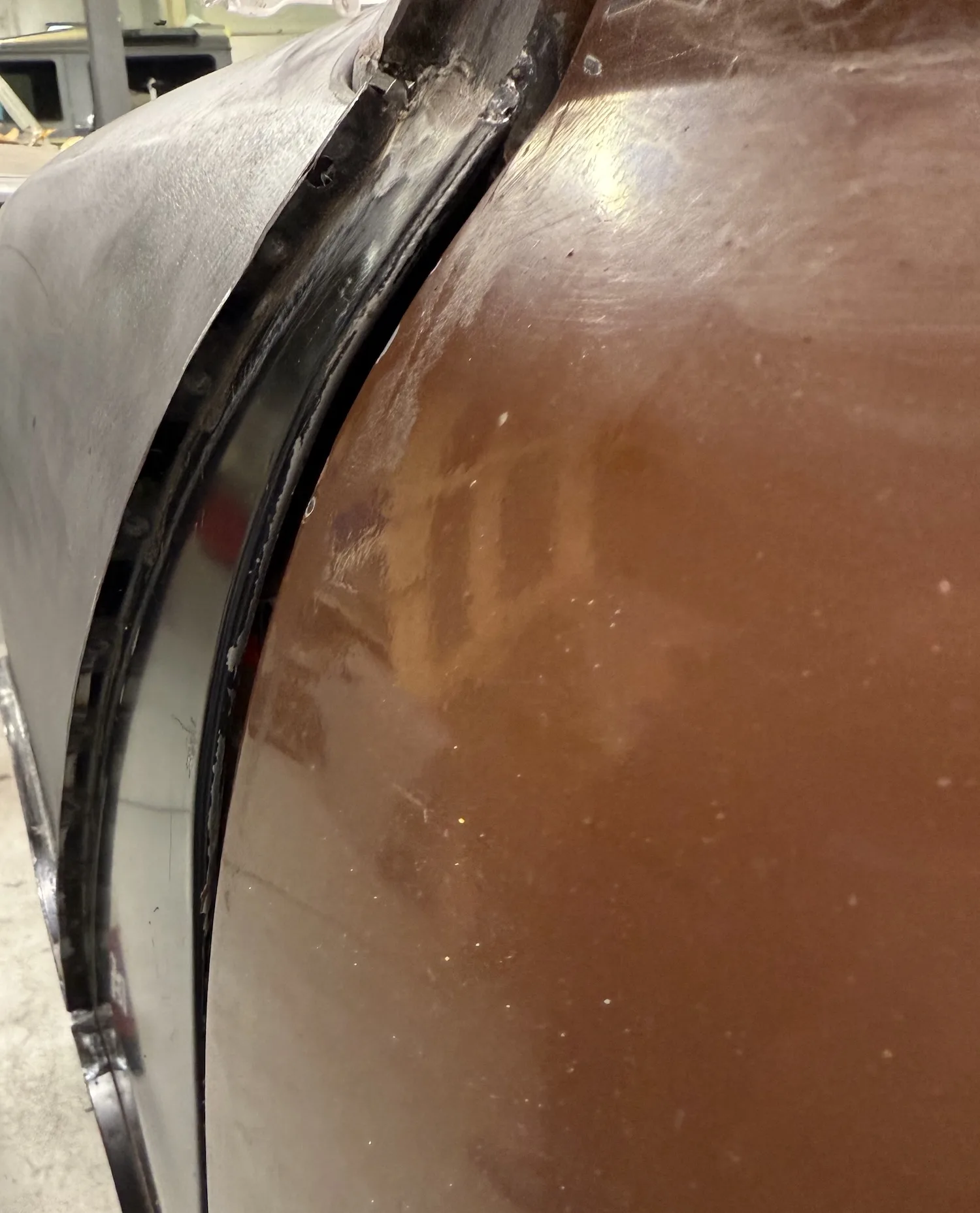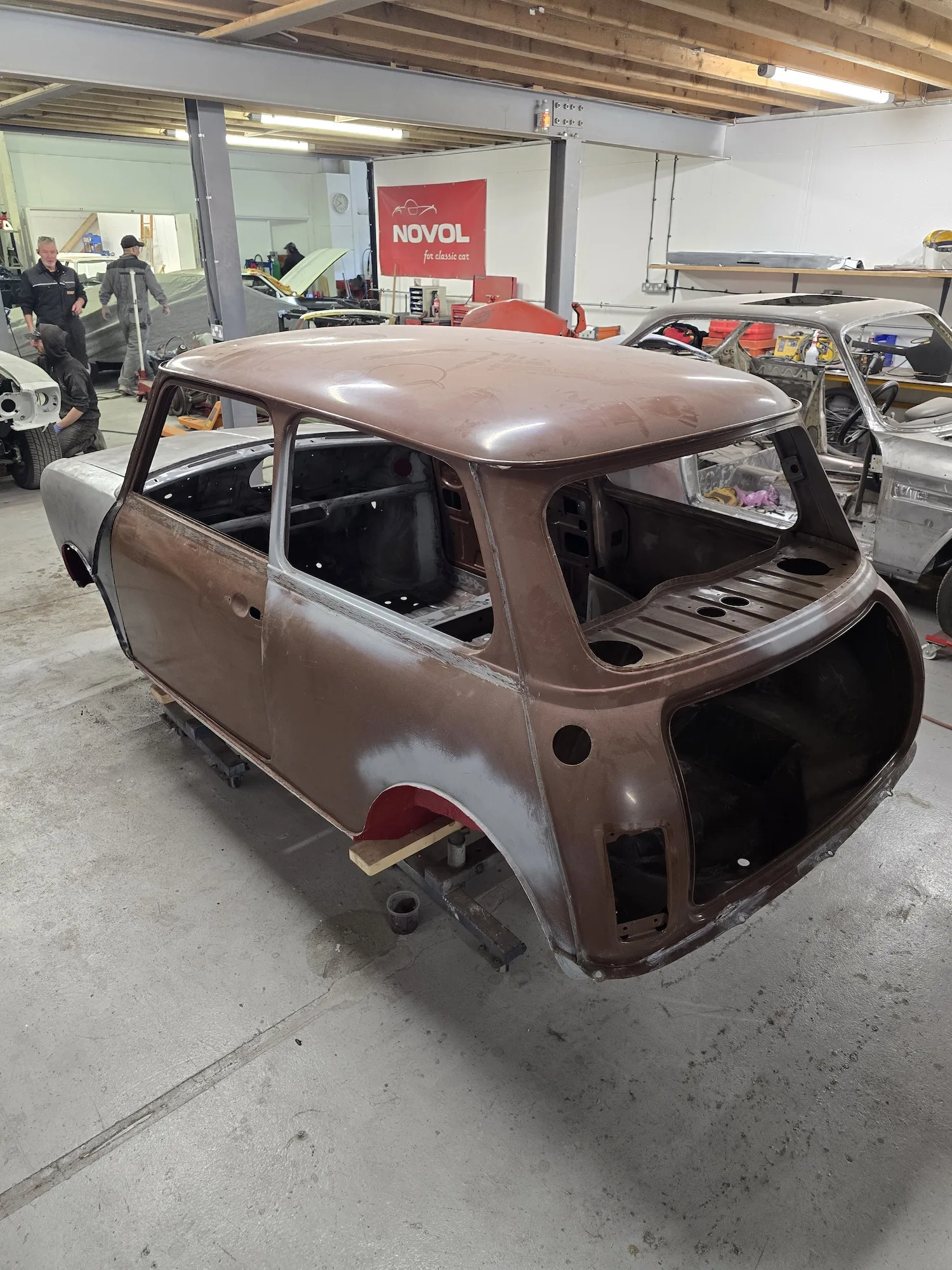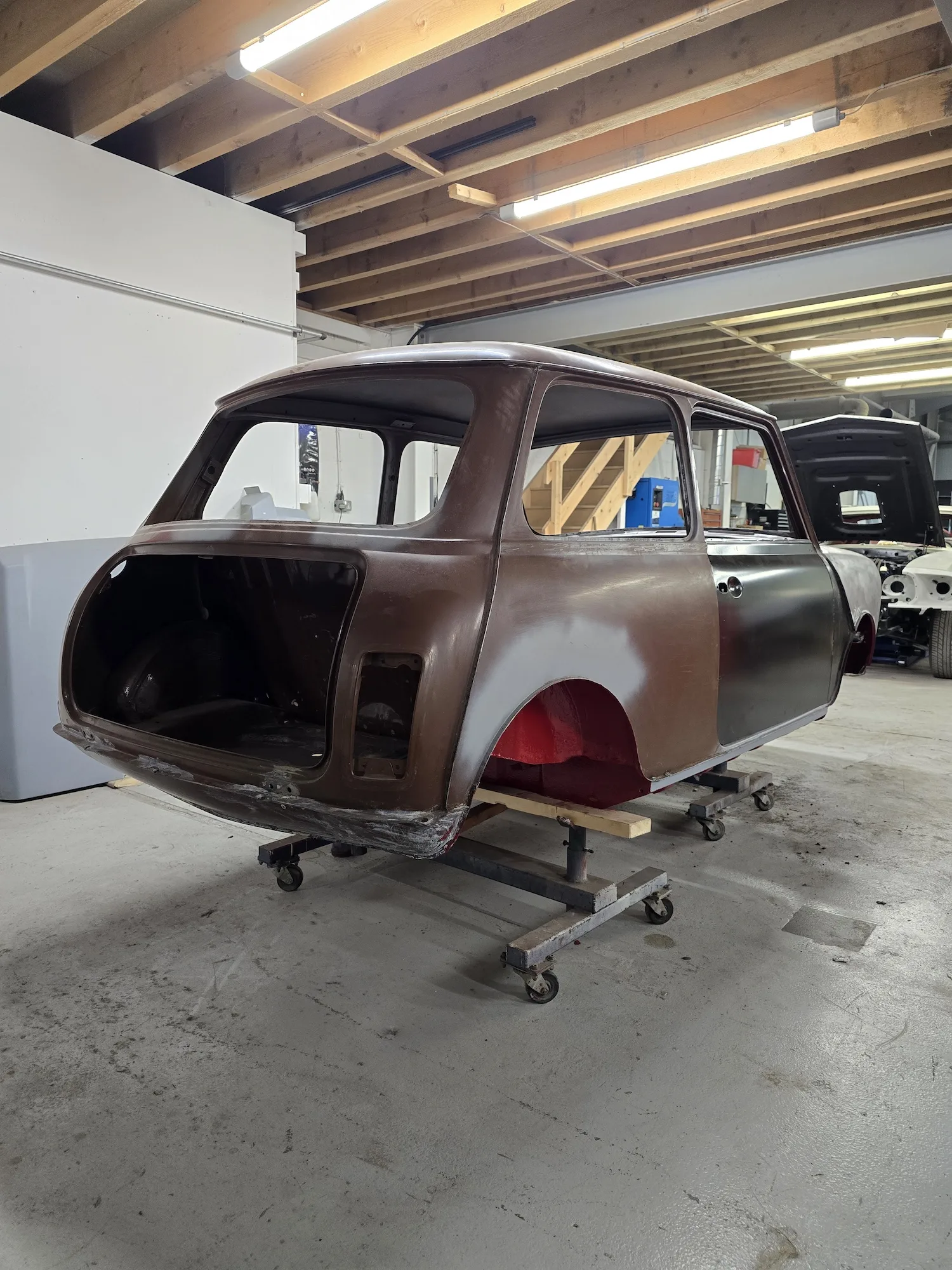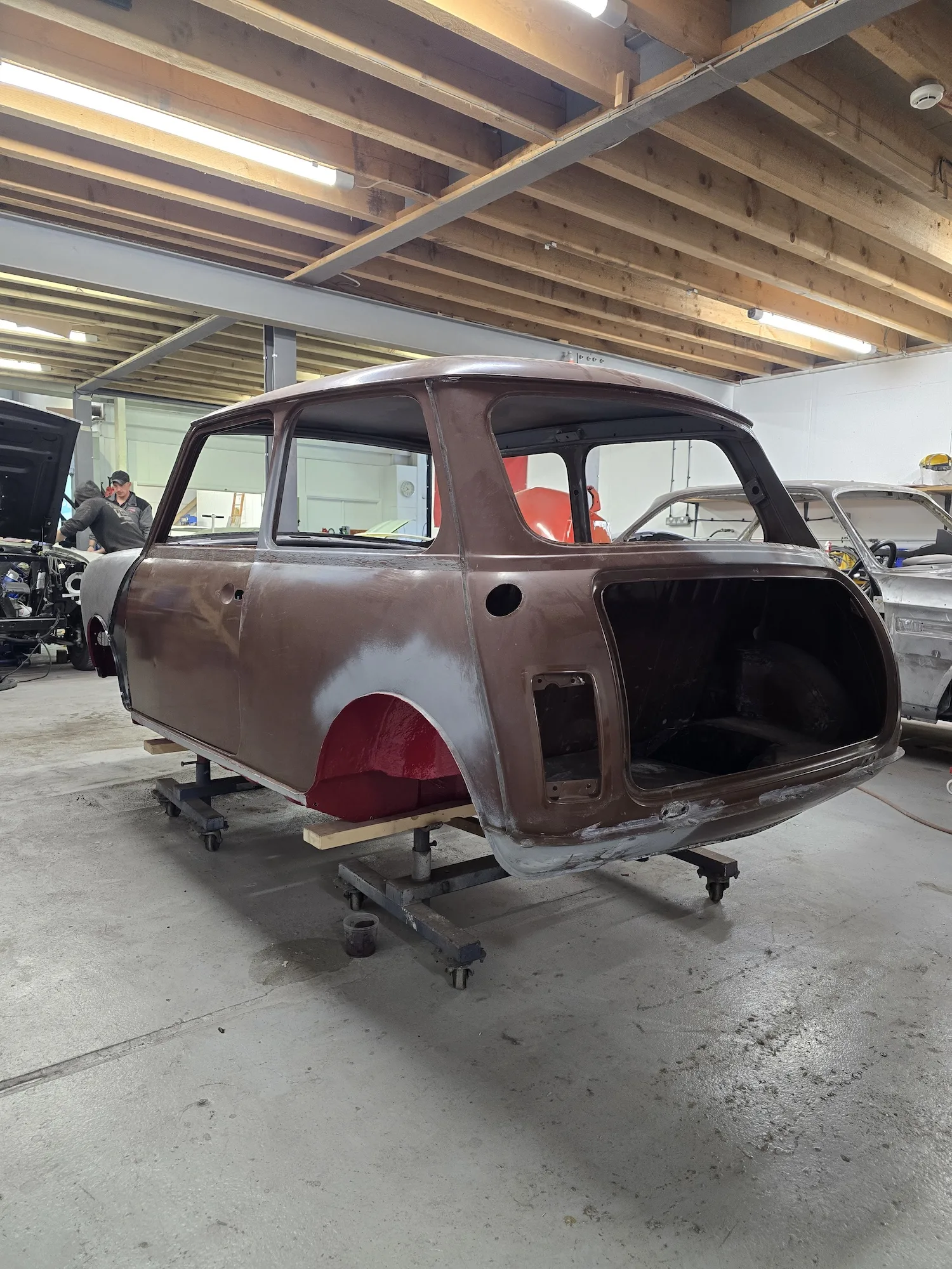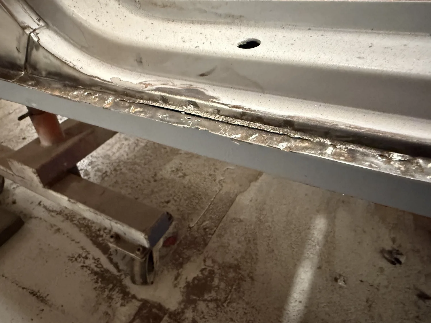 1st October 2025: The doors were test fitted, but the passenger side door in particular wasn’t lining up well with the front wing as it had previously been welded out of place. This was rectified by our fabricators in preparation for paint. The front end, bonnet, doors, roof and quarter panels were all stripped of their original paint and transport primer then sanded down. The inside was also prepped up ready for primer and paint. Both n/s and o/s doors, bonnet and bootlid were then prepped and Jenolite applied before a final sand and two coats of hybrid epoxy primer. Rust was found on the sill, backpanel and rear window, so these were all repaired.