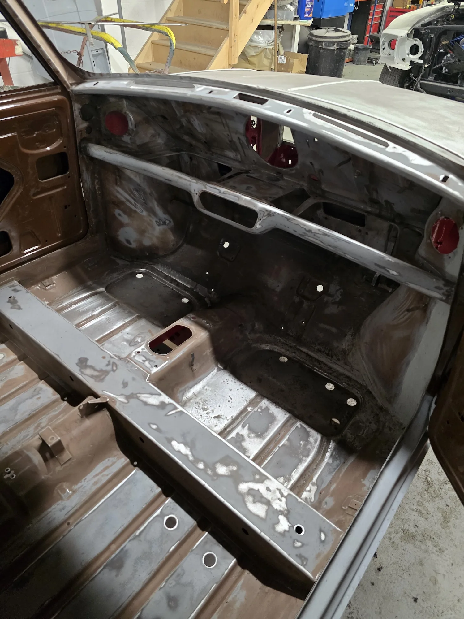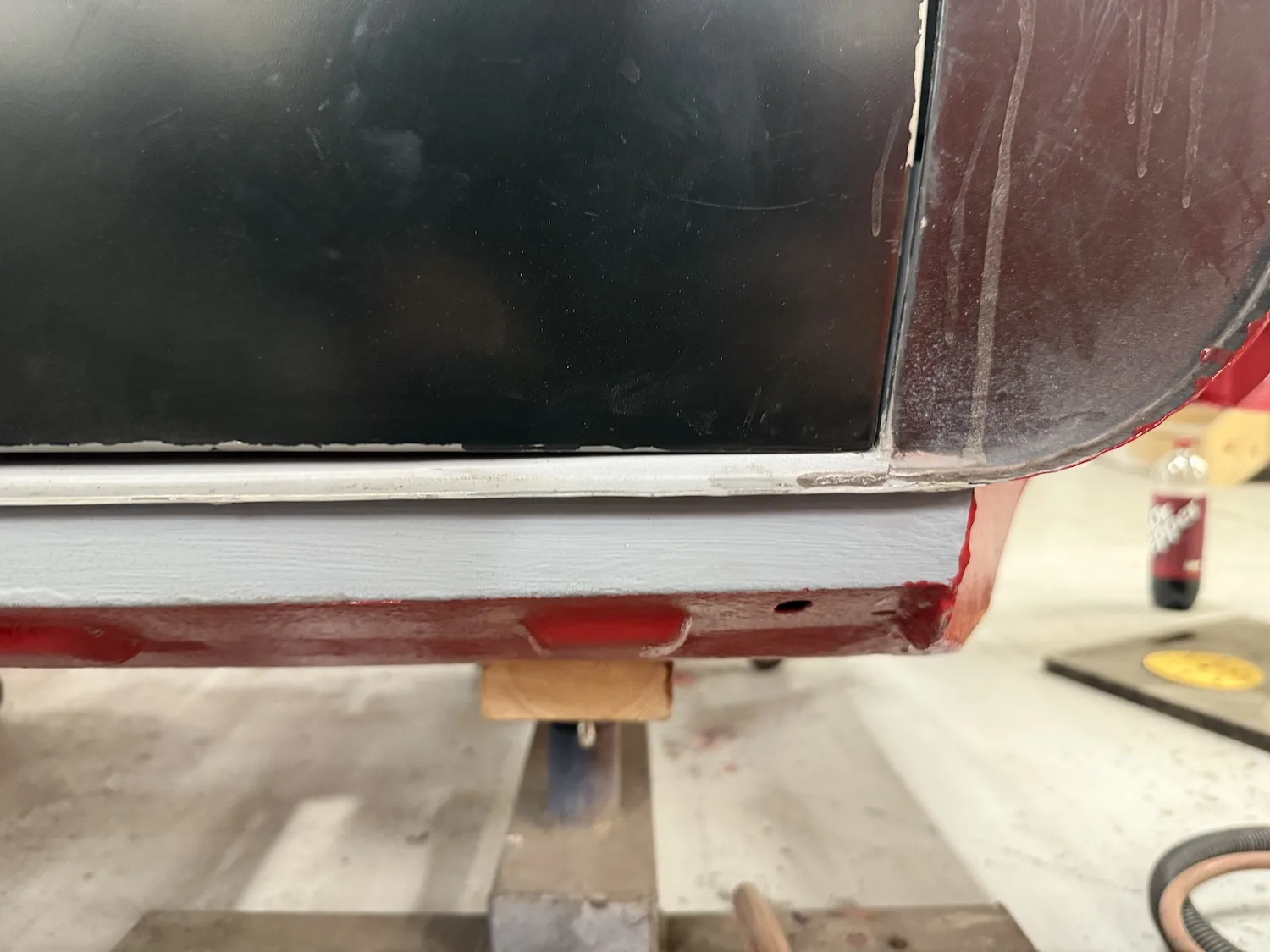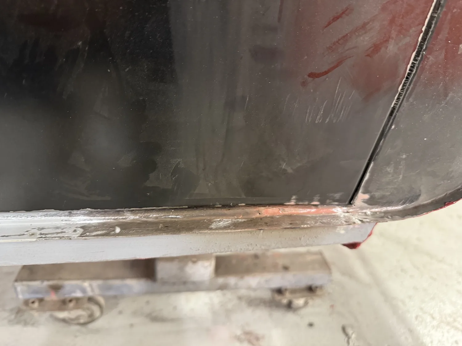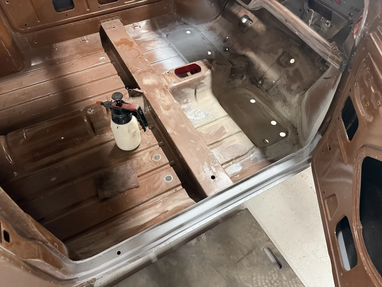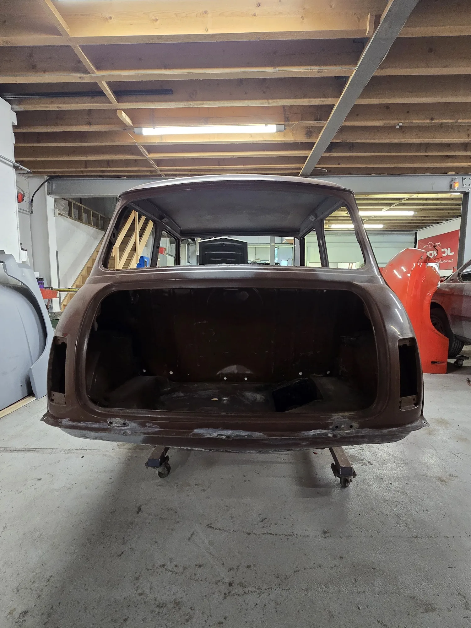 1st October 2025: The doors were test fitted, but the passenger side door in particular wasn’t lining up well with the front wing as it had previously been welded out of place. This was rectified by our fabricators in preparation for paint. The front end, bonnet, doors, roof and quarter panels were all stripped of their original paint and transport primer then sanded down. The inside was also prepped up ready for primer and paint. Both n/s and o/s doors, bonnet and bootlid were then prepped and Jenolite applied before a final sand and two coats of hybrid epoxy primer. Rust was found on the sill, backpanel and rear window, so these were all repaired.