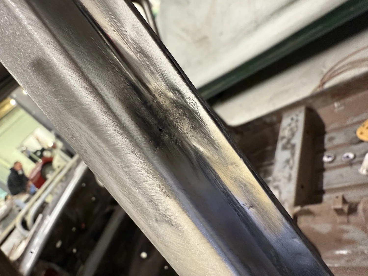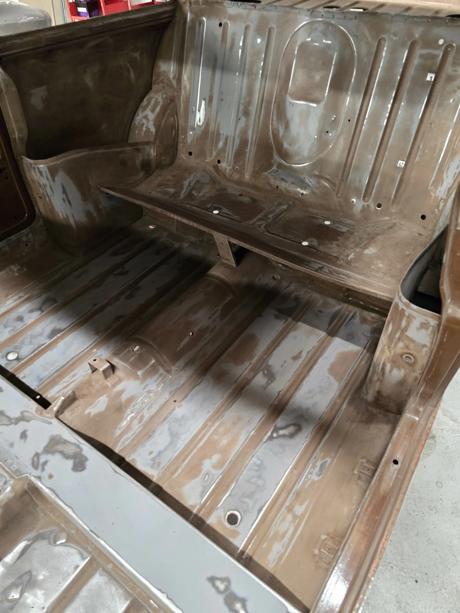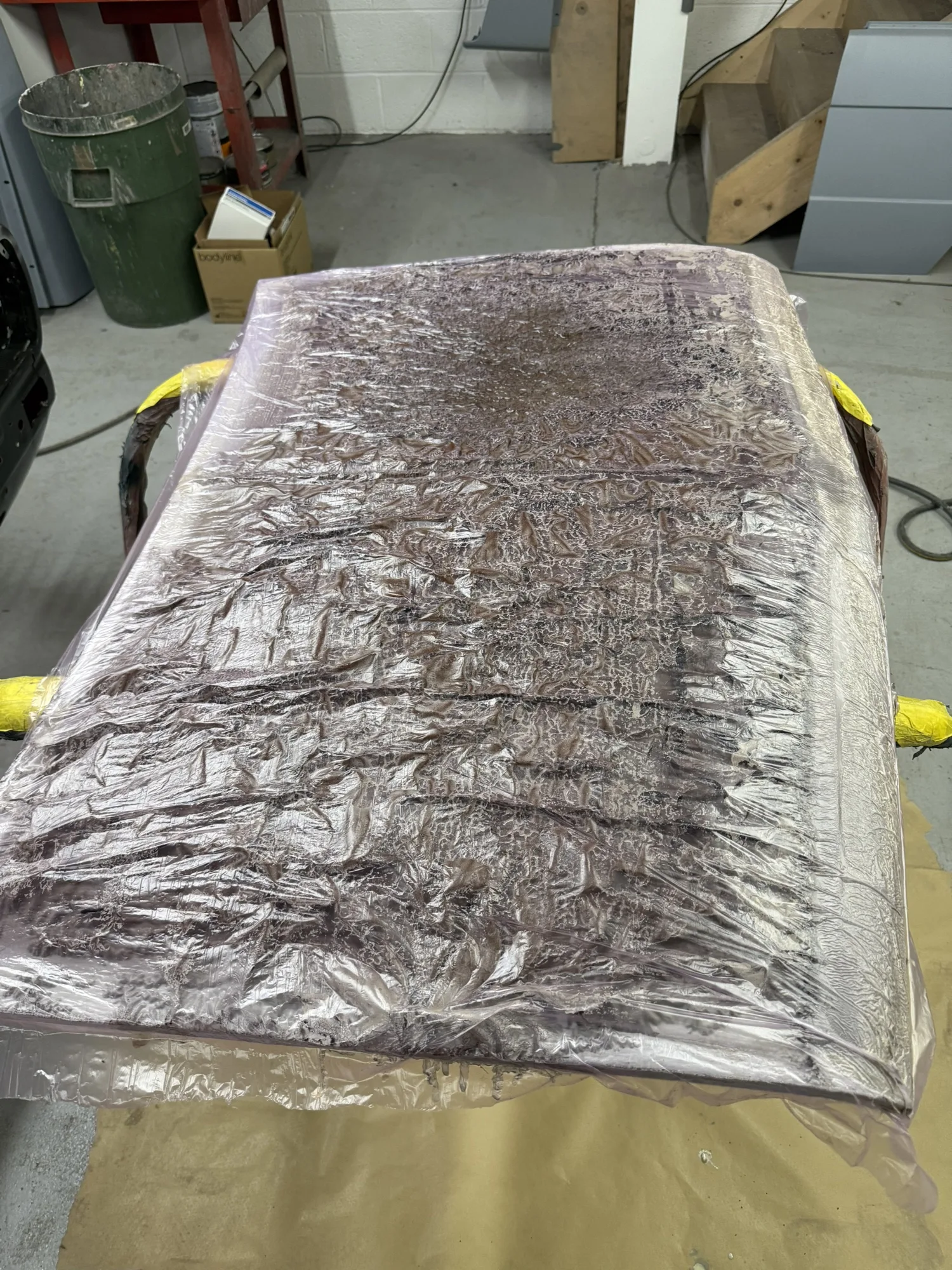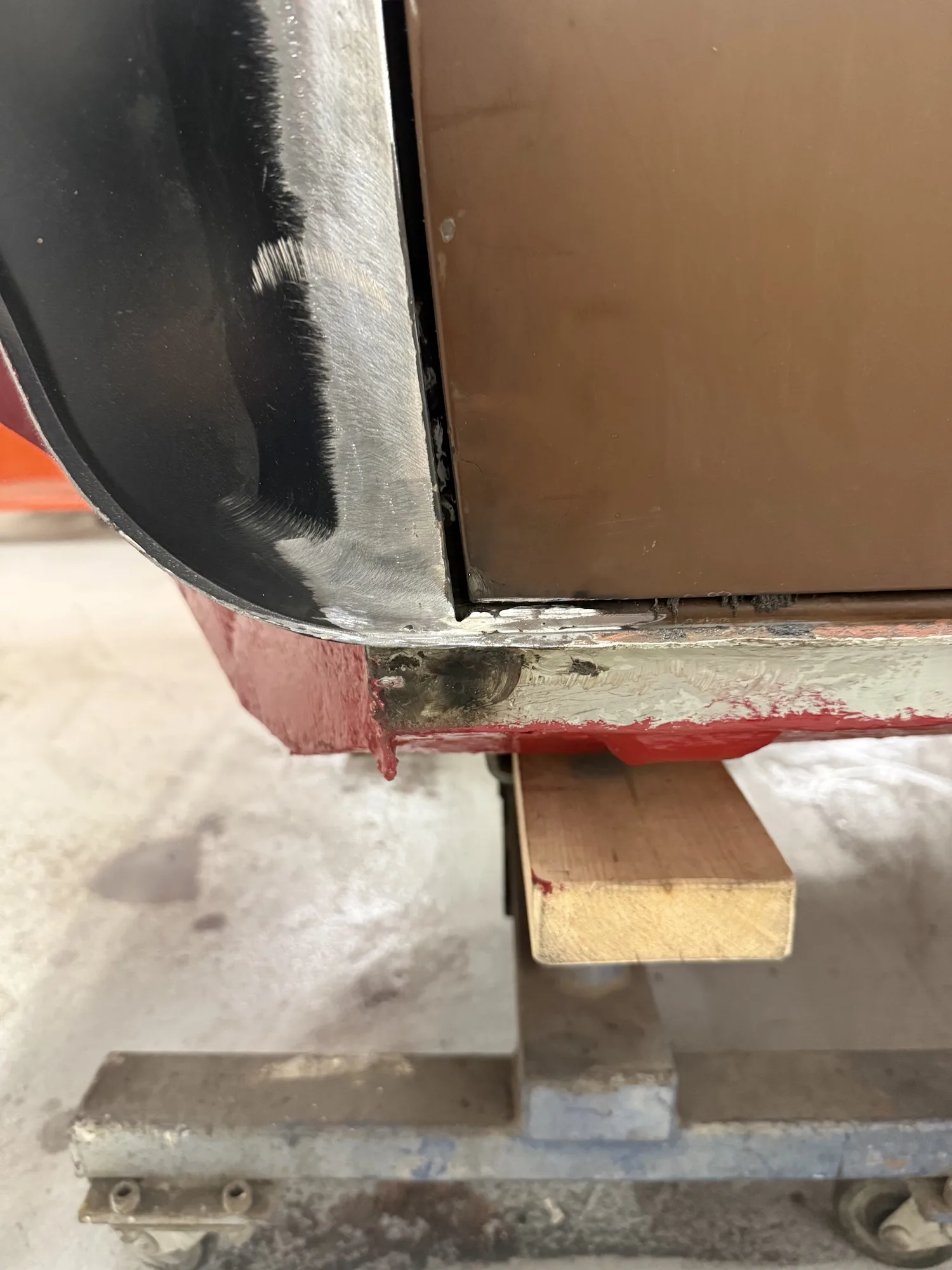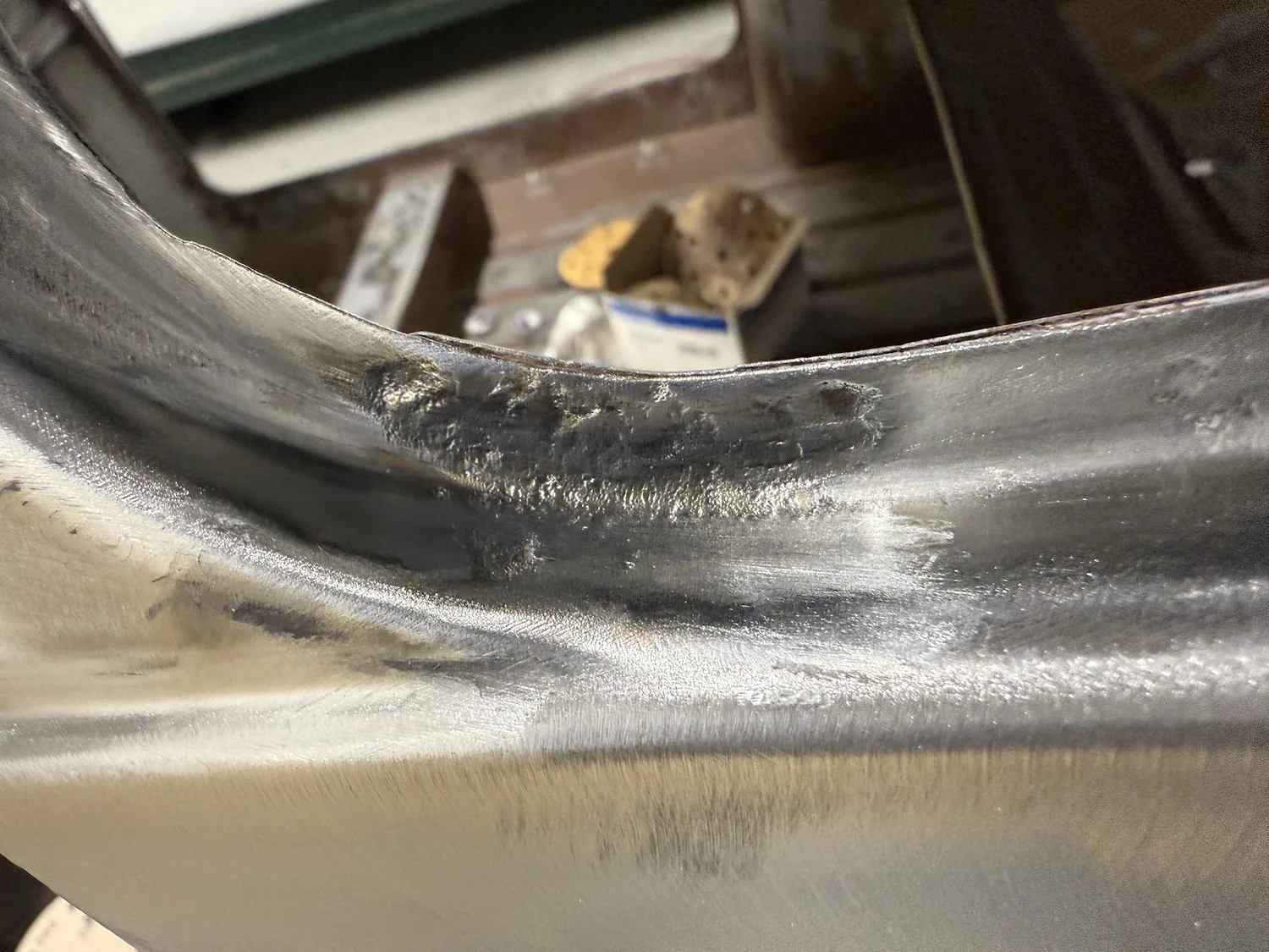 1st October 2025: The doors were test fitted, but the passenger side door in particular wasn’t lining up well with the front wing as it had previously been welded out of place. This was rectified by our fabricators in preparation for paint. The front end, bonnet, doors, roof and quarter panels were all stripped of their original paint and transport primer then sanded down. The inside was also prepped up ready for primer and paint. Both n/s and o/s doors, bonnet and bootlid were then prepped and Jenolite applied before a final sand and two coats of hybrid epoxy primer. Rust was found on the sill, backpanel and rear window, so these were all repaired.