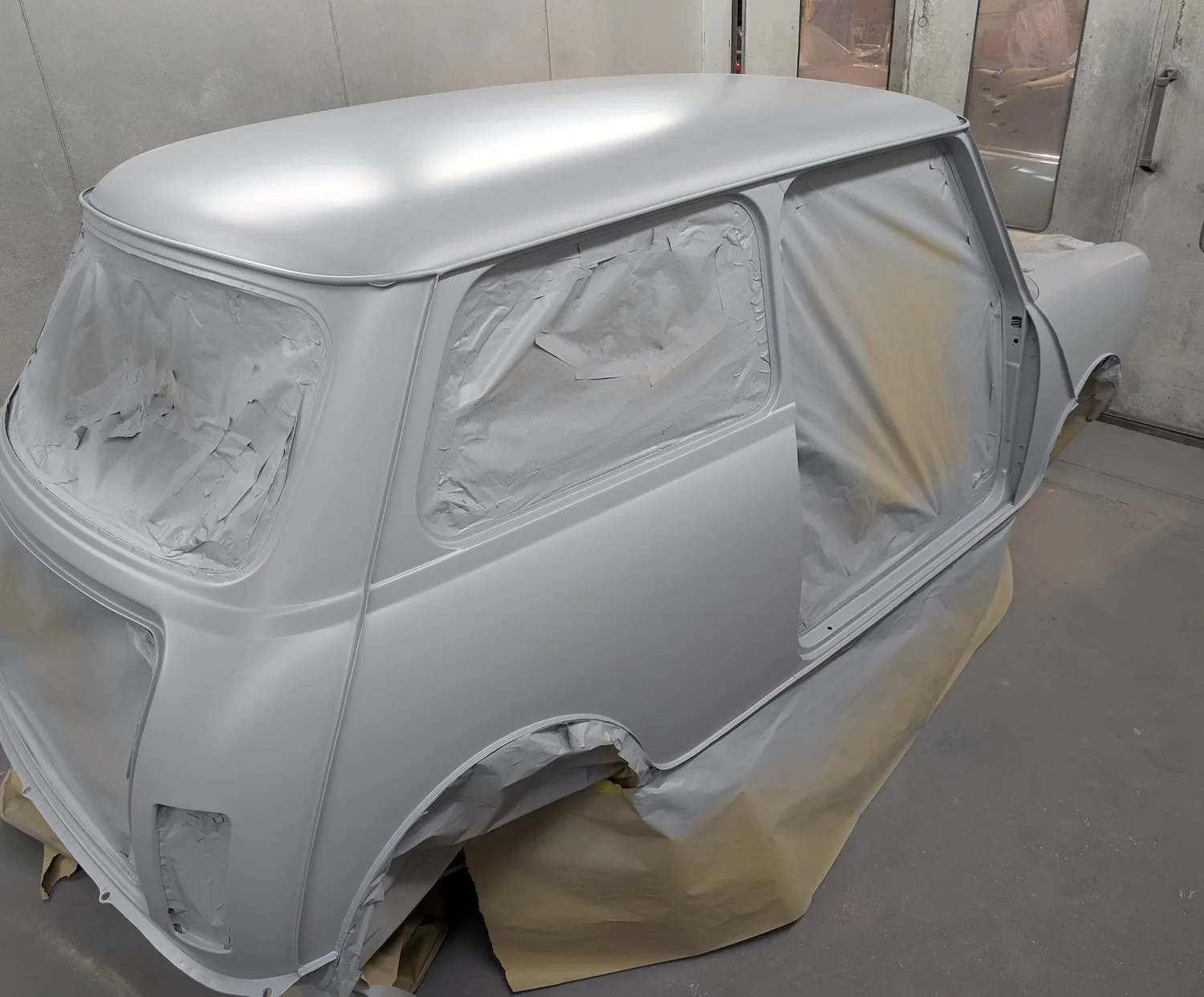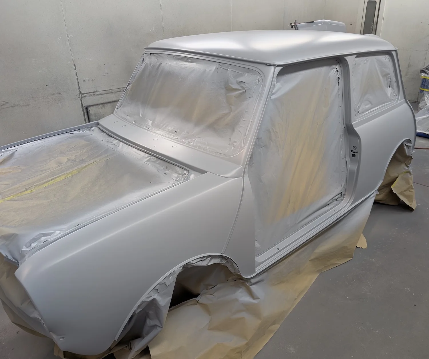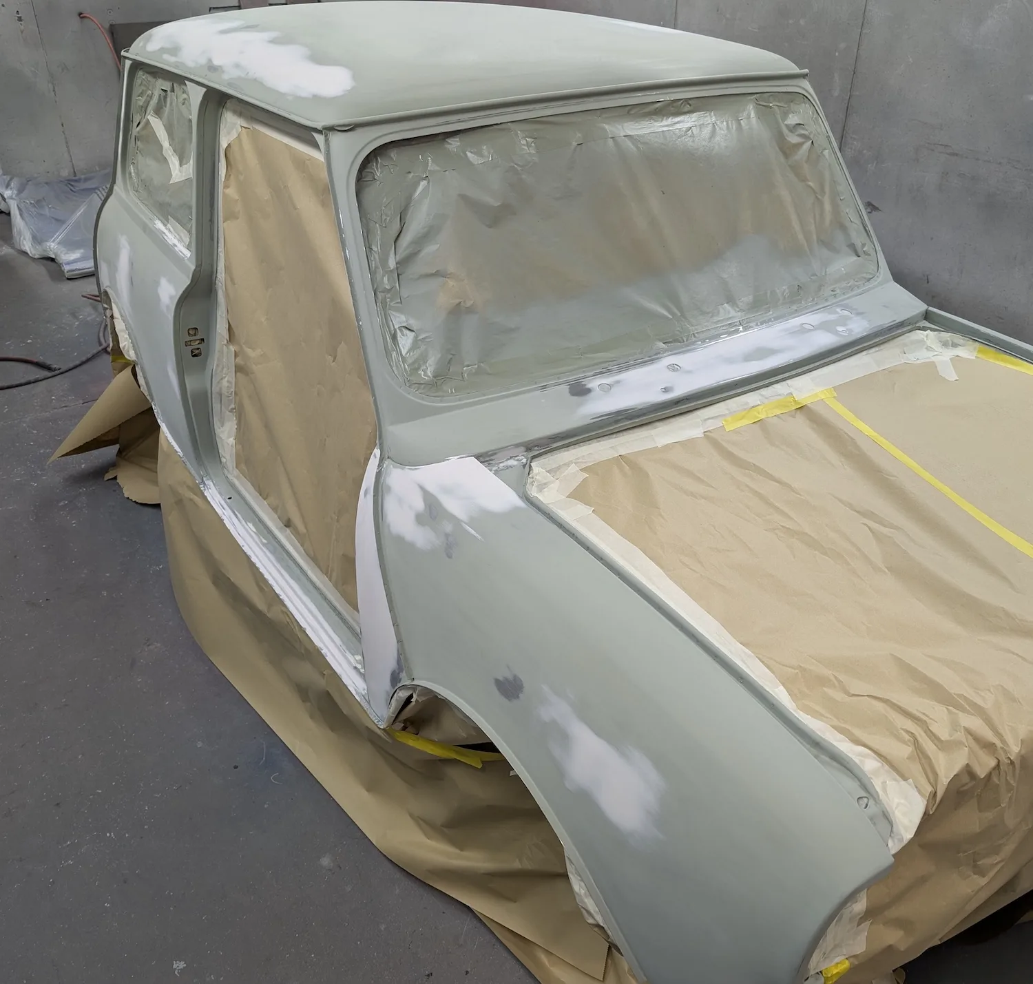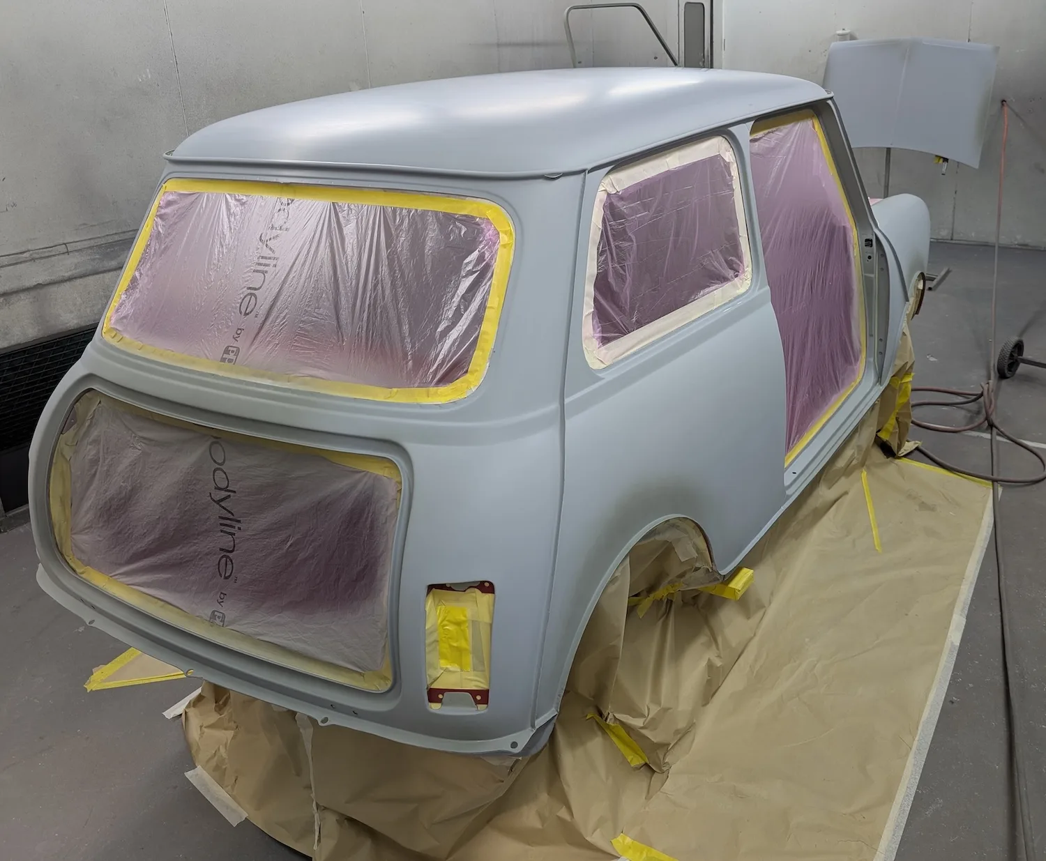 3rd March 2026: All dents have been filled, and the car has been masked. The body and panels are now ready for final prime. The interior and engine bay have been masked out, a coat of isolator epoxy primer applied, then sealed and into colour.