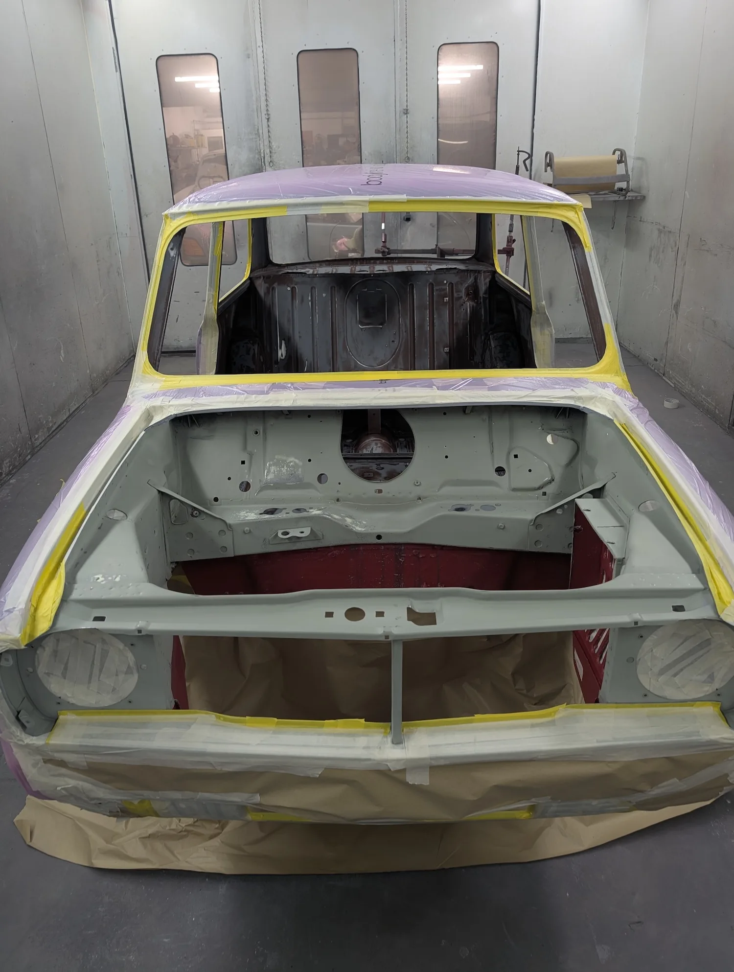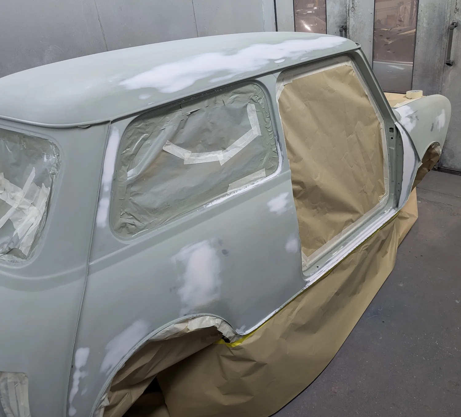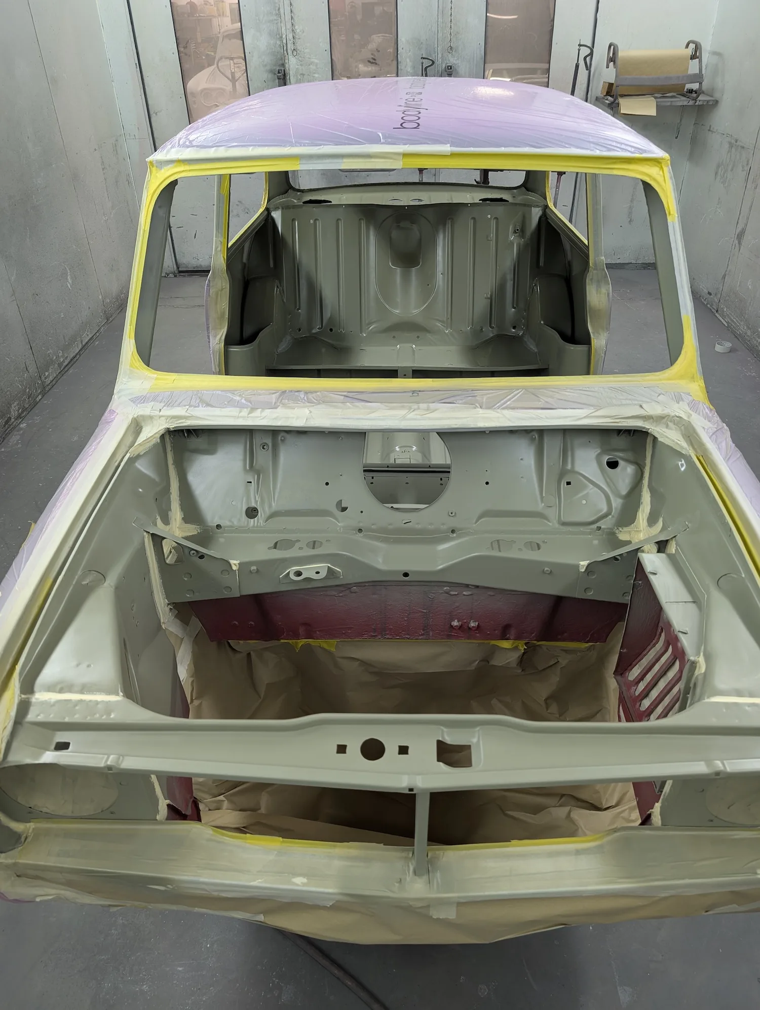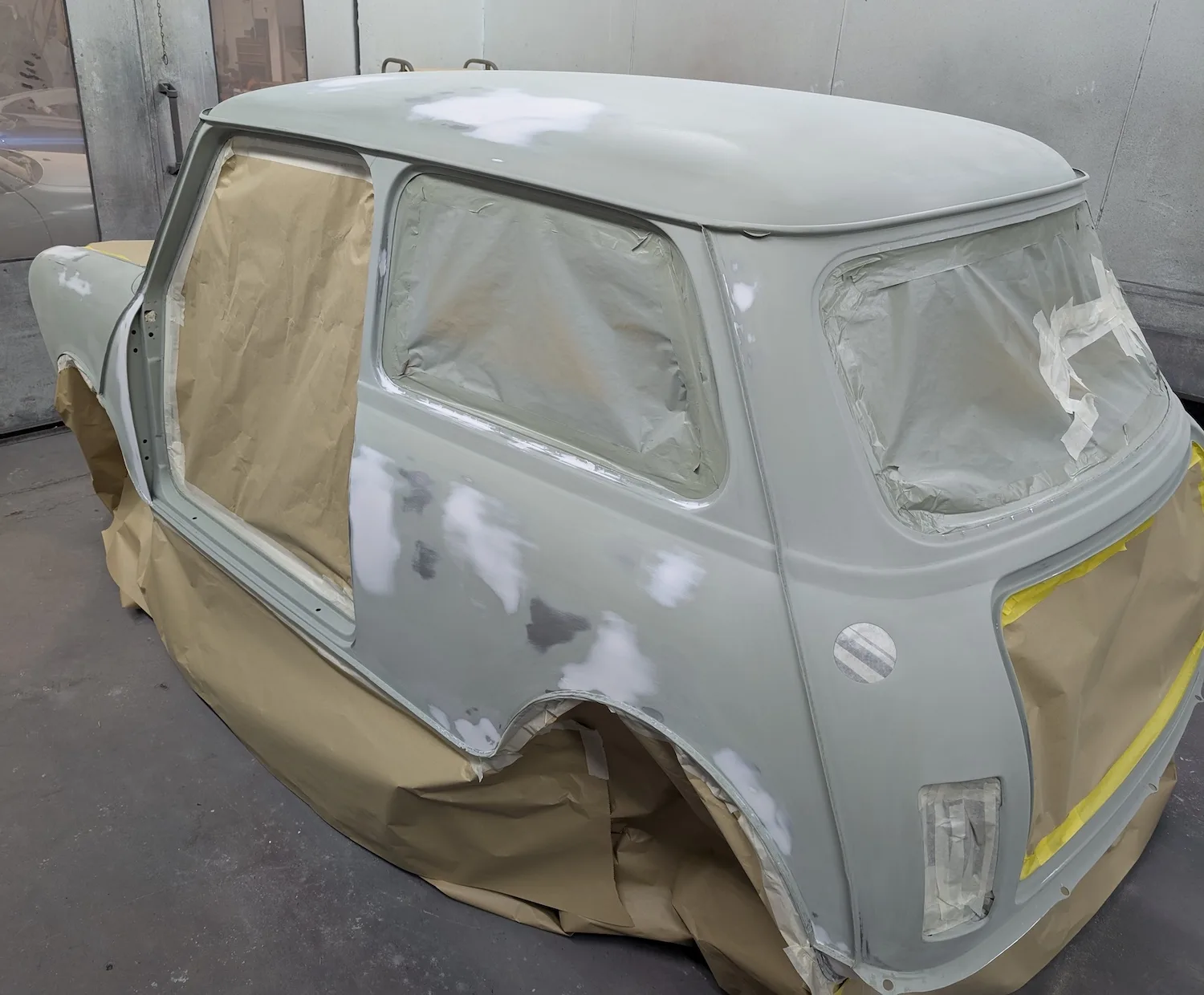 3rd March 2026: All dents have been filled, and the car has been masked. The body and panels are now ready for final prime. The interior and engine bay have been masked out, a coat of isolator epoxy primer applied, then sealed and into colour.