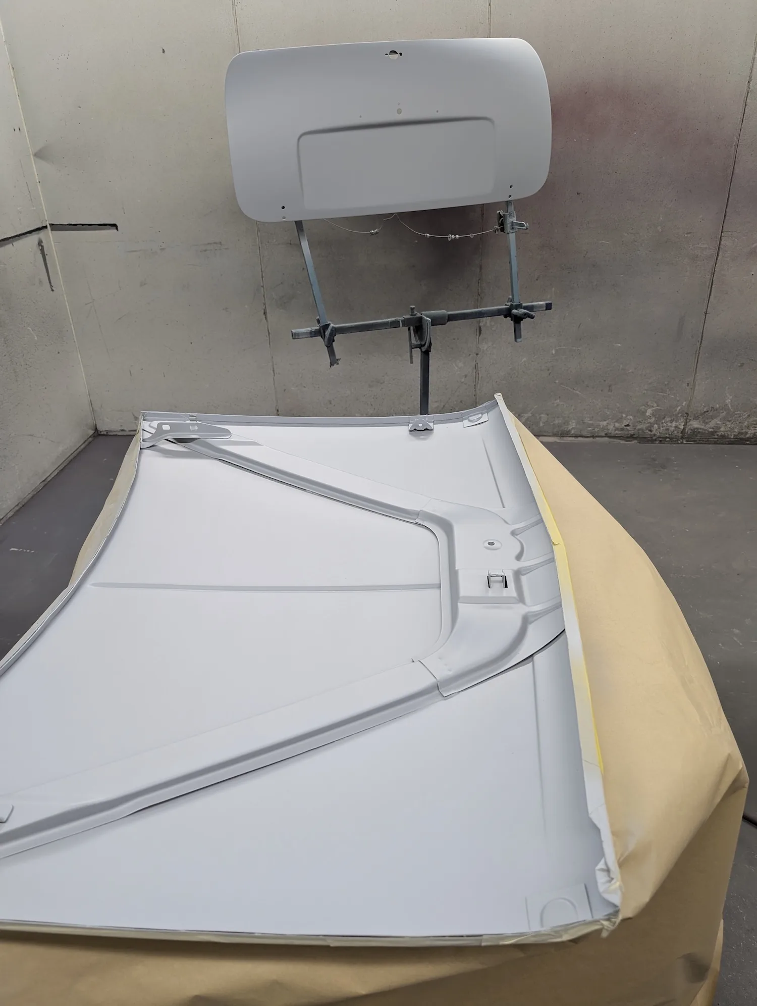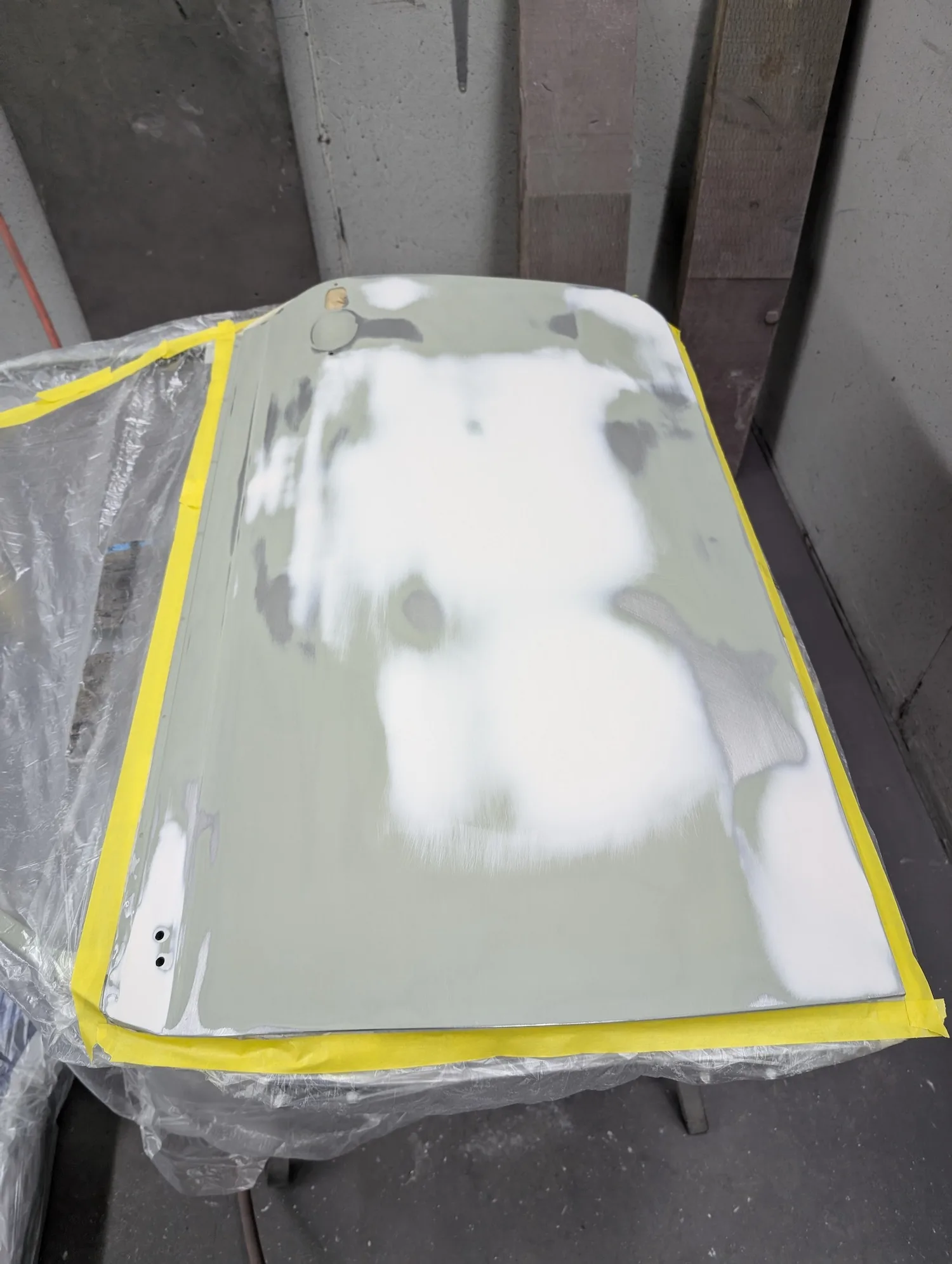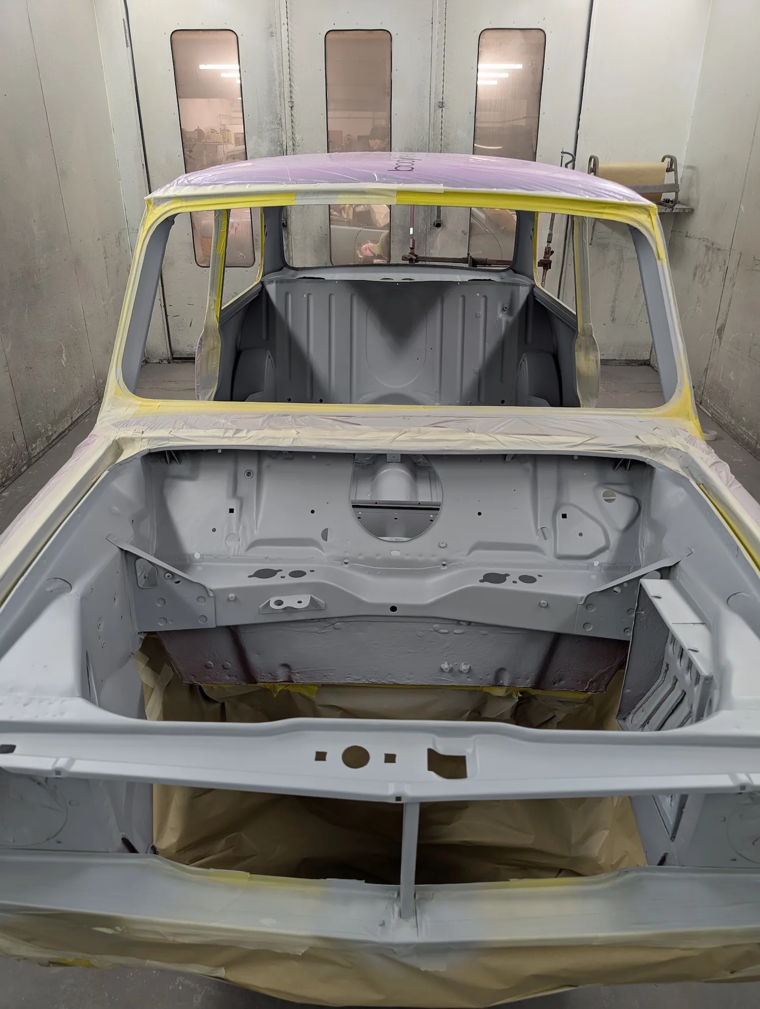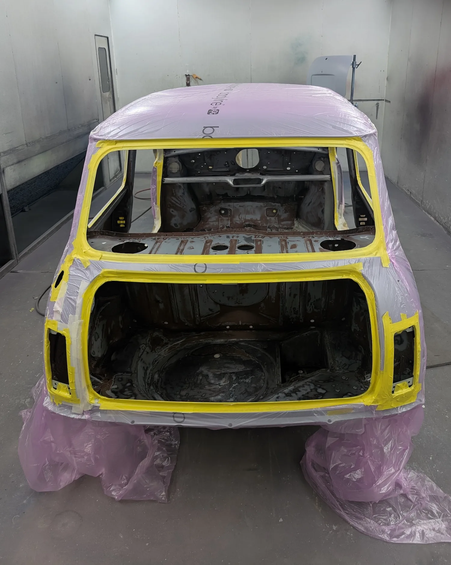 3rd March 2026: All dents have been filled, and the car has been masked. The body and panels are now ready for final prime. The interior and engine bay have been masked out, a coat of isolator epoxy primer applied, then sealed and into colour.
