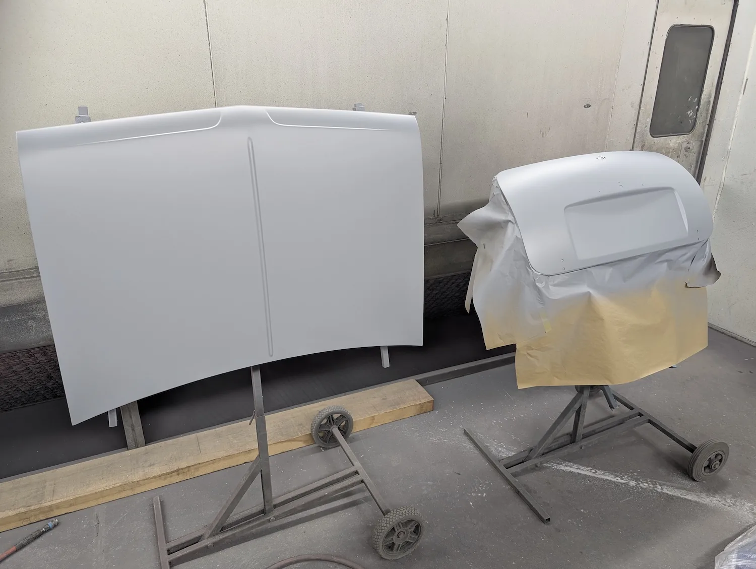 1st October 2025: The doors were test fitted, but the passenger side door in particular wasn’t lining up well with the front wing as it had previously been welded out of place. This was rectified by our fabricators in preparation for paint. The front end, bonnet, doors, roof and quarter panels were all stripped of their original paint and transport primer then sanded down. The inside was also prepped up ready for primer and paint. Both n/s and o/s doors, bonnet and bootlid were then prepped and Jenolite applied before a final sand and two coats of hybrid epoxy primer. Rust was found on the sill, backpanel and rear window, so these were all repaired.