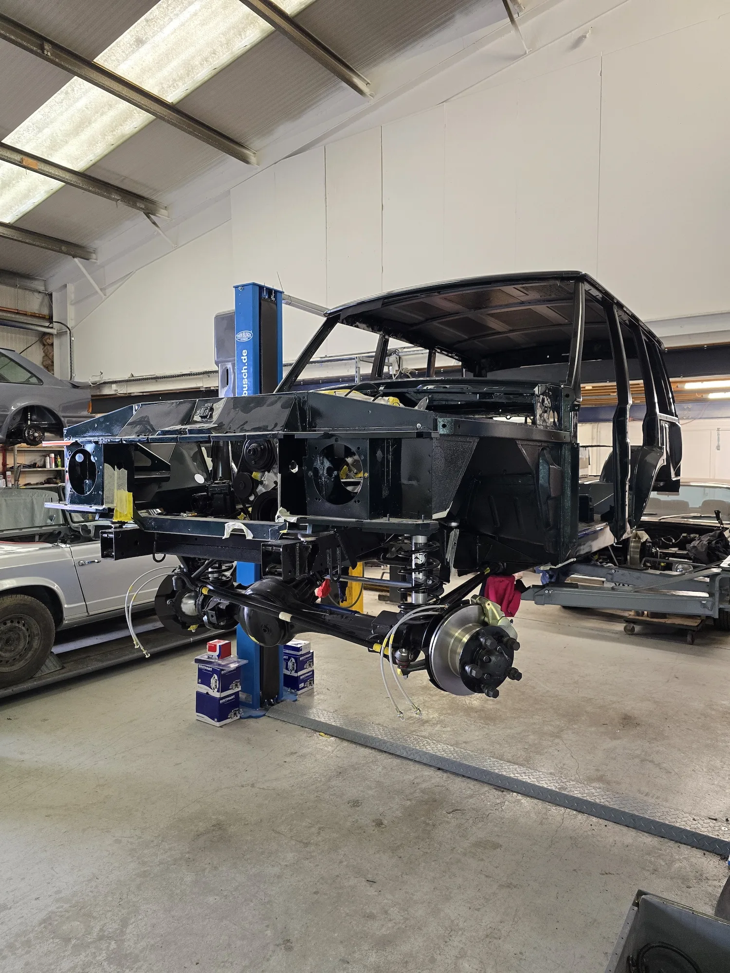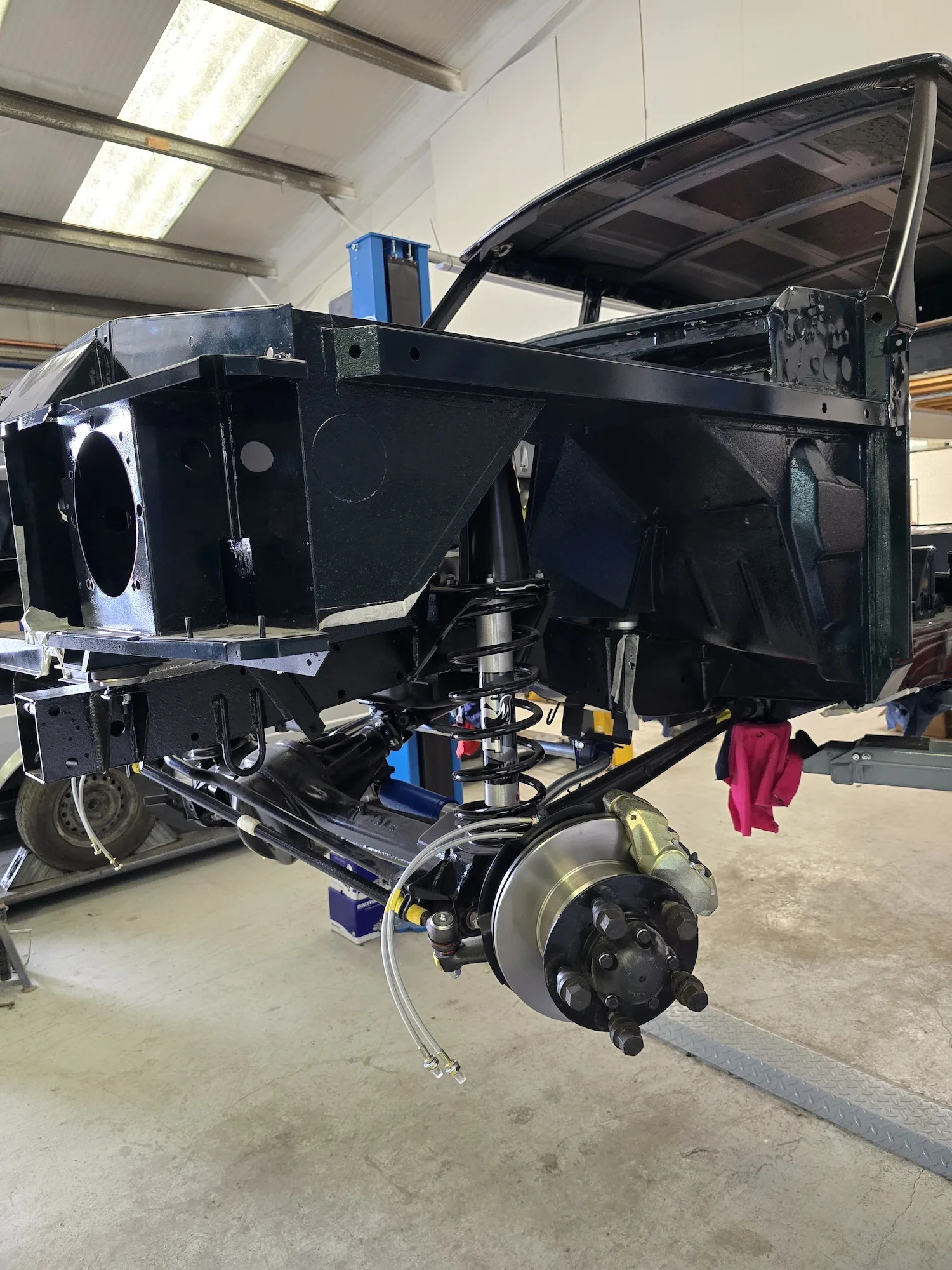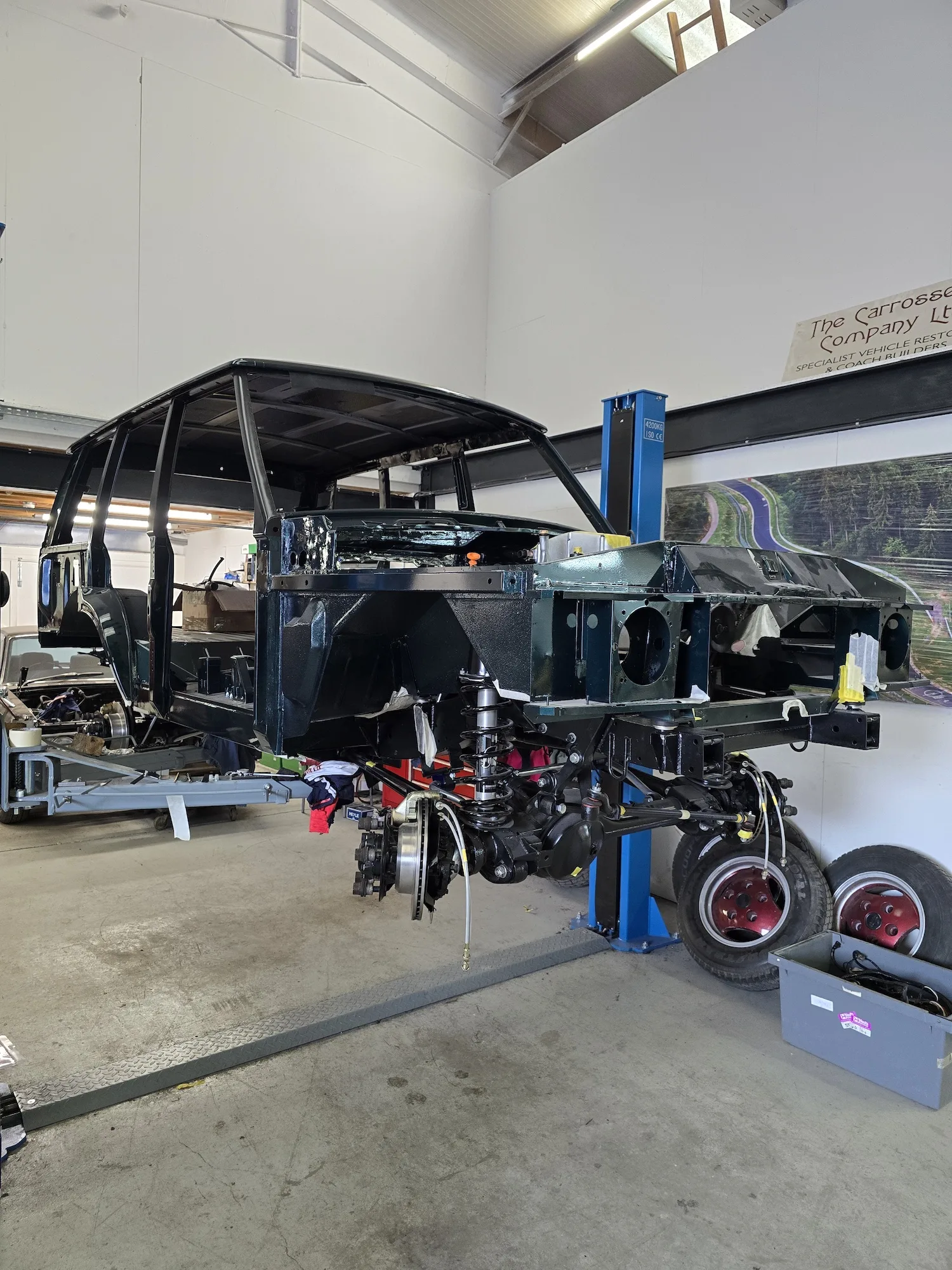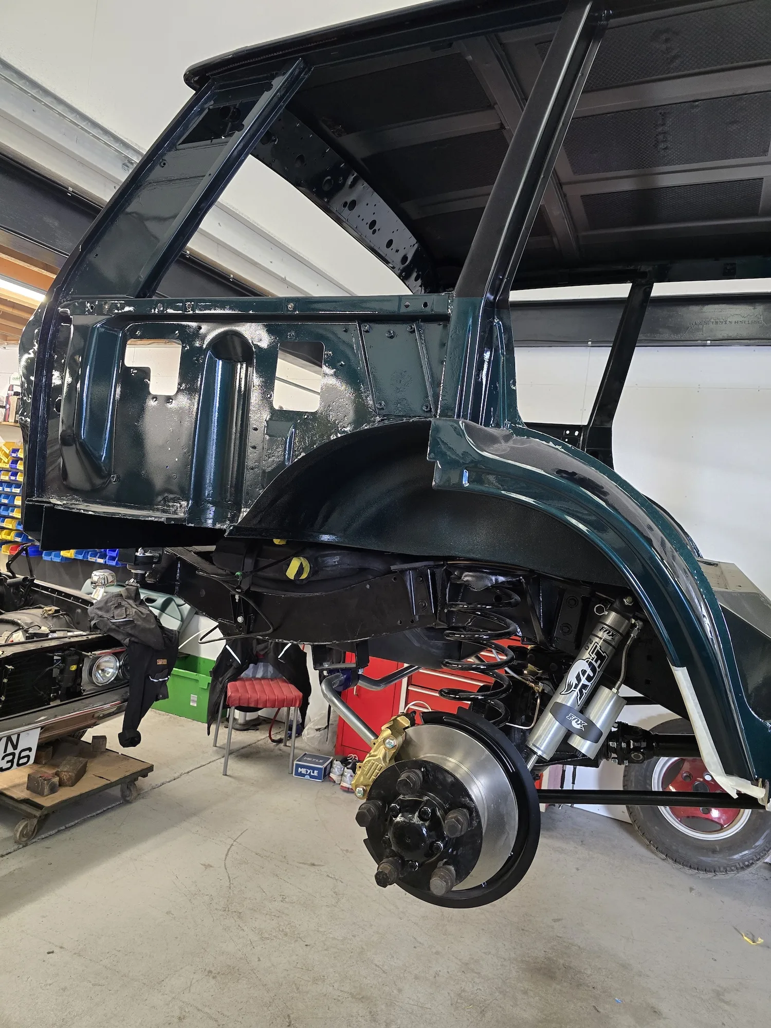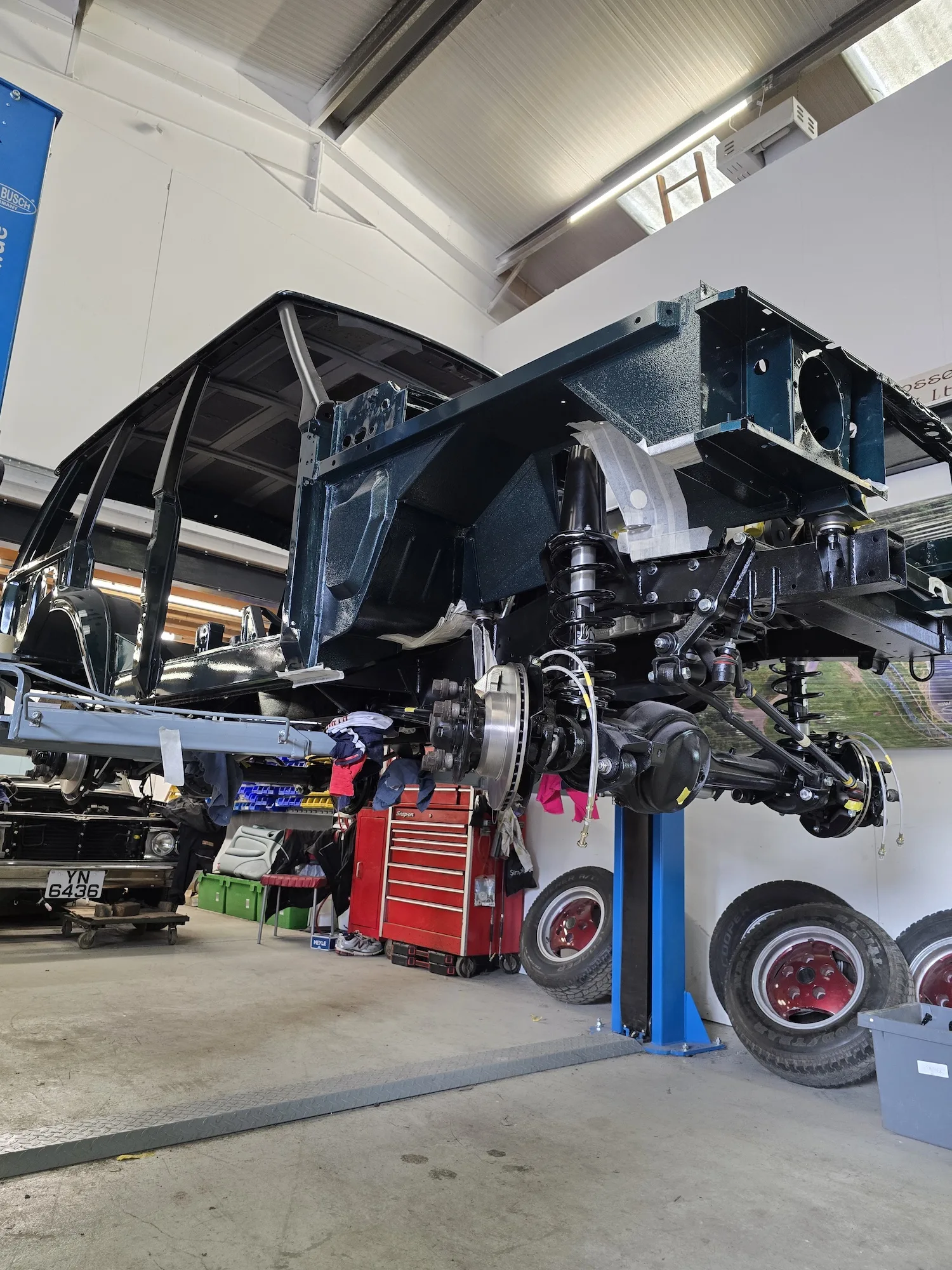More parts have been fitted on the new chassis, including front and rear axles, new suspension, and brake discs. It will soon become a rolling chassis, and the body will be put on to check for correct door gaps.