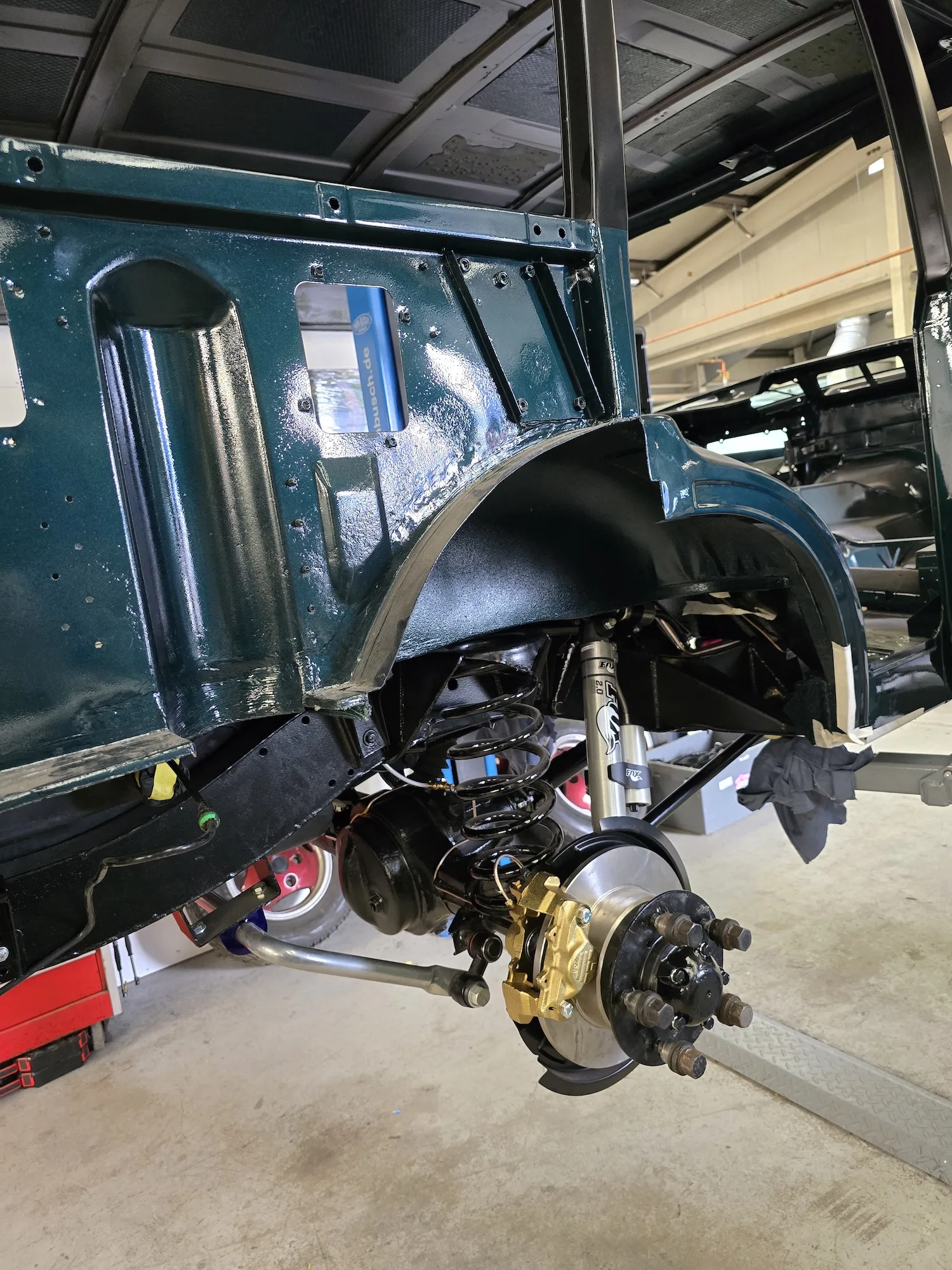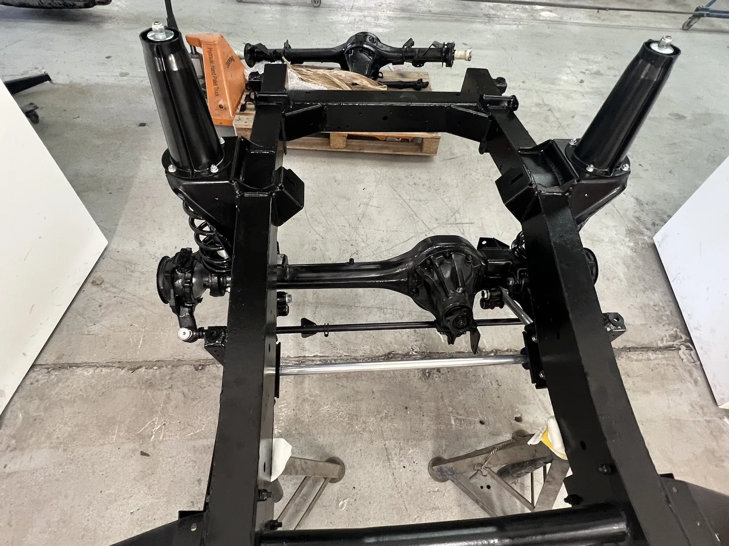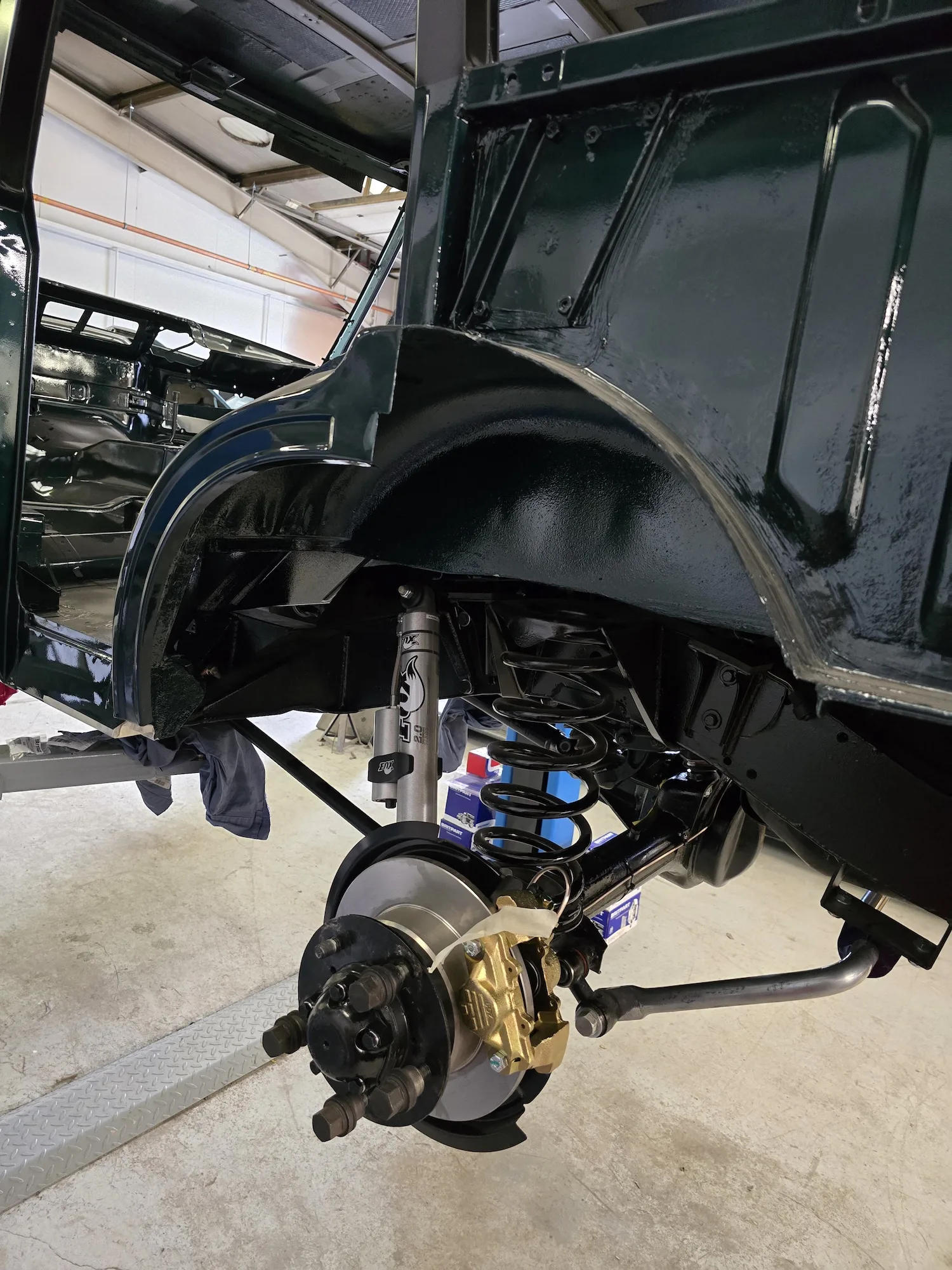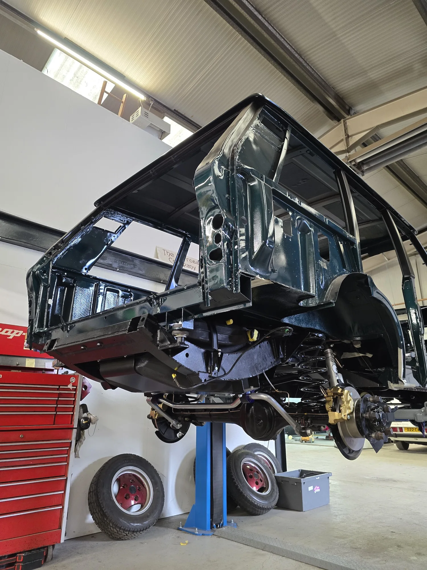 More parts have been fitted on the new chassis, including front and rear axles, new suspension, and brake discs. It will soon become a rolling chassis, and the body will be put on to check for correct door gaps.