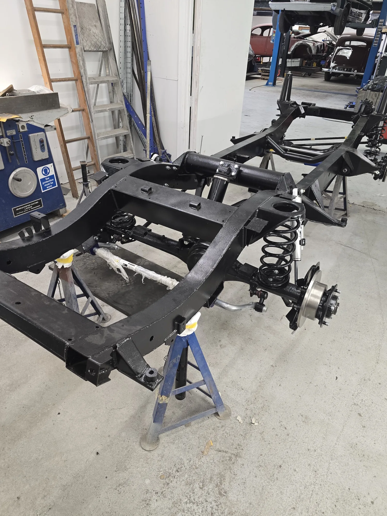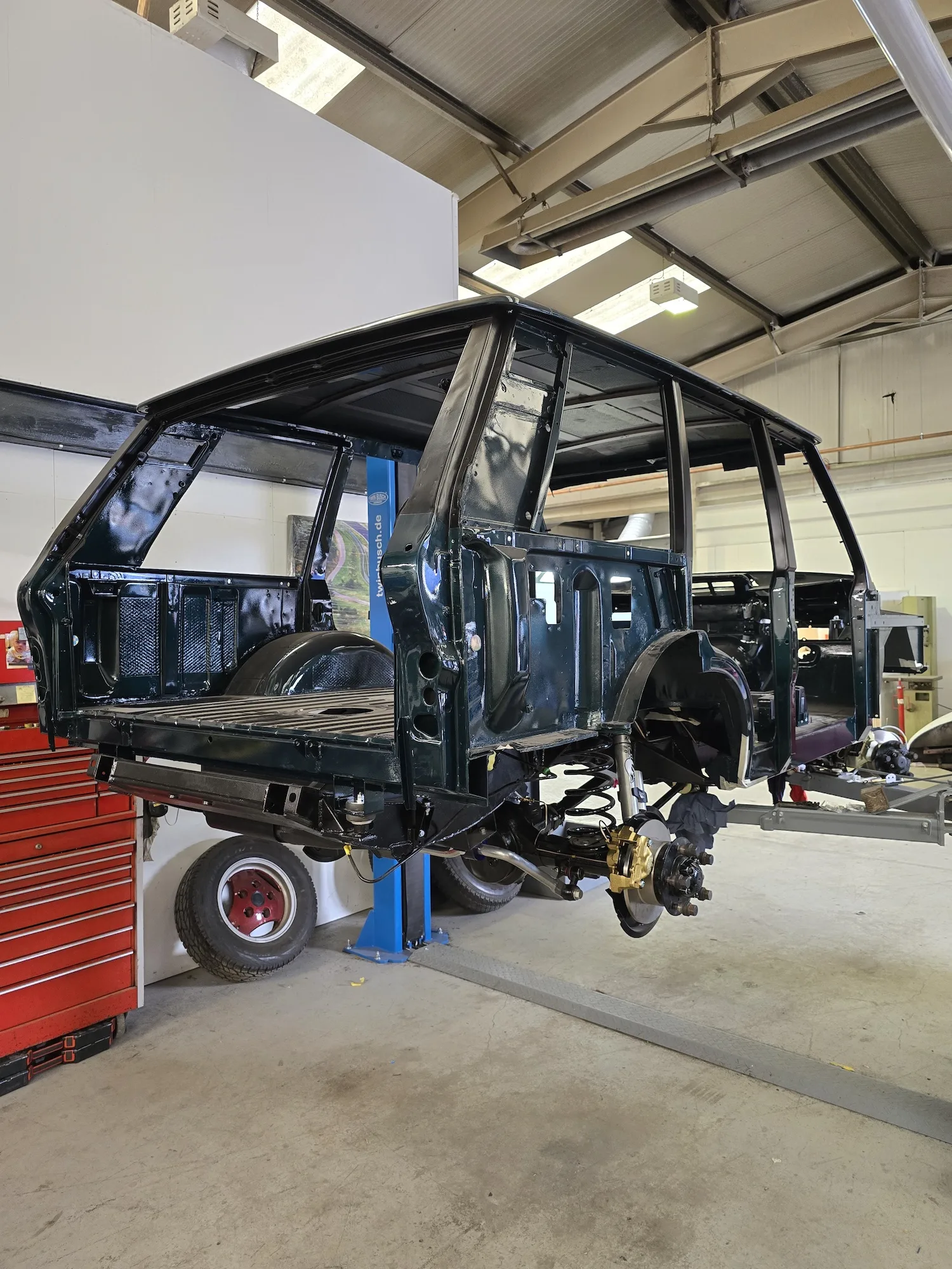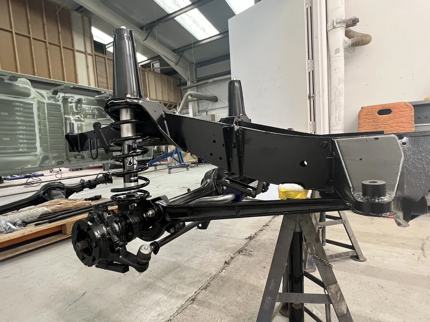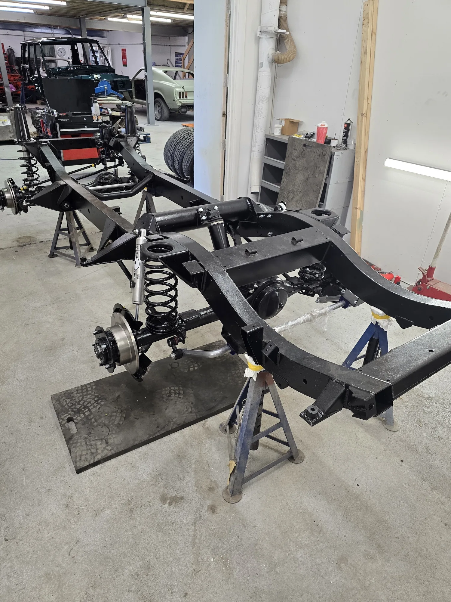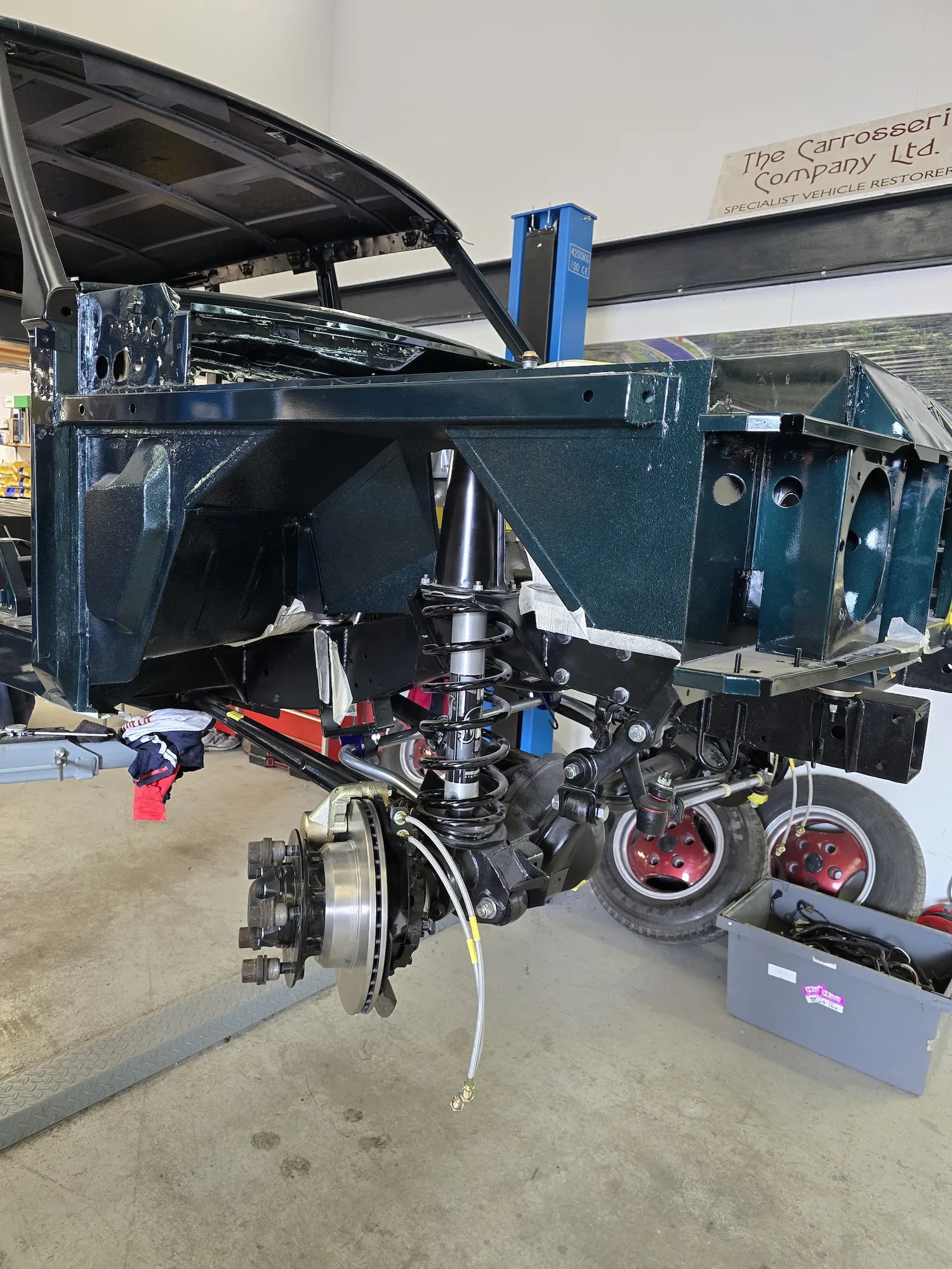 More parts have been fitted on the new chassis, including front and rear axles, new suspension, and brake discs. It will soon become a rolling chassis, and the body will be put on to check for correct door gaps.