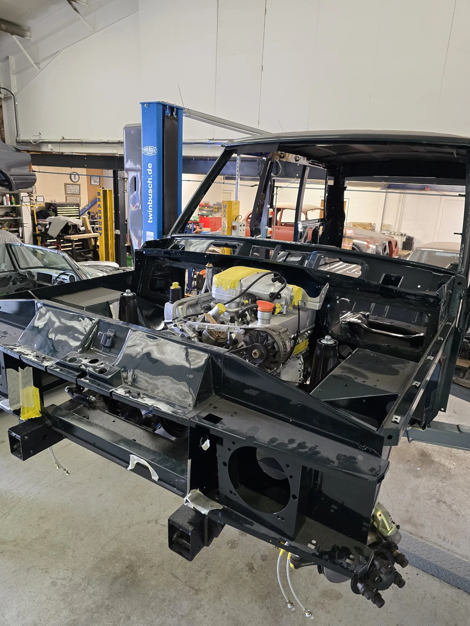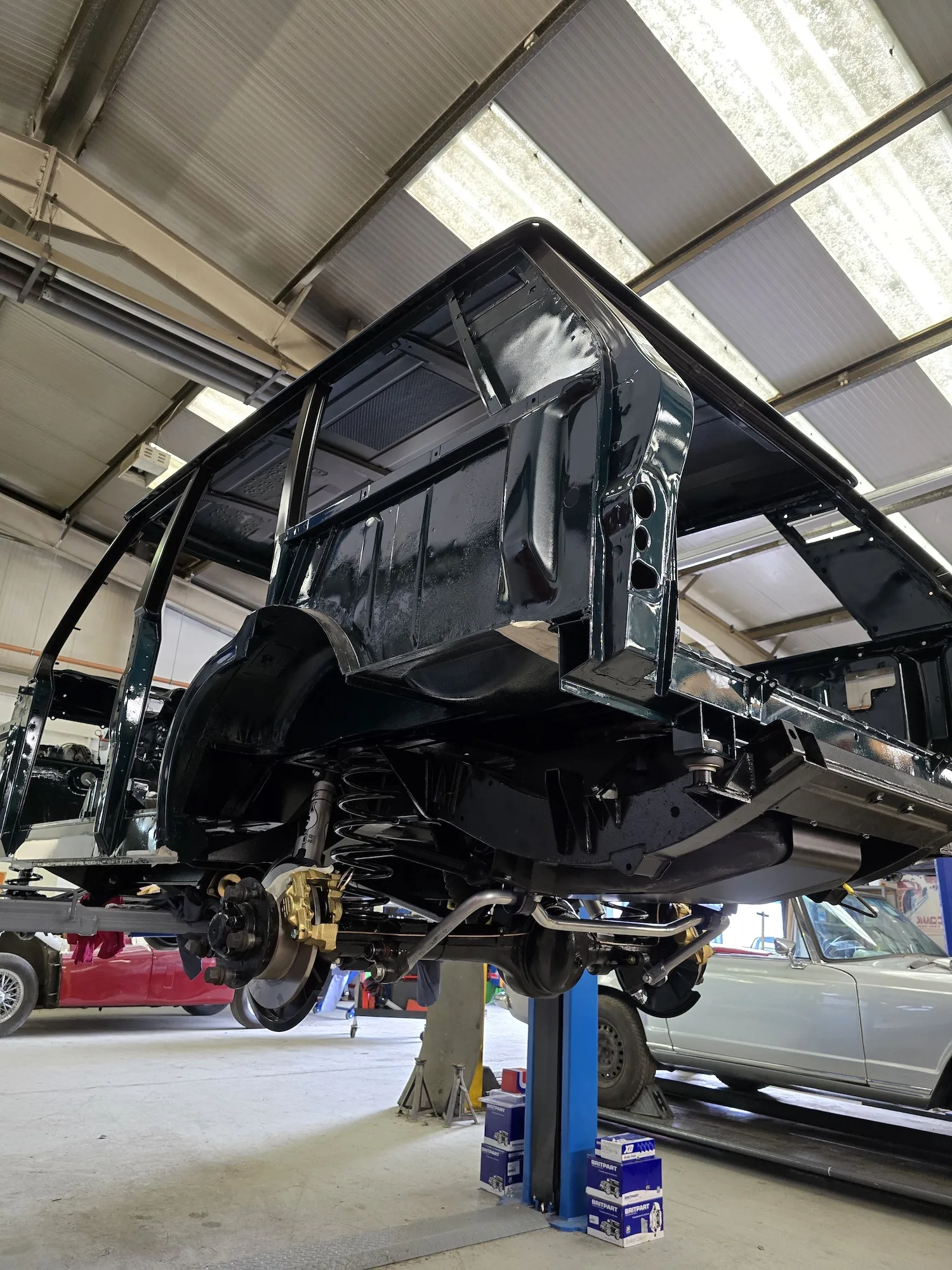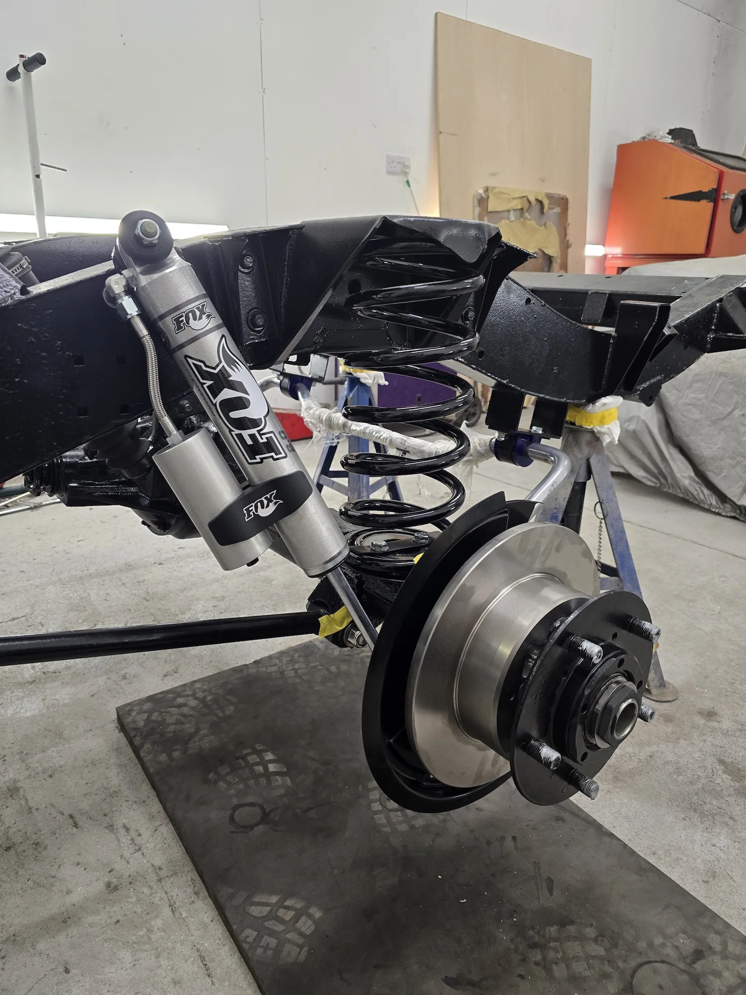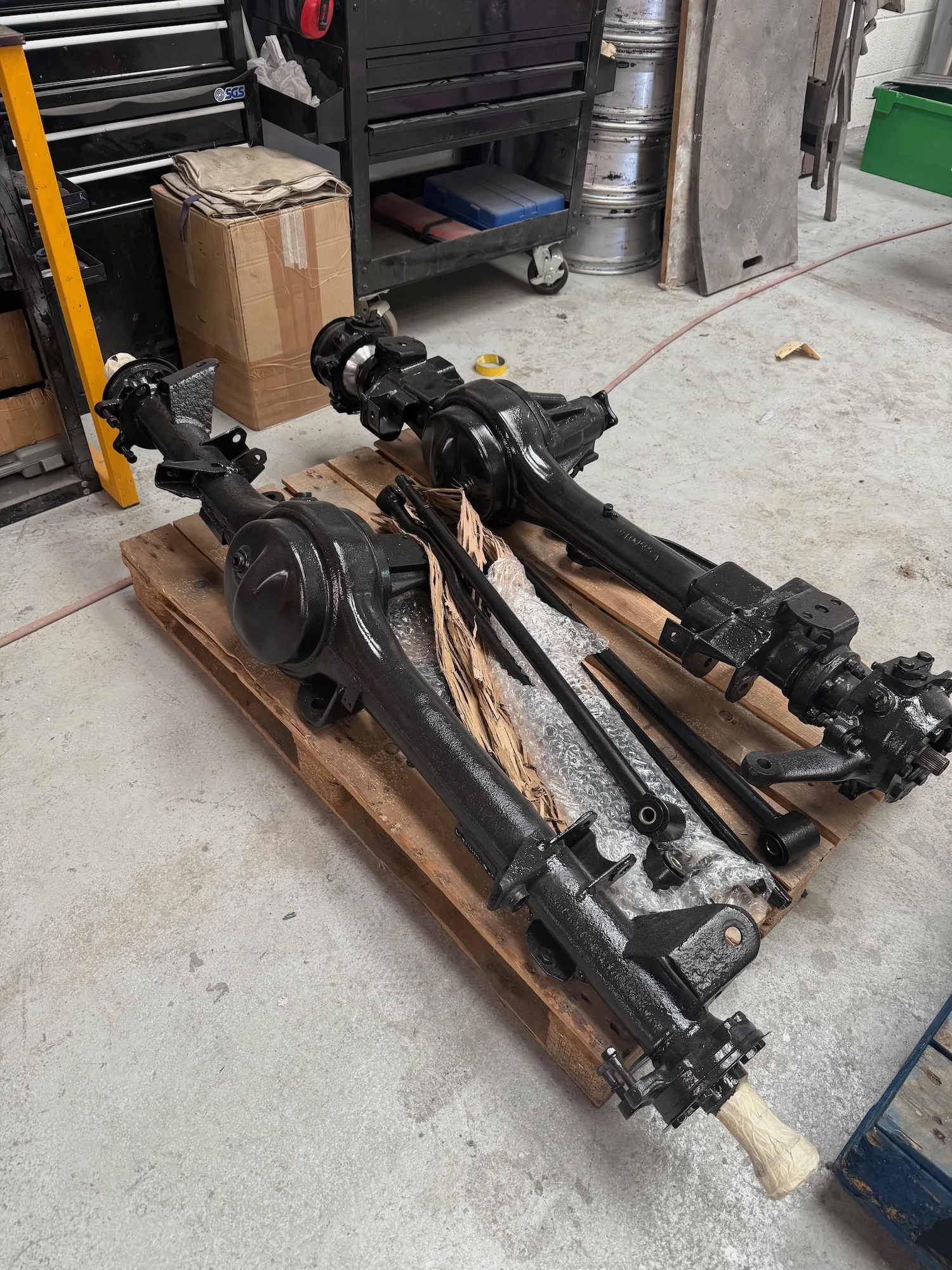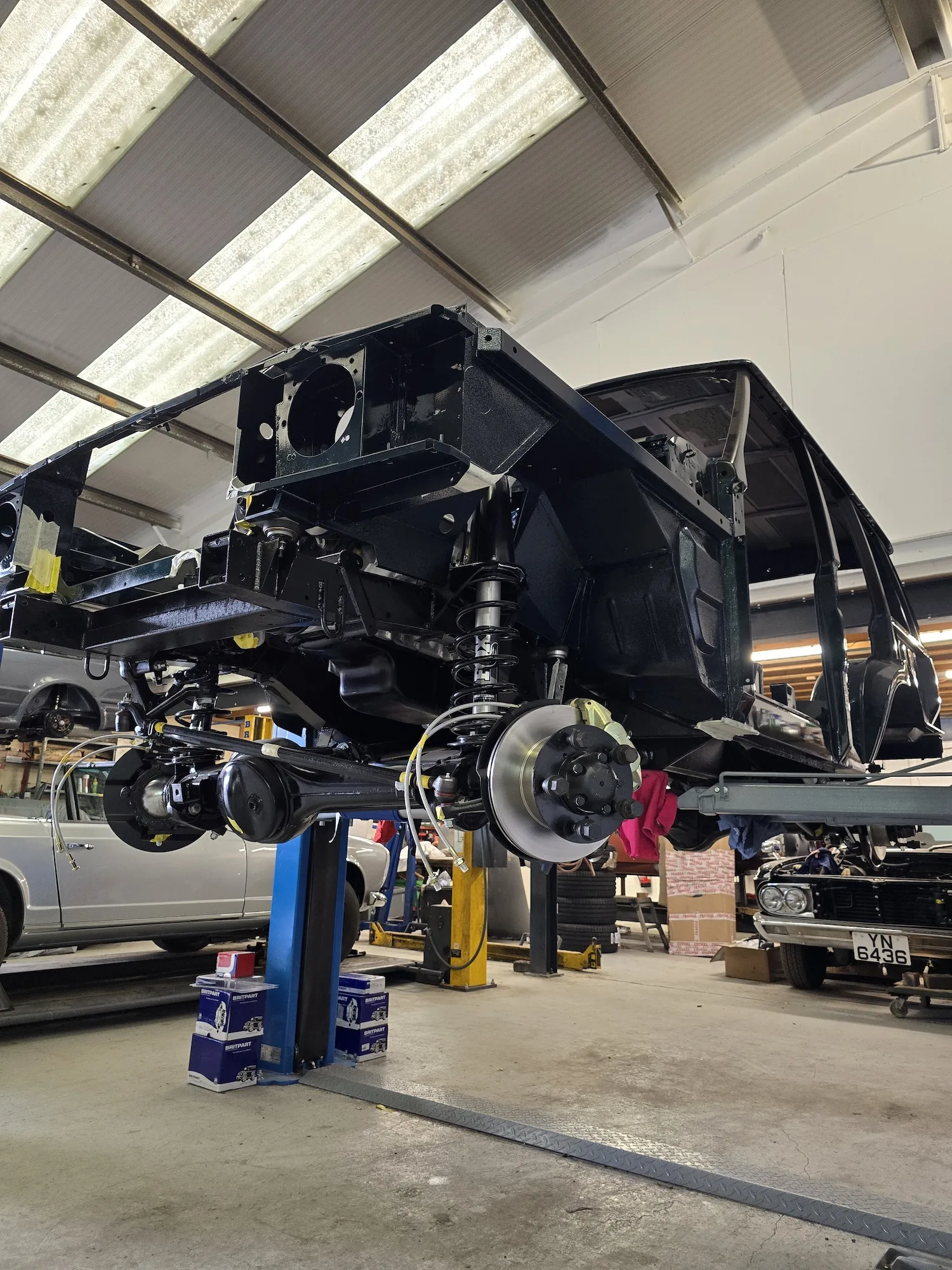 More parts have been fitted on the new chassis, including front and rear axles, new suspension, and brake discs. It will soon become a rolling chassis, and the body will be put on to check for correct door gaps.