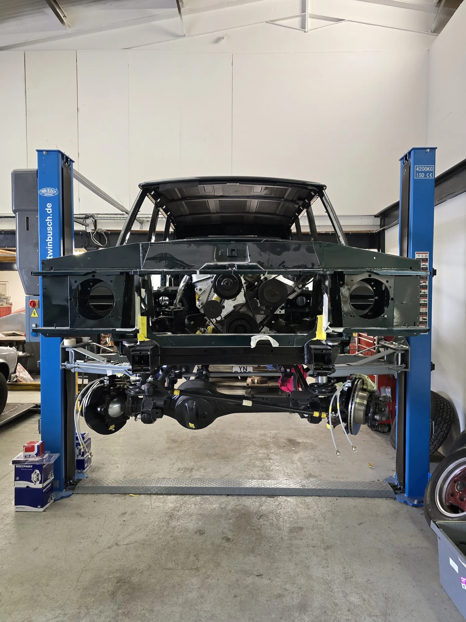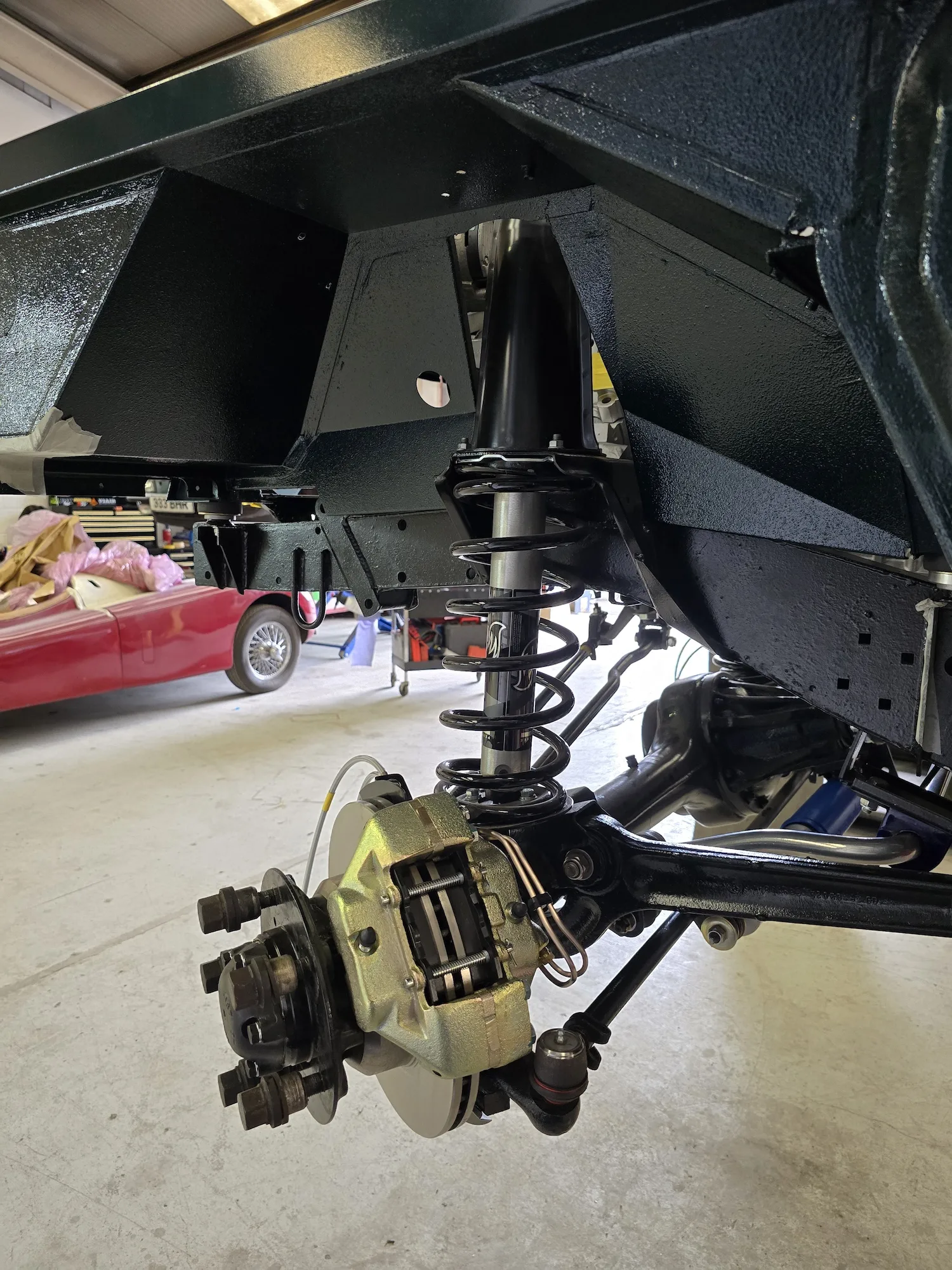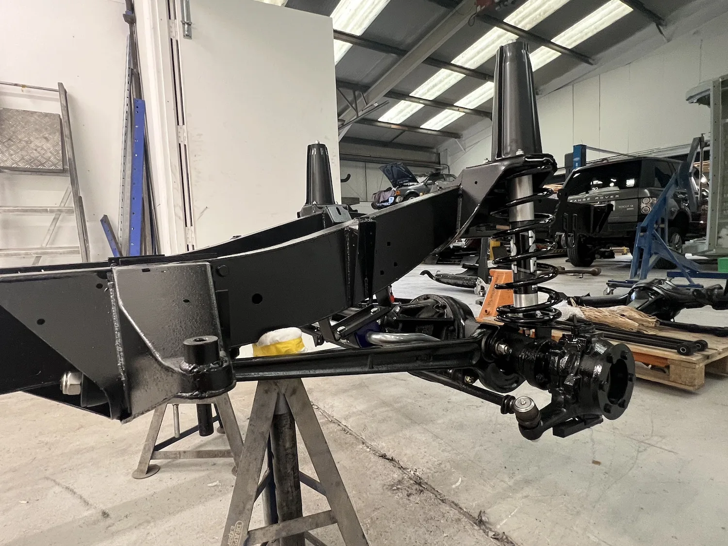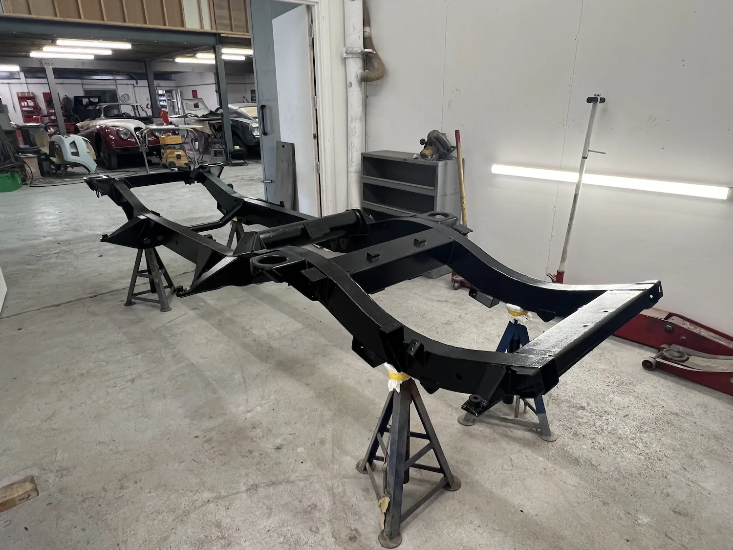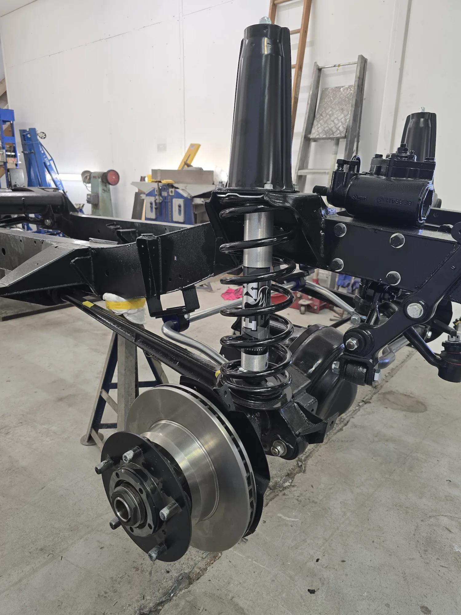 More parts have been fitted on the new chassis, including front and rear axles, new suspension, and brake discs. It will soon become a rolling chassis, and the body will be put on to check for correct door gaps.