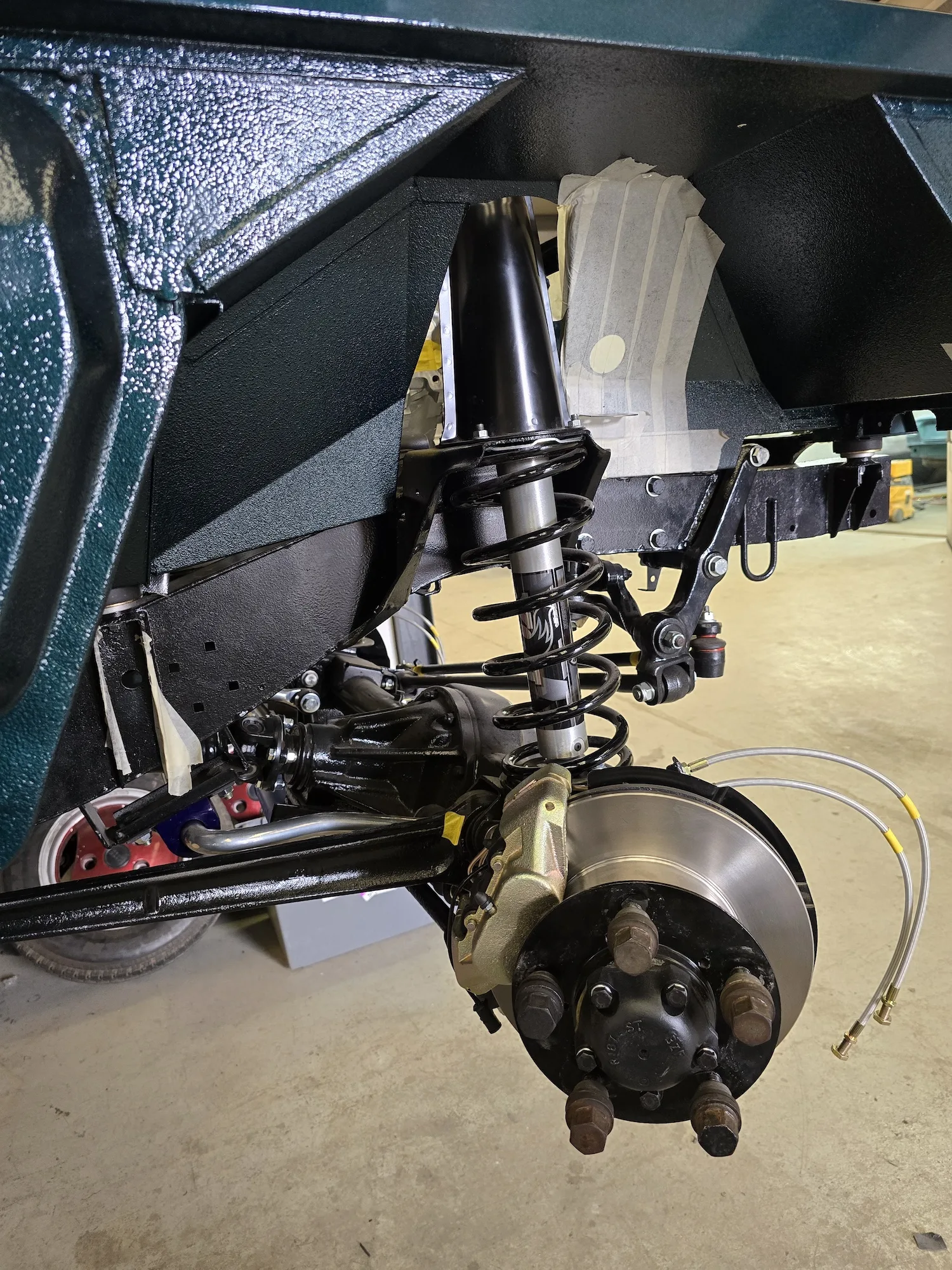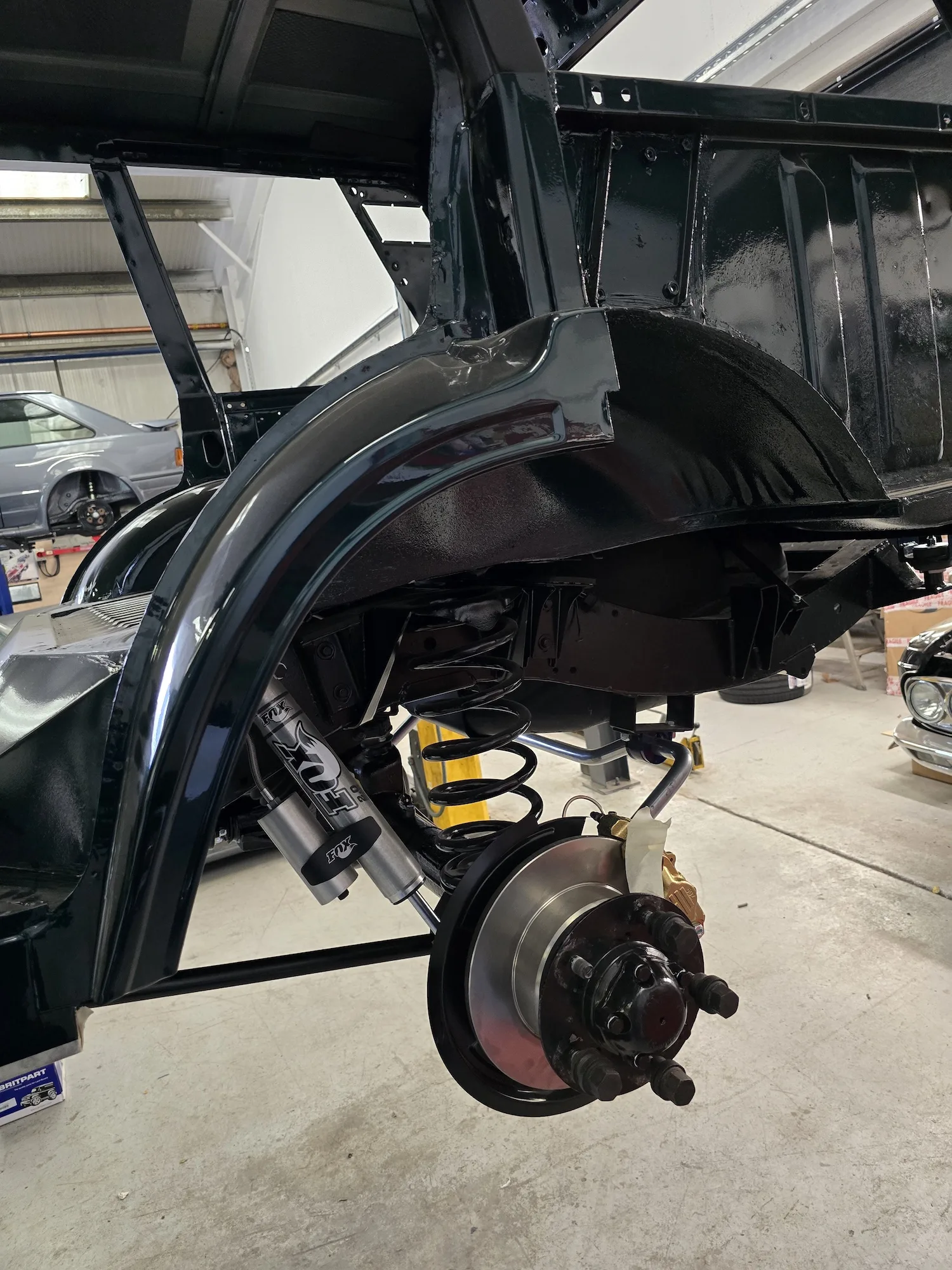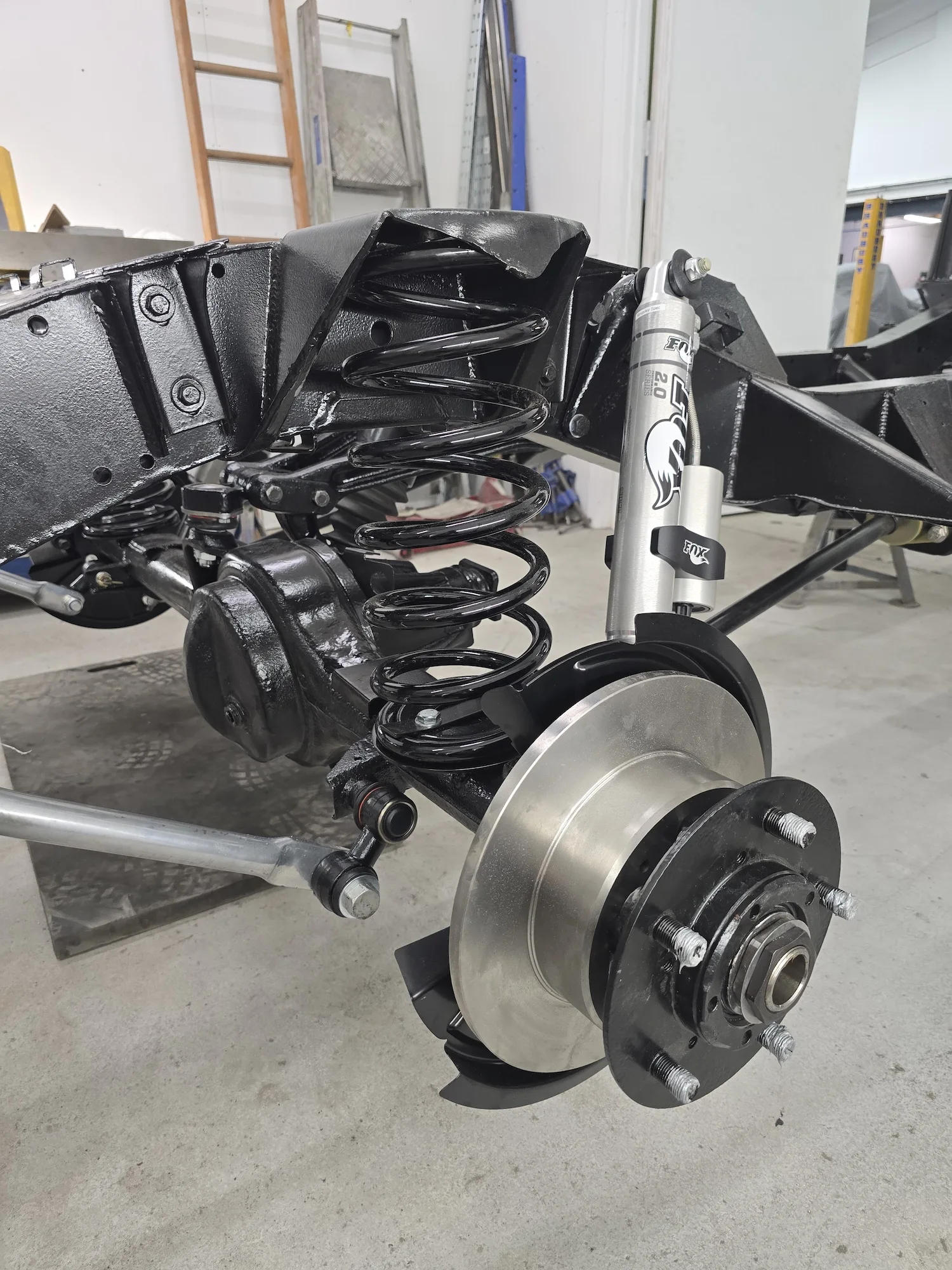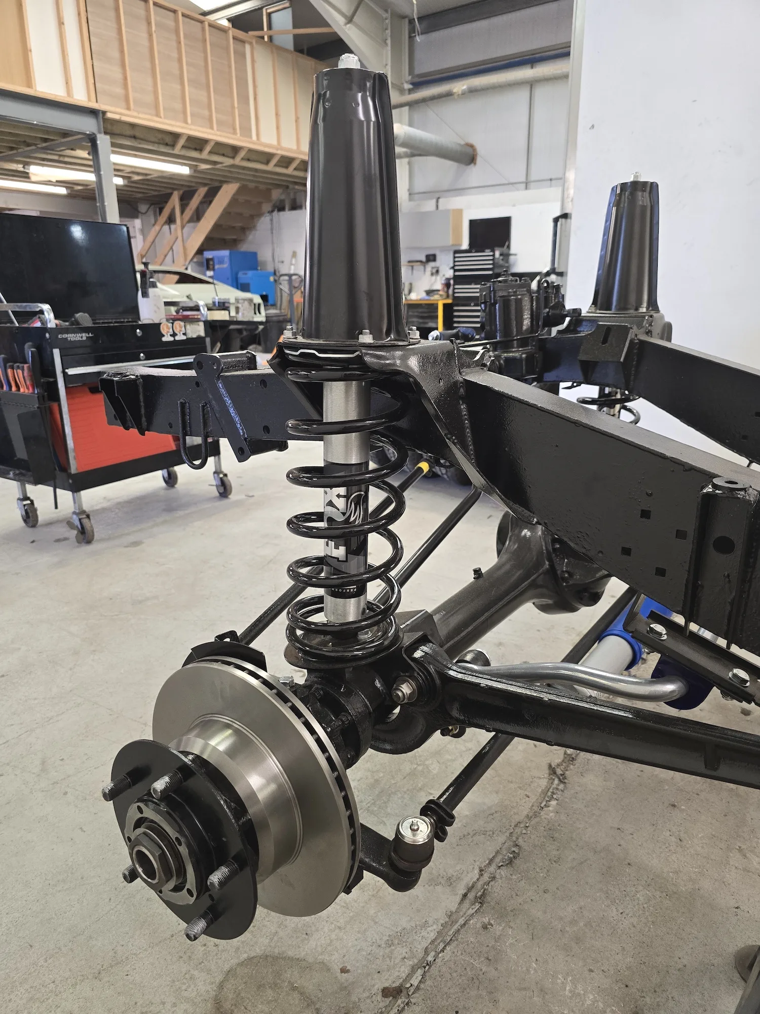 More parts have been fitted on the new chassis, including front and rear axles, new suspension, and brake discs. It will soon become a rolling chassis, and the body will be put on to check for correct door gaps.