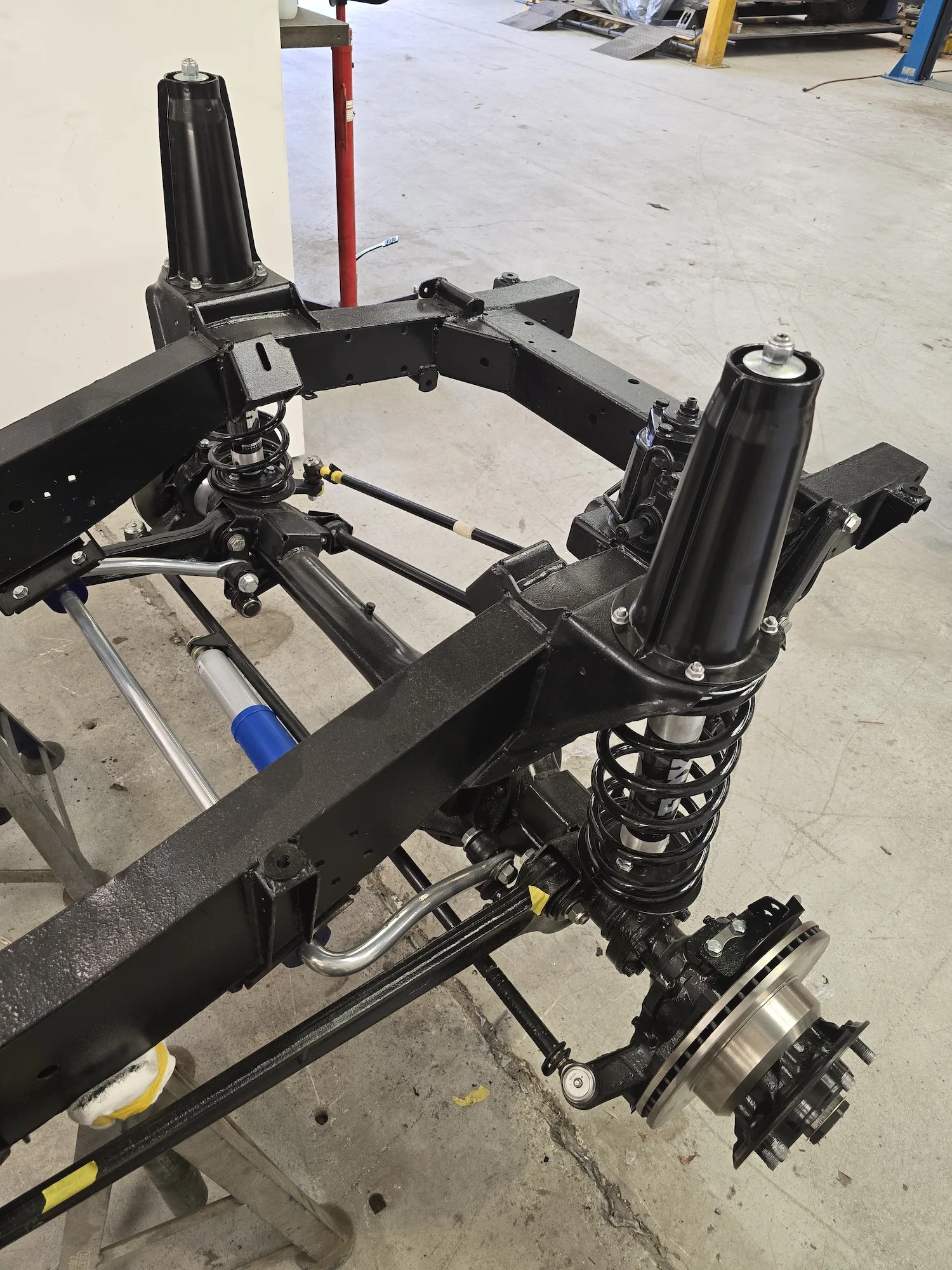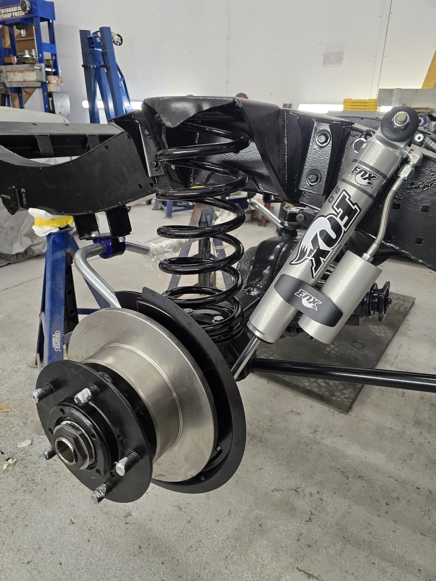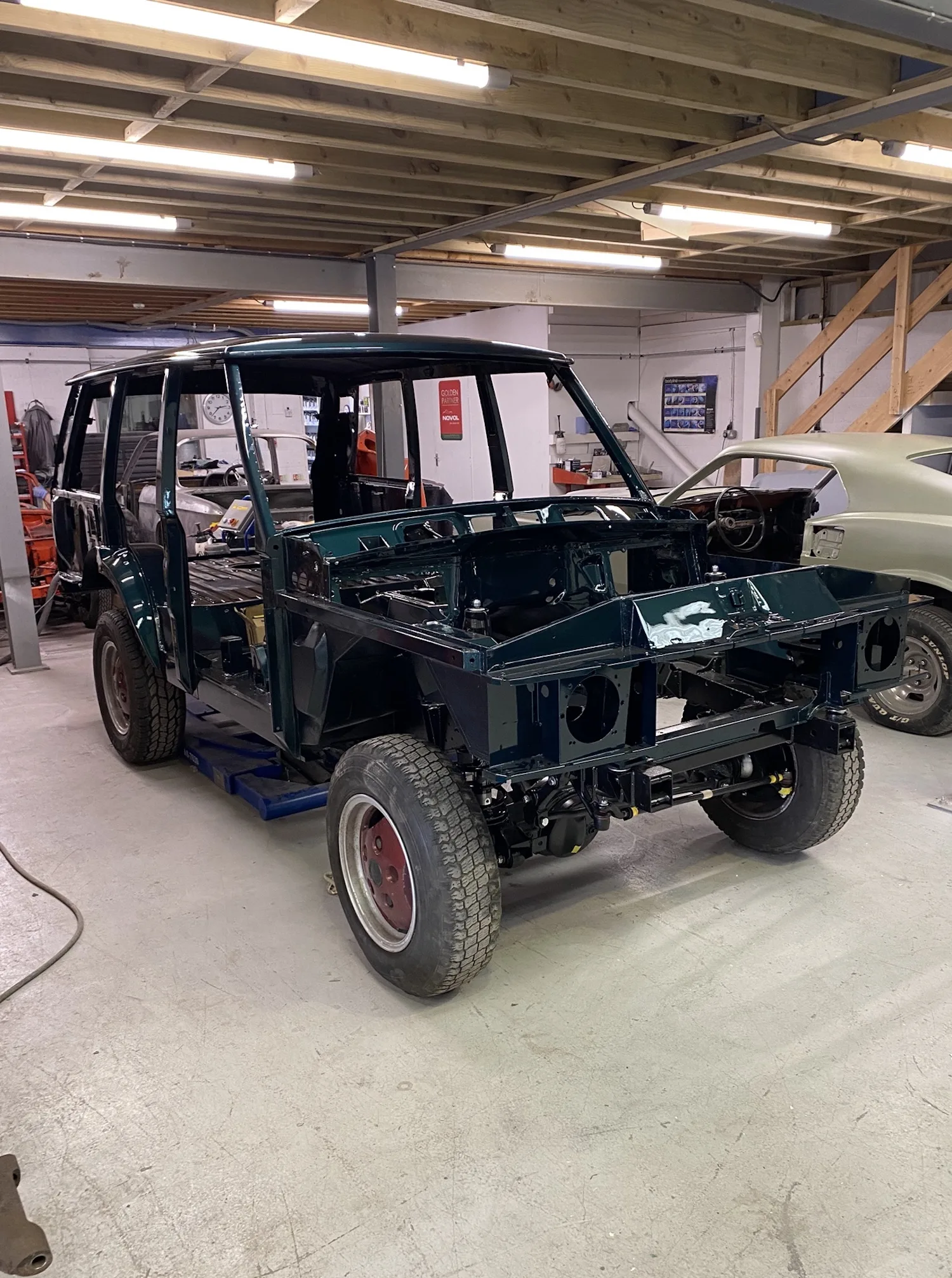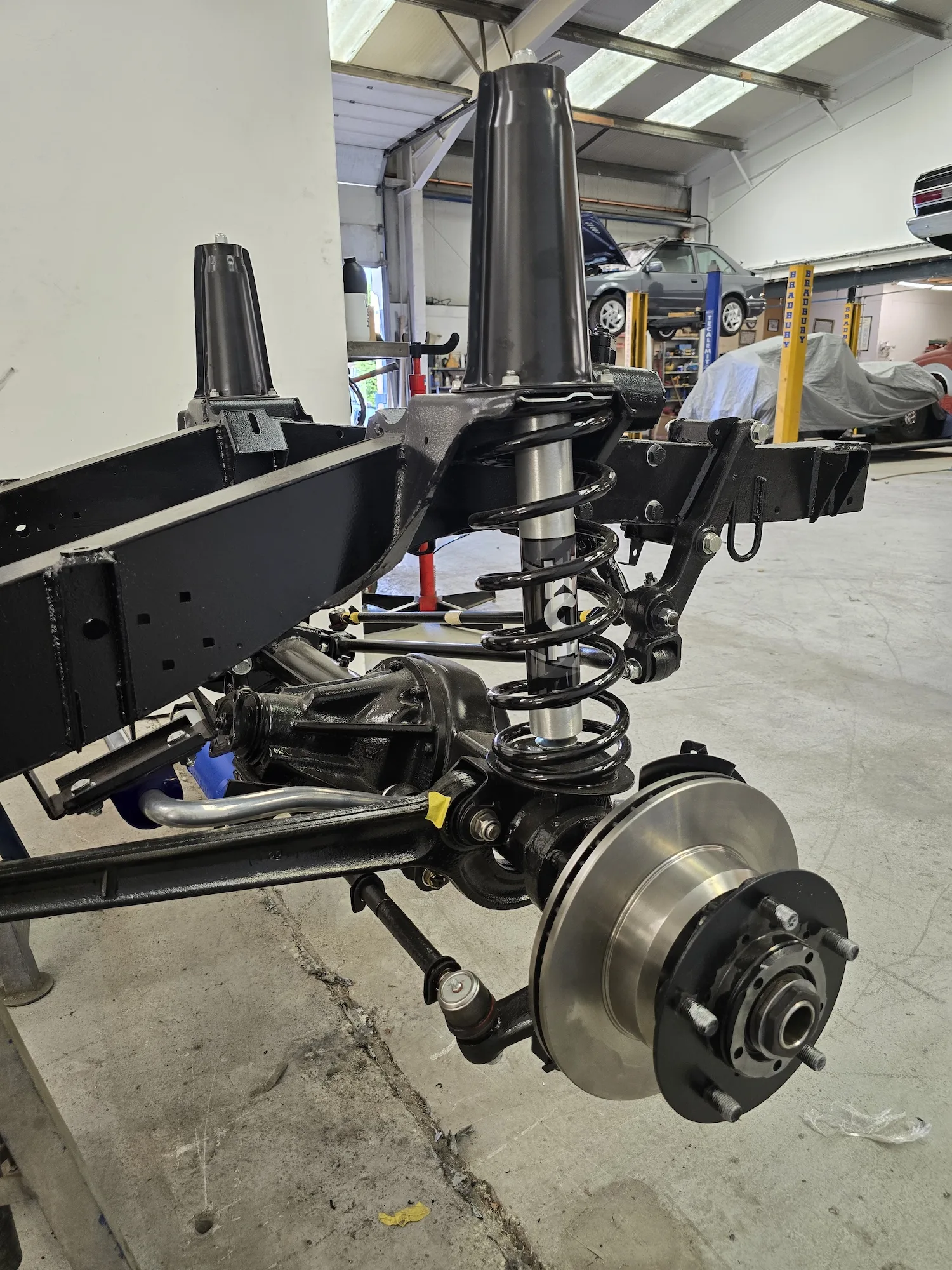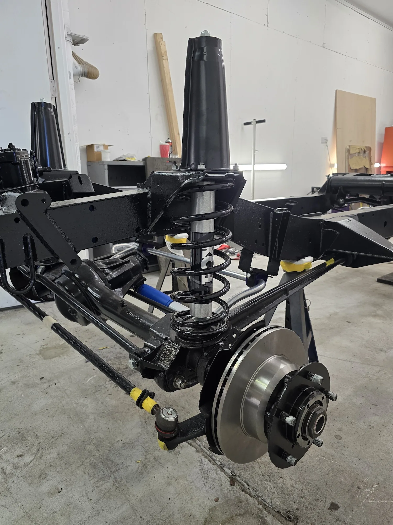 More parts have been fitted on the new chassis, including front and rear axles, new suspension, and brake discs. It will soon become a rolling chassis, and the body will be put on to check for correct door gaps.