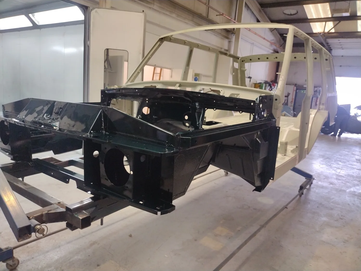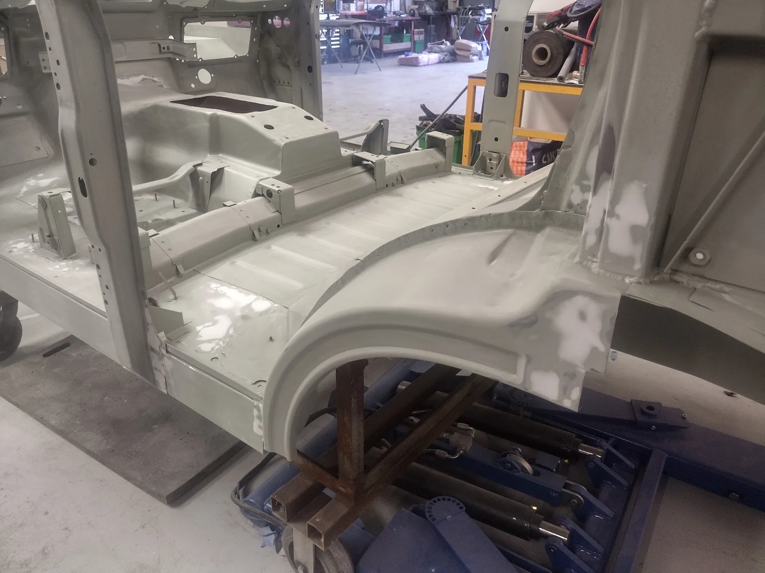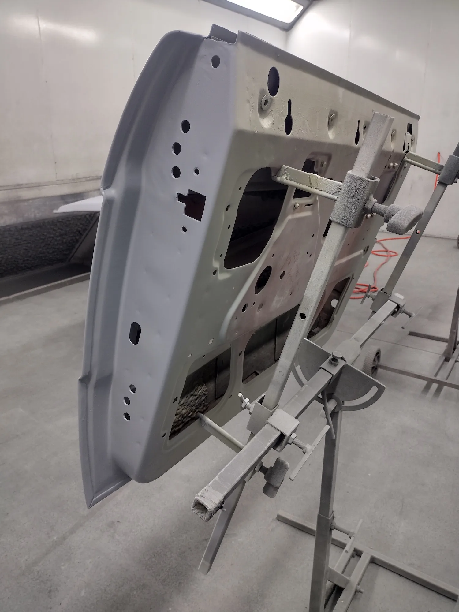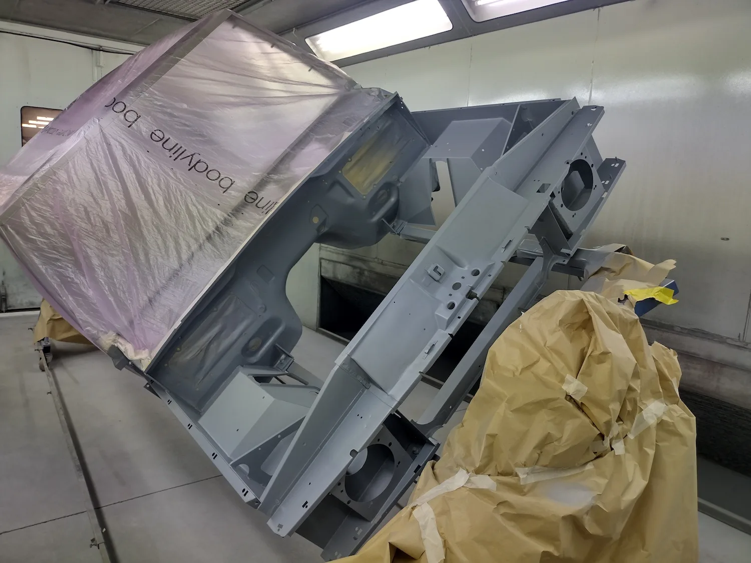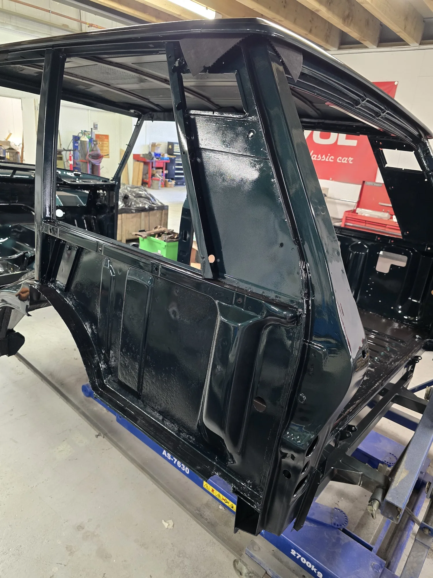 8th November 2024: The body has now been painted with primer after the first stage of prep has been carried out. The new chassis has arrived and has been painted with polycoat protect. The doors and panels have started to be stripped and prepped for paint.
