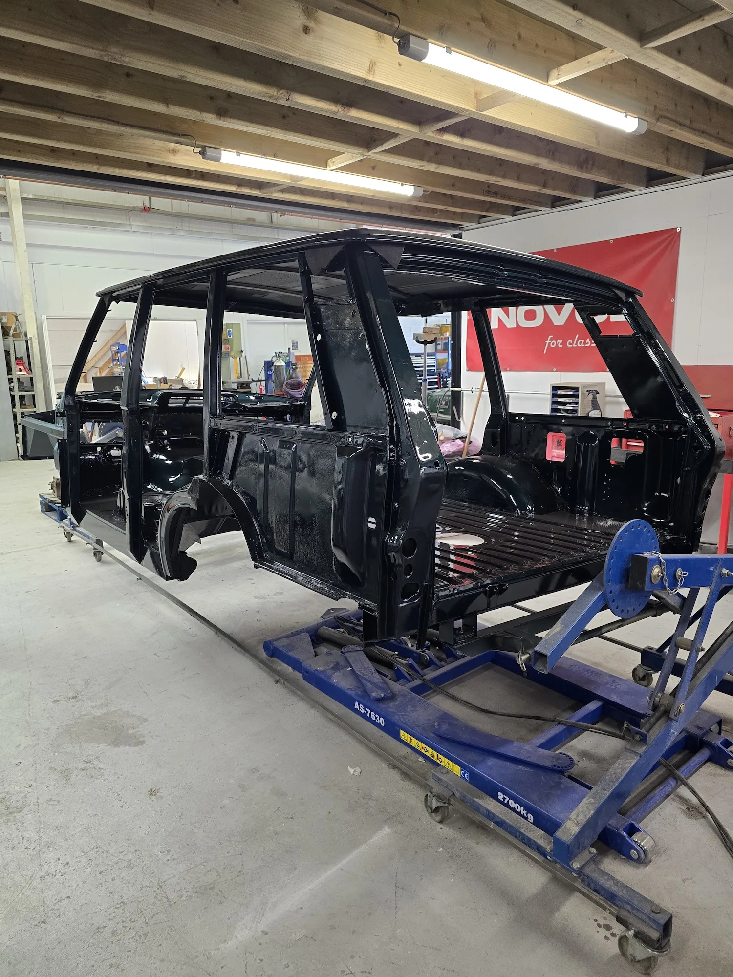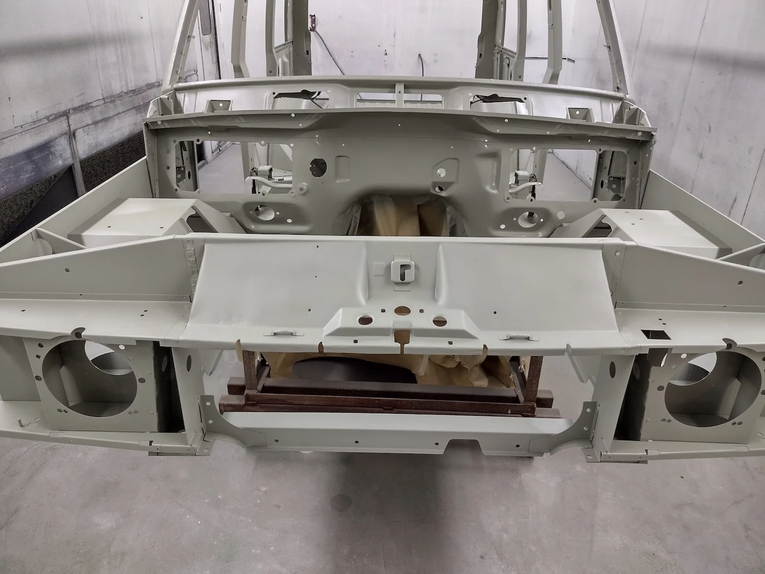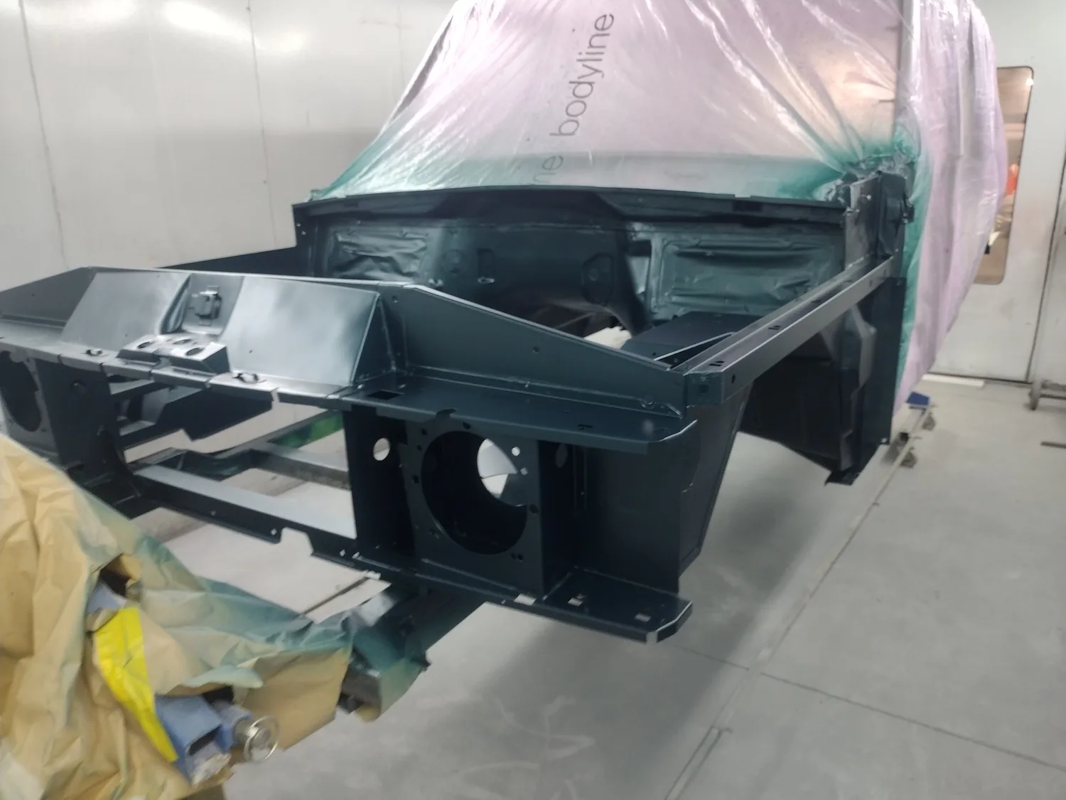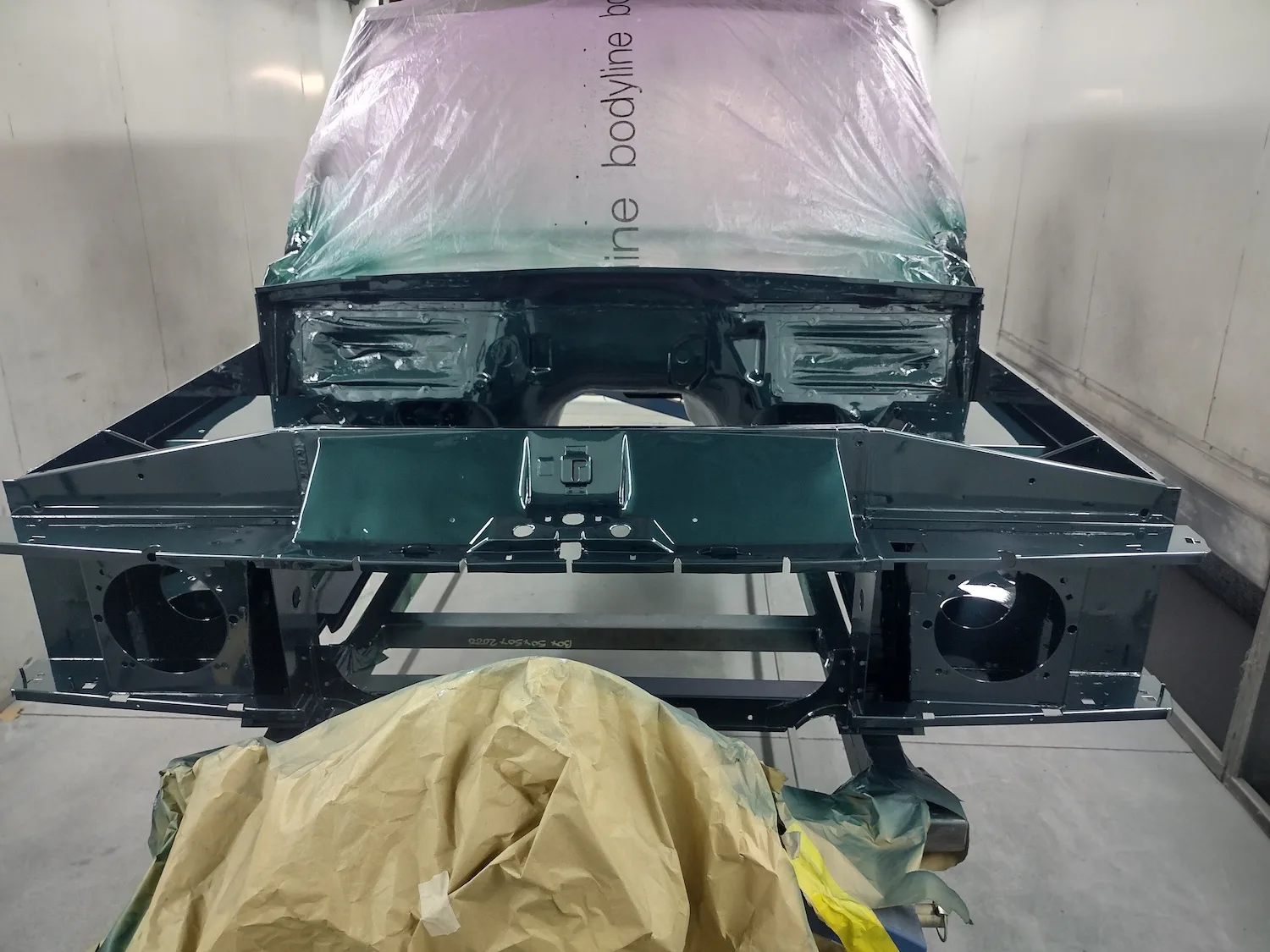 8th November 2024: The body has now been painted with primer after the first stage of prep has been carried out. The new chassis has arrived and has been painted with polycoat protect. The doors and panels have started to be stripped and prepped for paint.