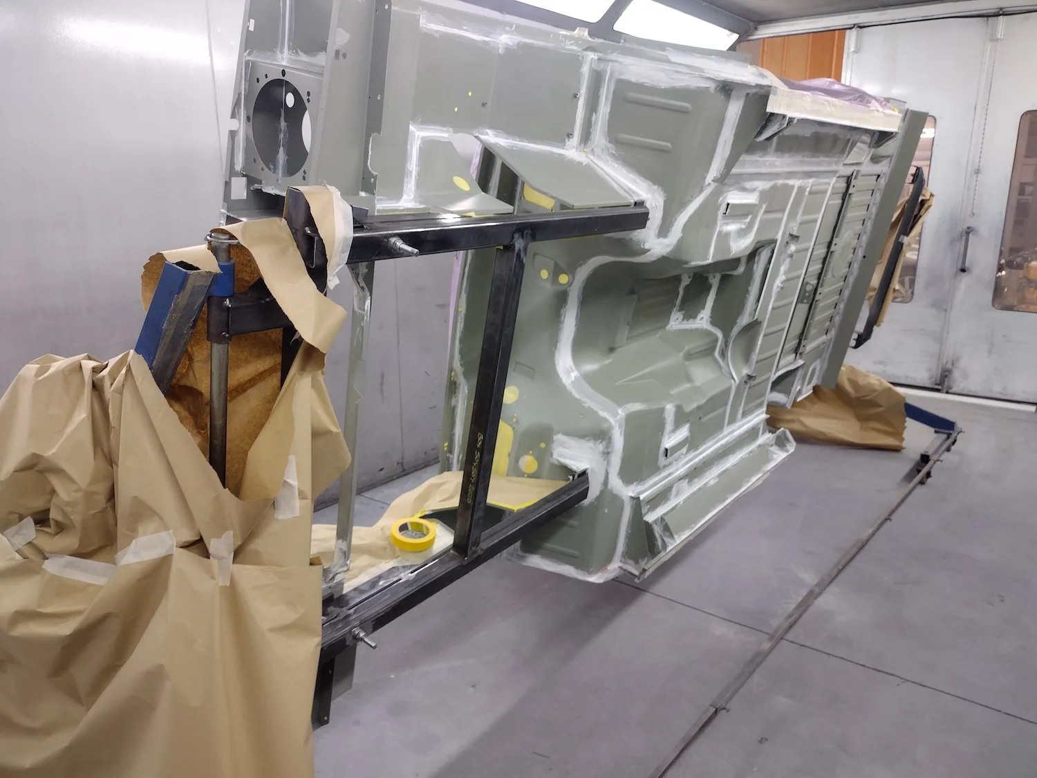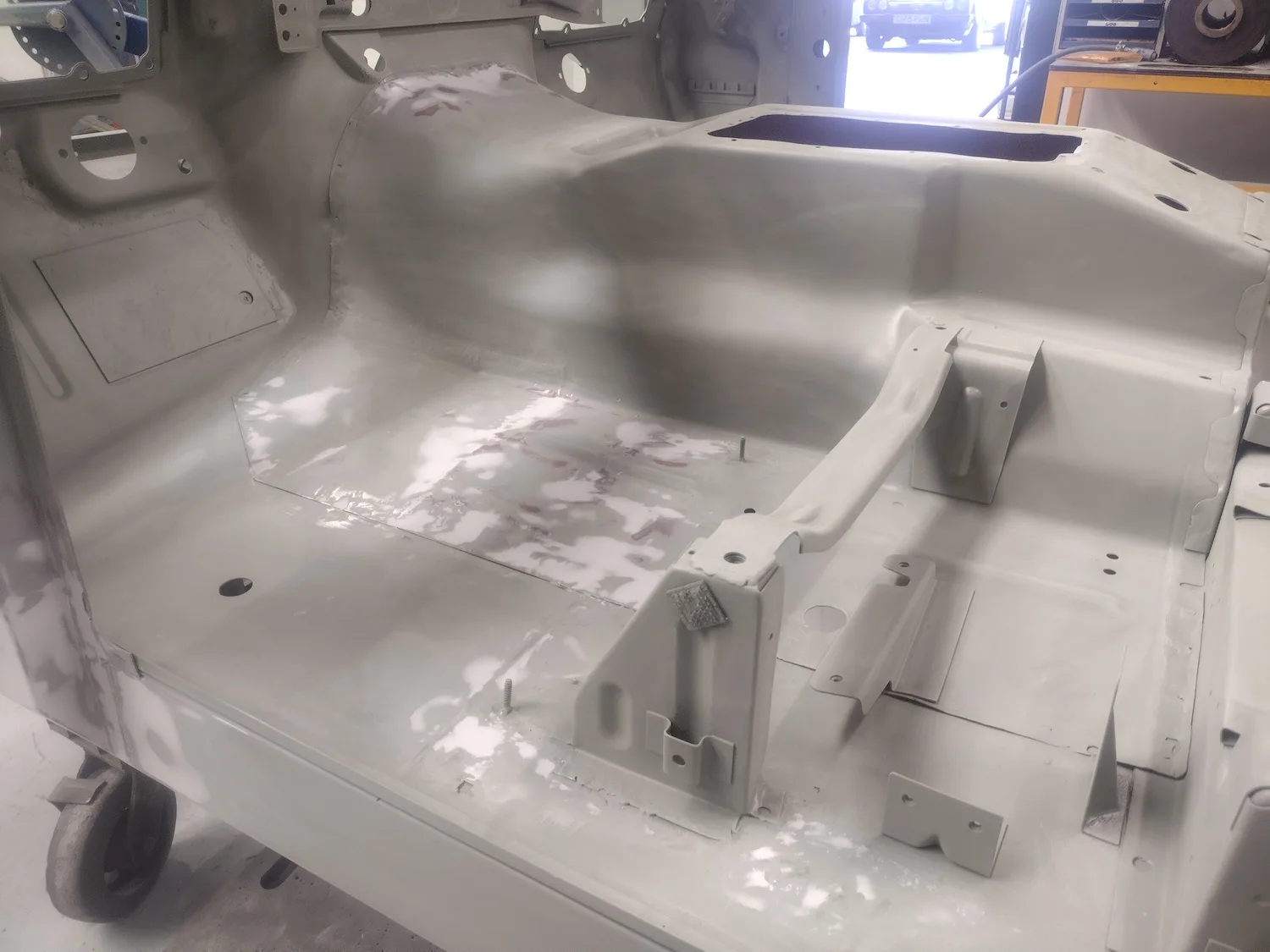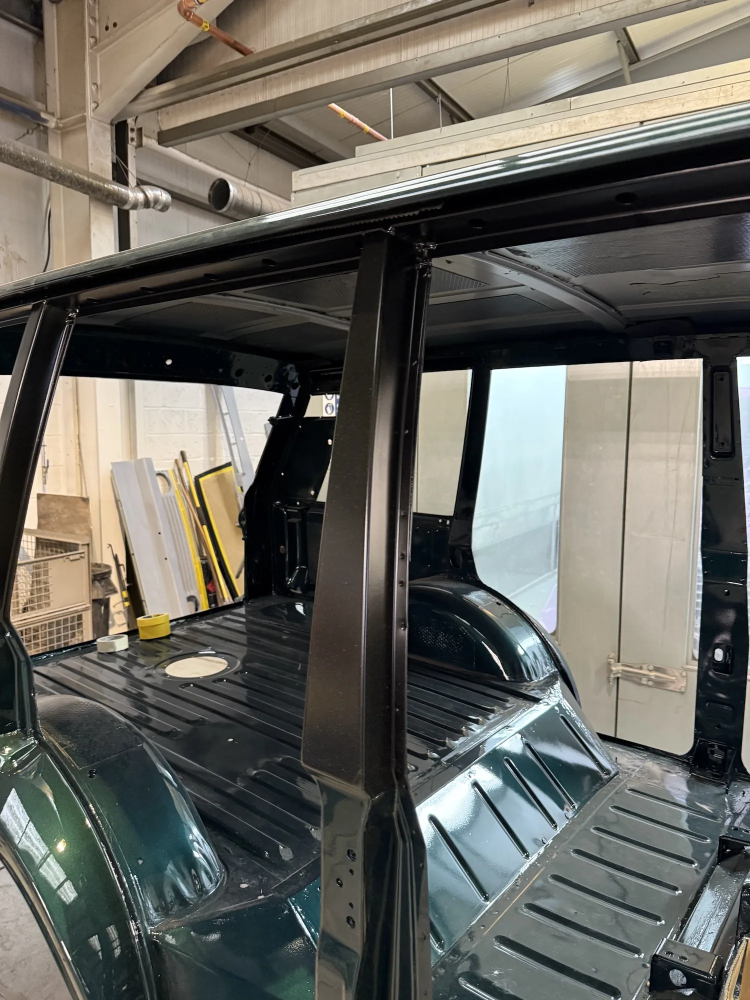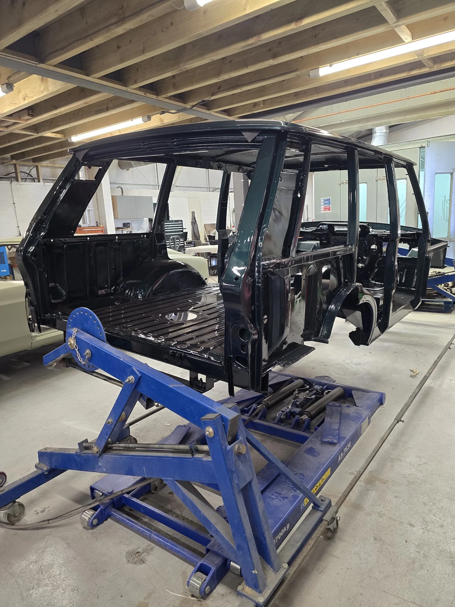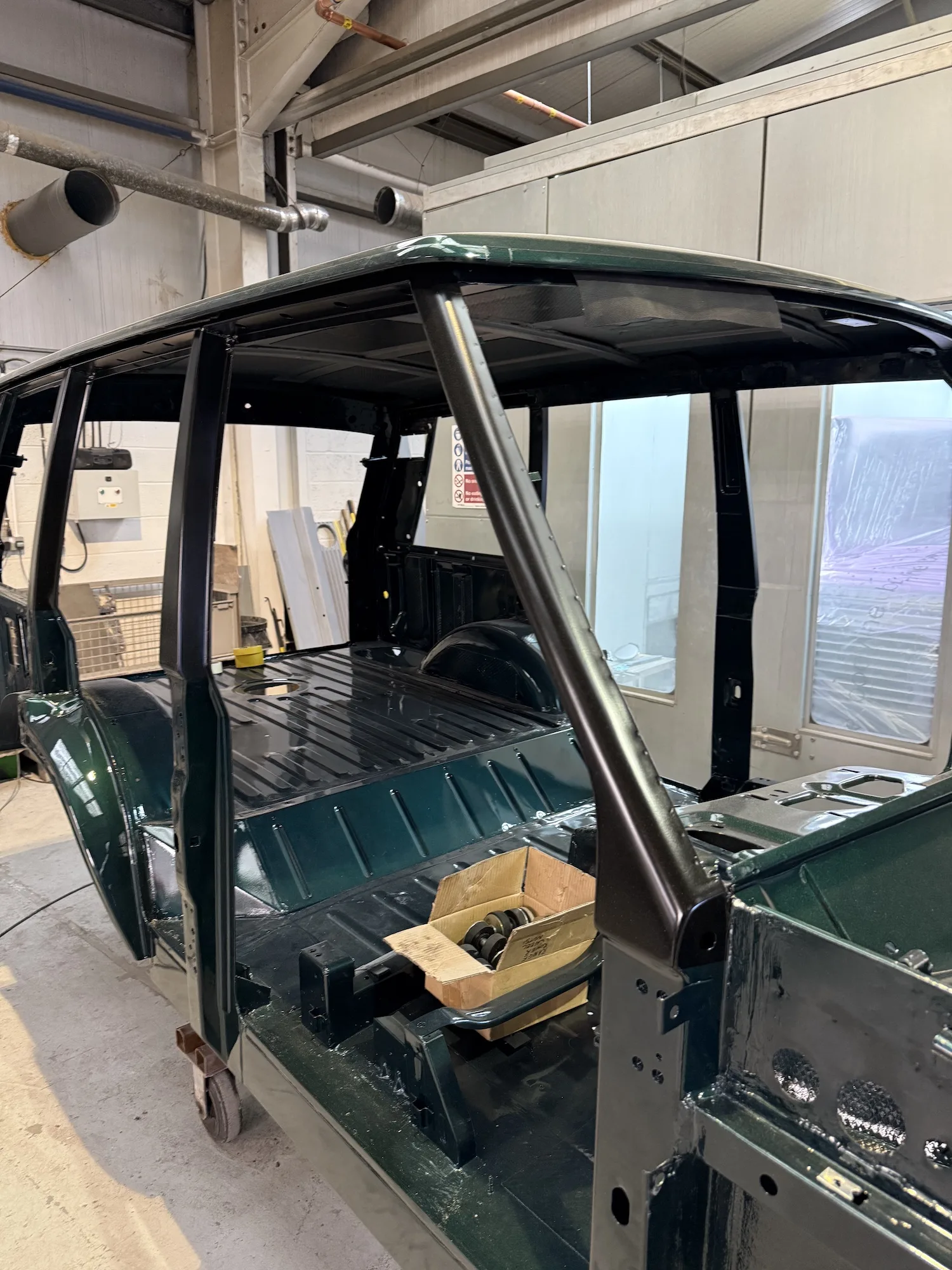 8th November 2024: The body has now been painted with primer after the first stage of prep has been carried out. The new chassis has arrived and has been painted with polycoat protect. The doors and panels have started to be stripped and prepped for paint.