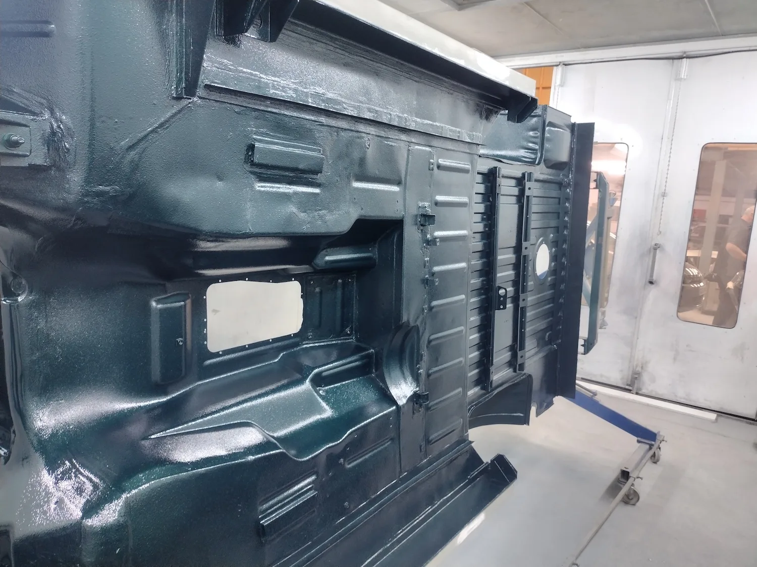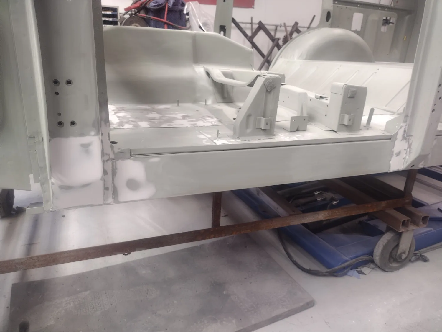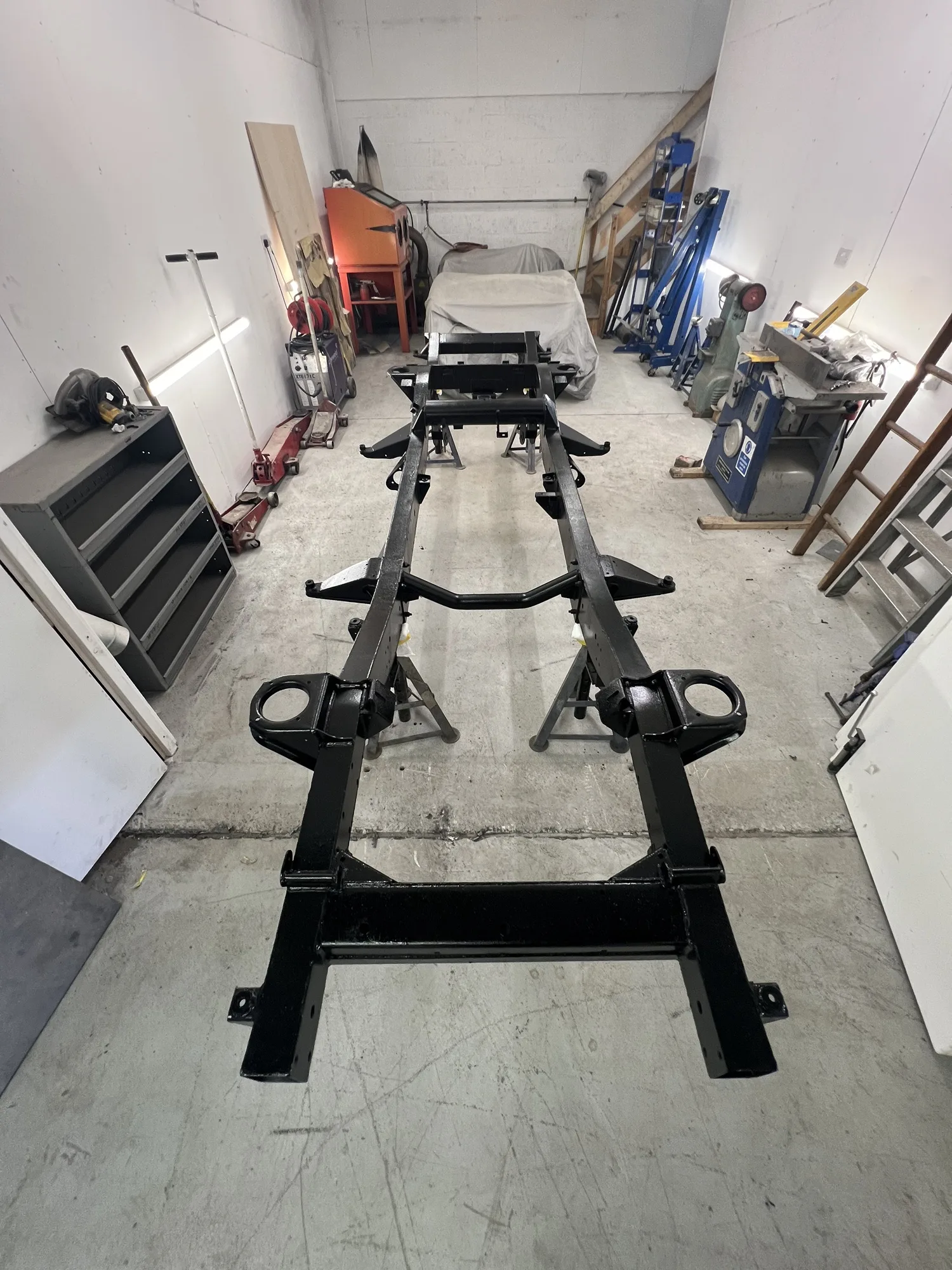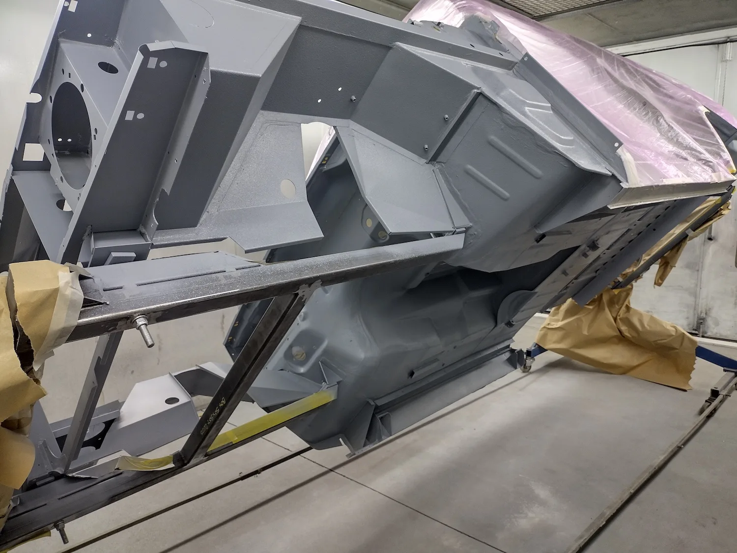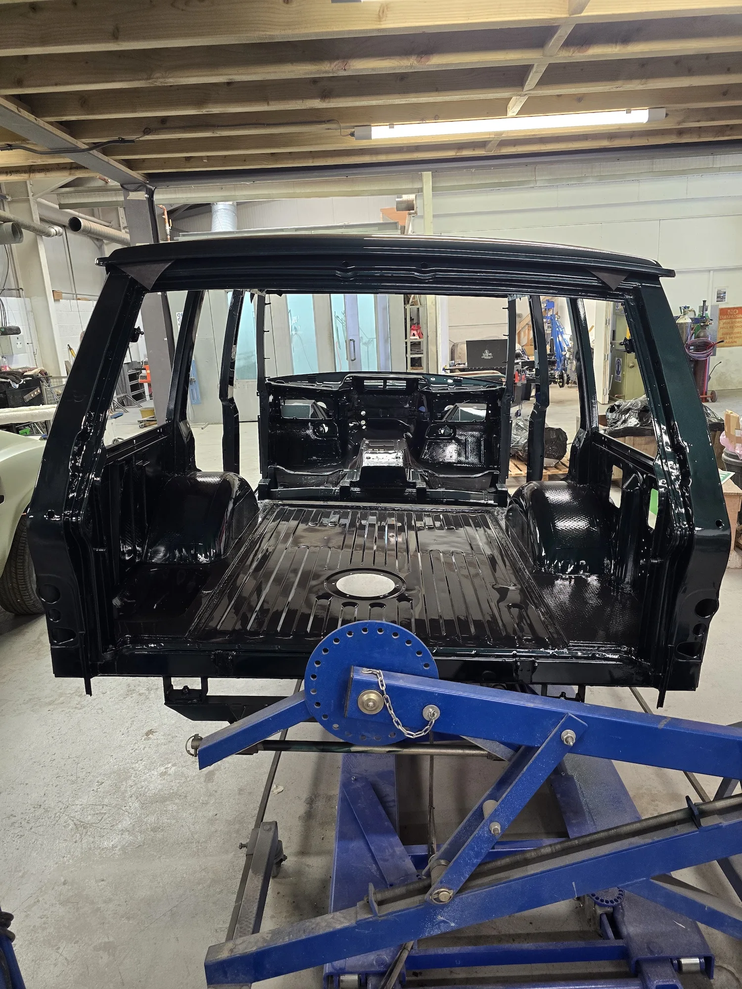 8th November 2024: The body has now been painted with primer after the first stage of prep has been carried out. The new chassis has arrived and has been painted with polycoat protect. The doors and panels have started to be stripped and prepped for paint.