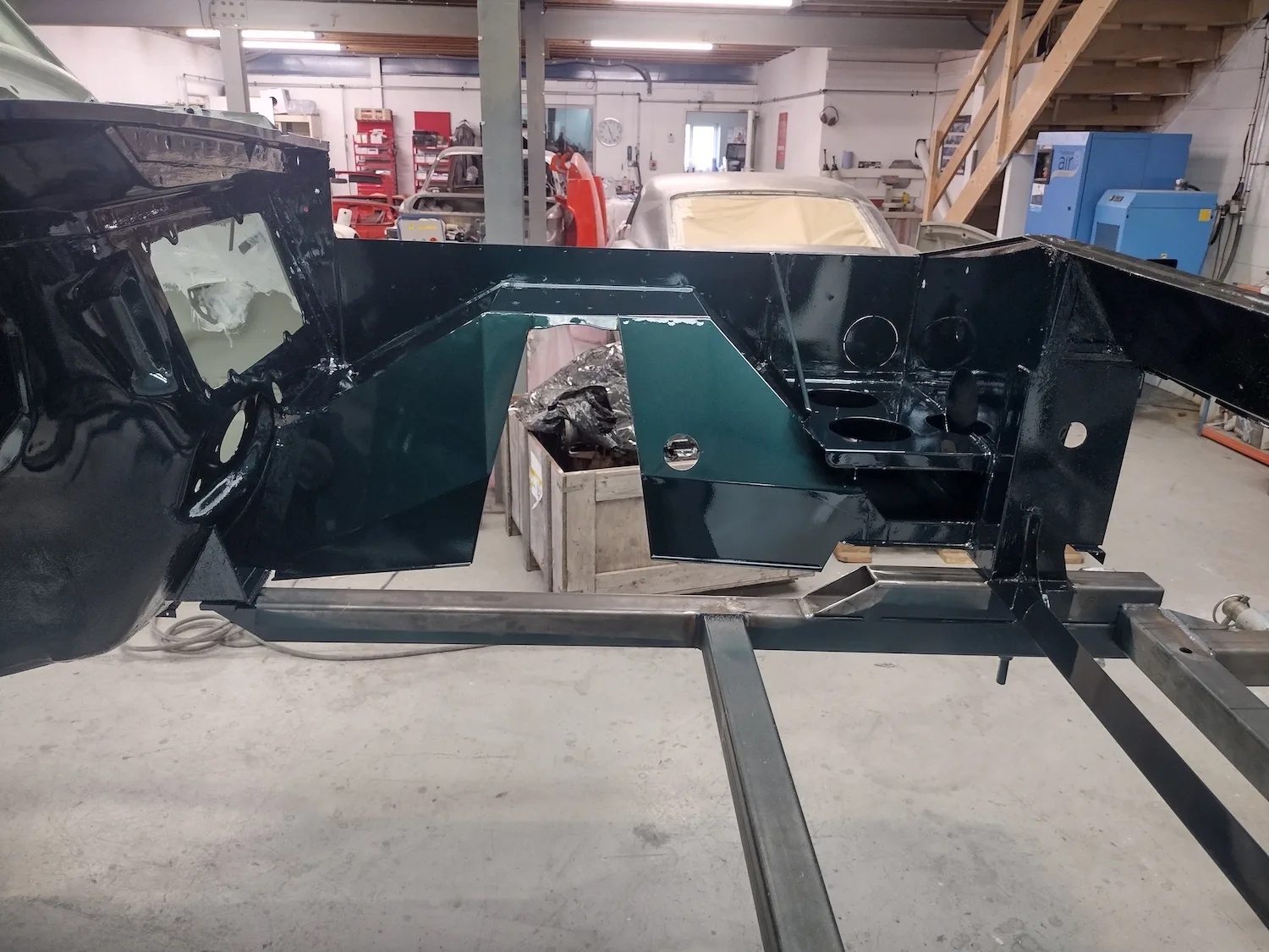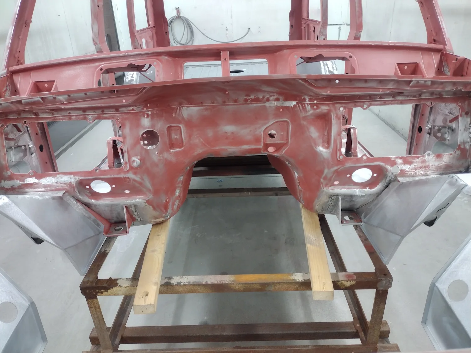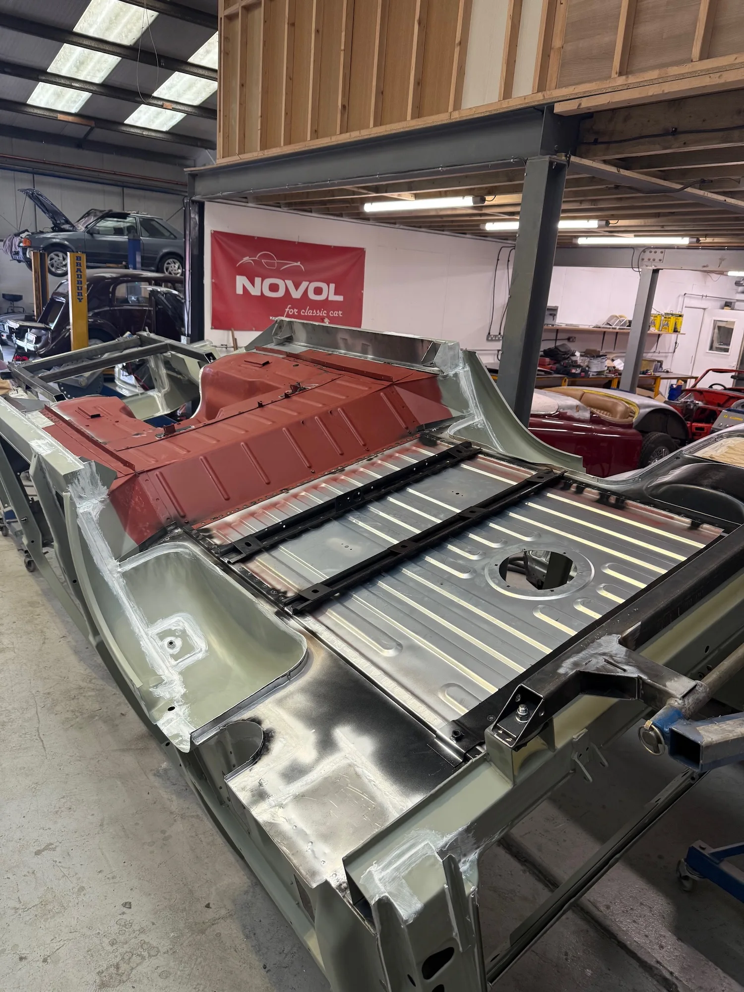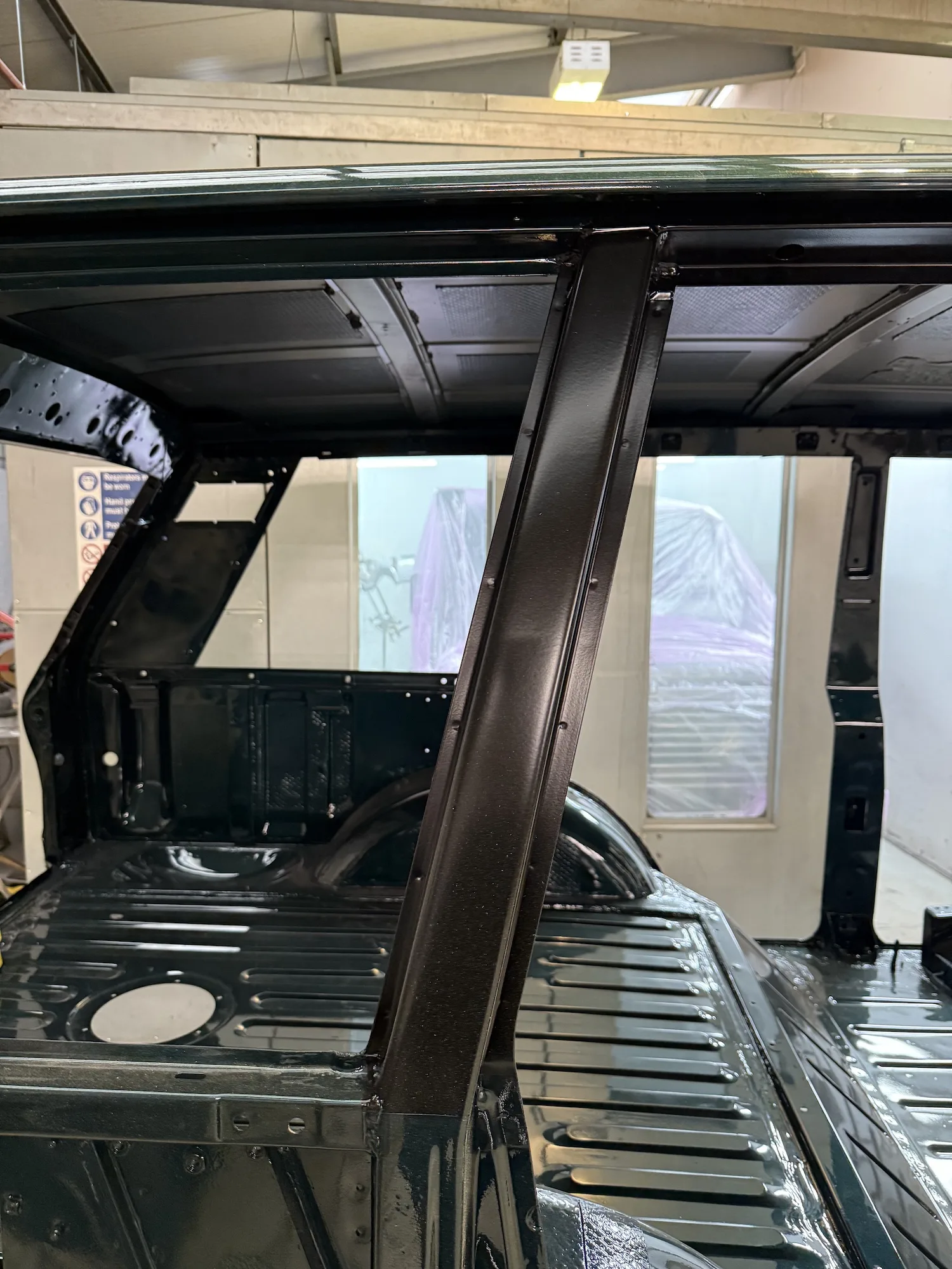 8th November 2024: The body has now been painted with primer after the first stage of prep has been carried out. The new chassis has arrived and has been painted with polycoat protect. The doors and panels have started to be stripped and prepped for paint.