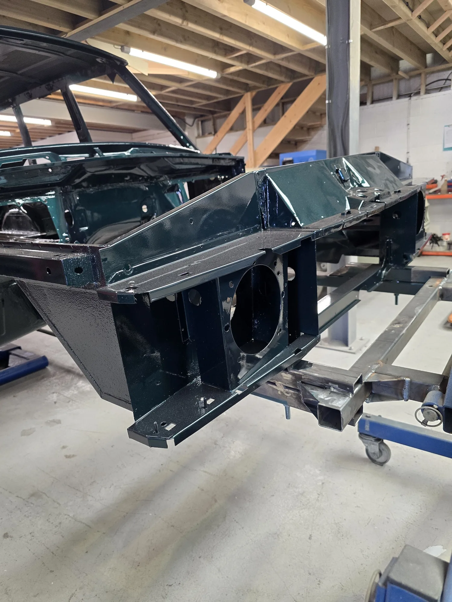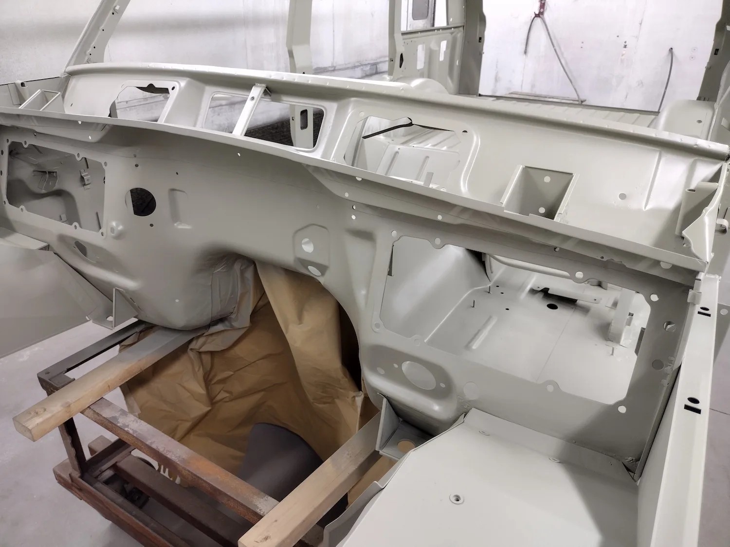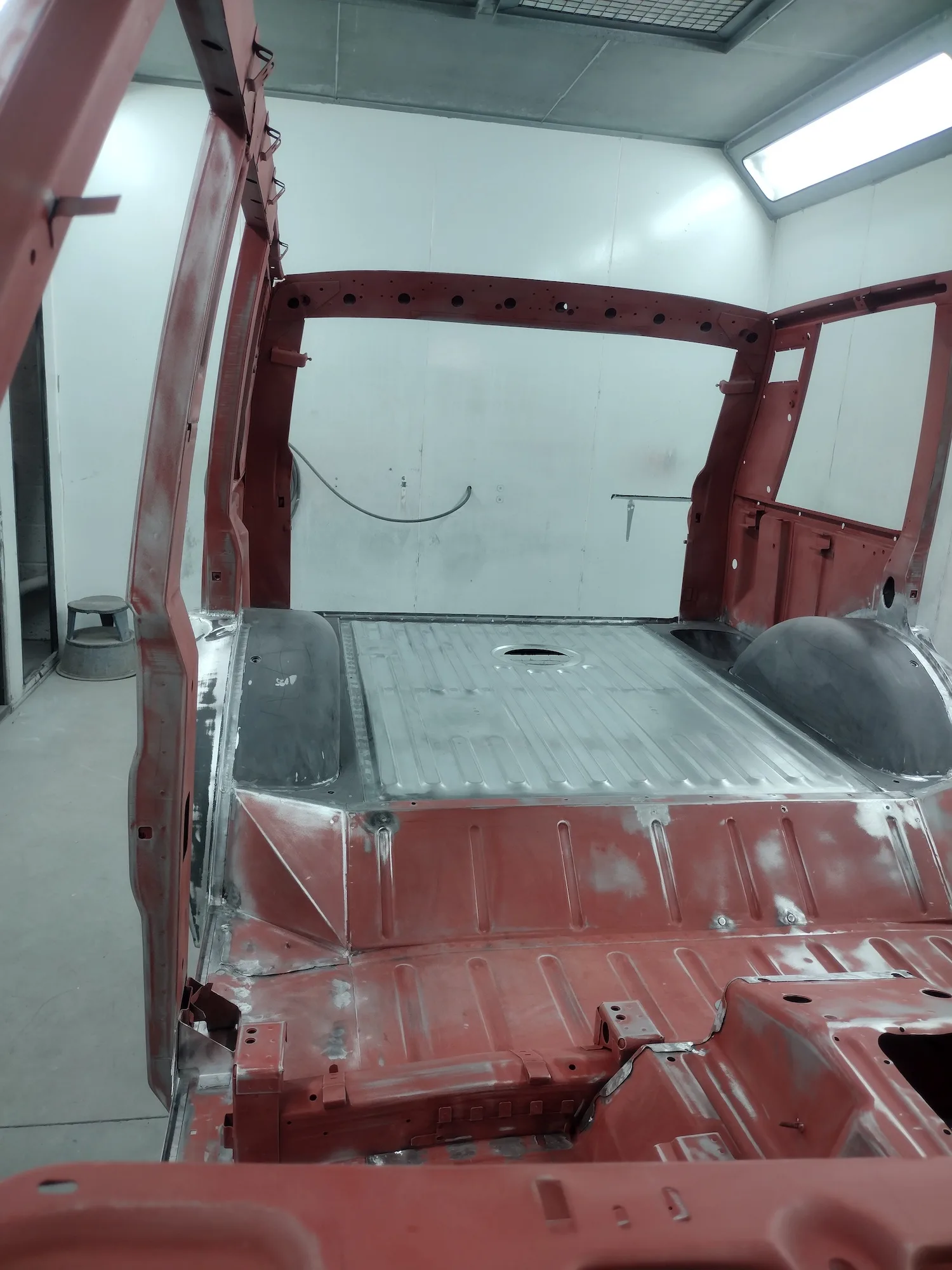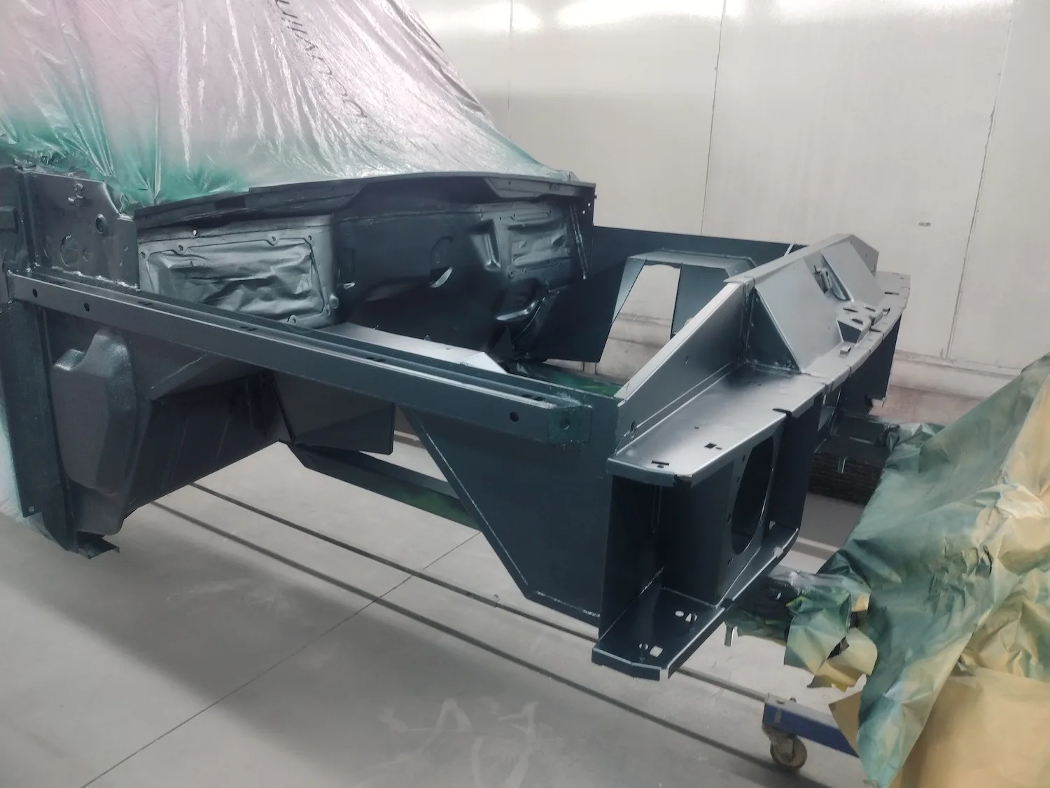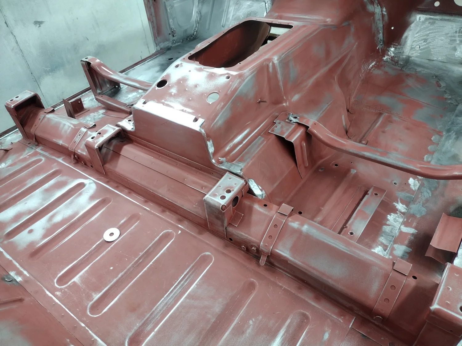 8th November 2024: The body has now been painted with primer after the first stage of prep has been carried out. The new chassis has arrived and has been painted with polycoat protect. The doors and panels have started to be stripped and prepped for paint.