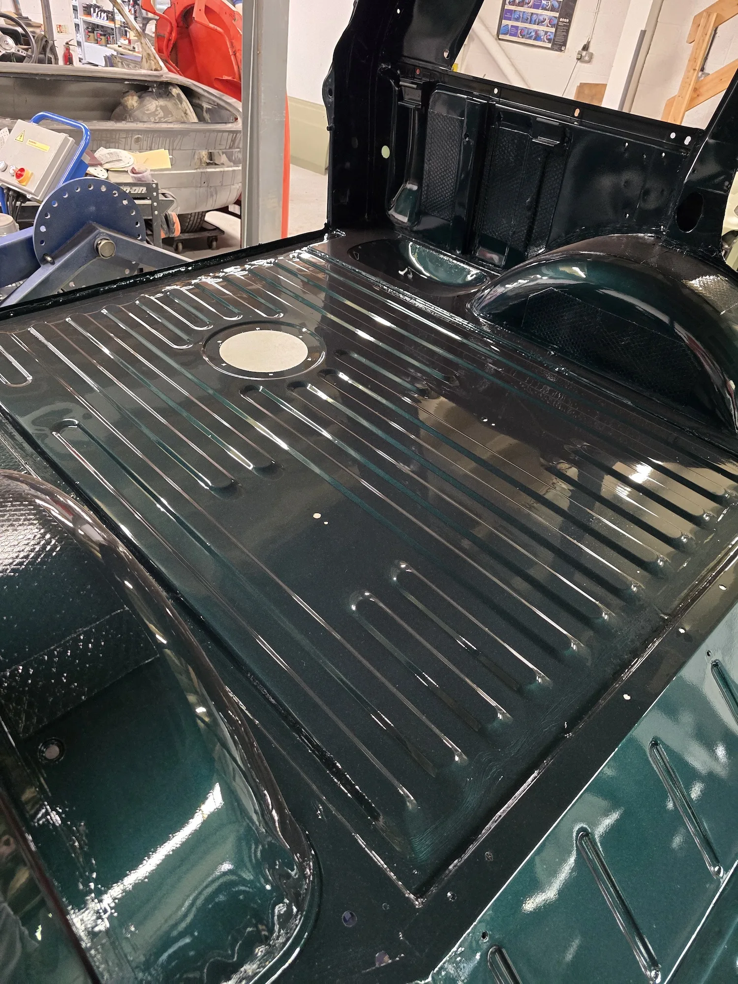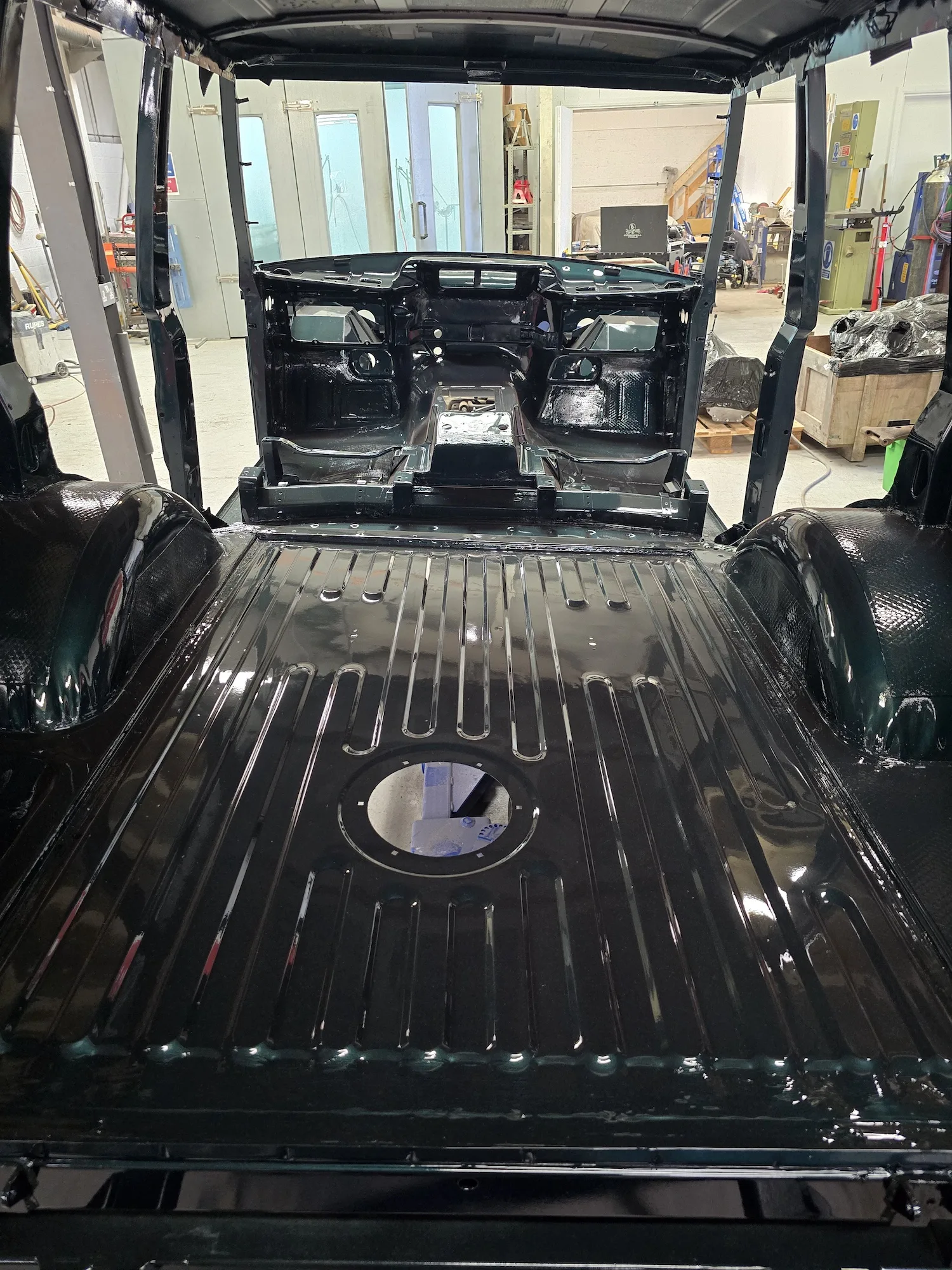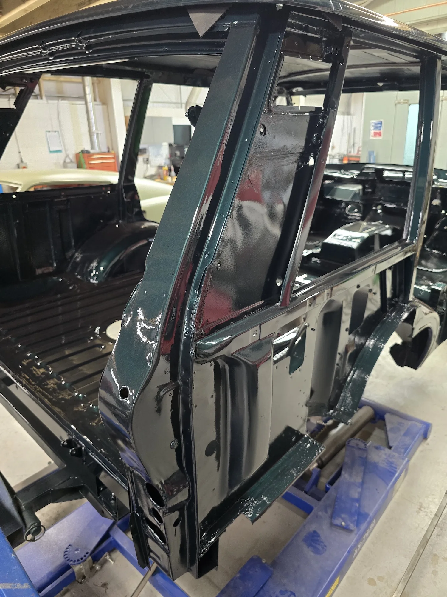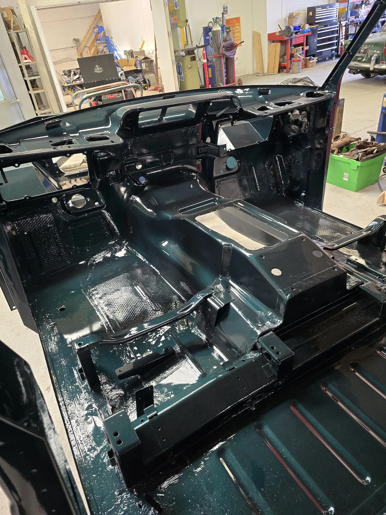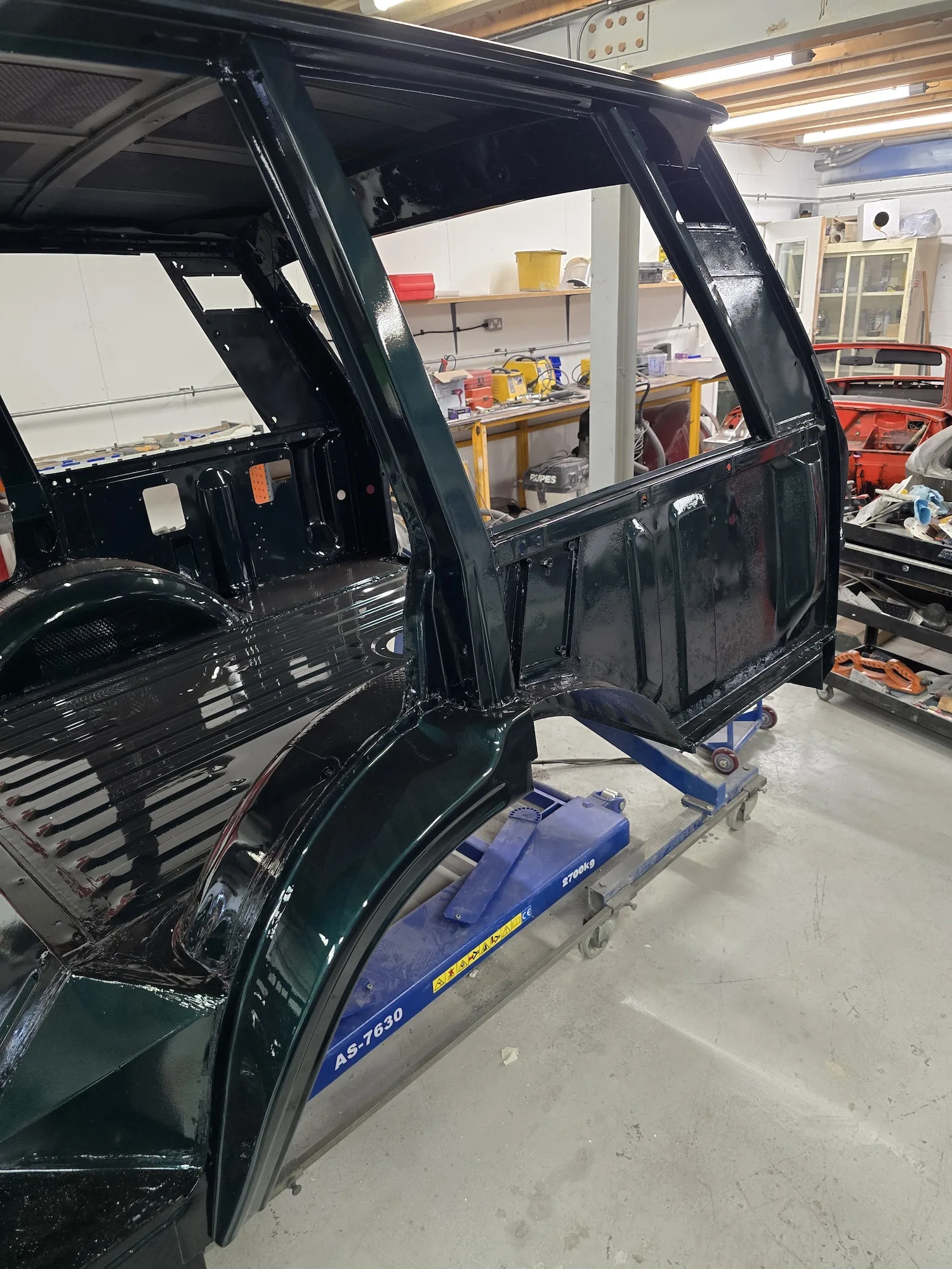 7th November 2025: Panels painted in Matt black, bumpers rear door grille and lower front valance. Green painted on doors, wings, bonnet, grille, and scuttle/wiper panel. Sneak peek of the seats which have been reupholstered in tan leather.