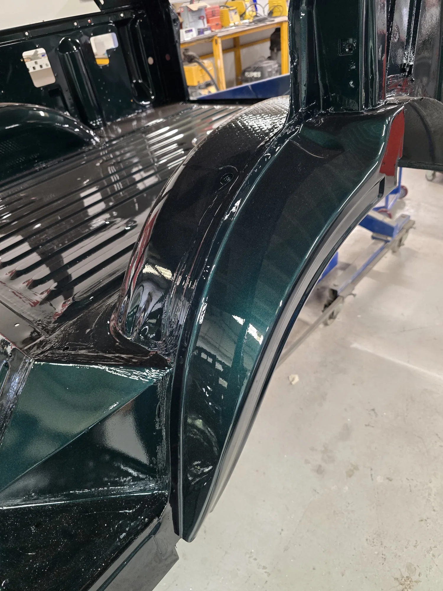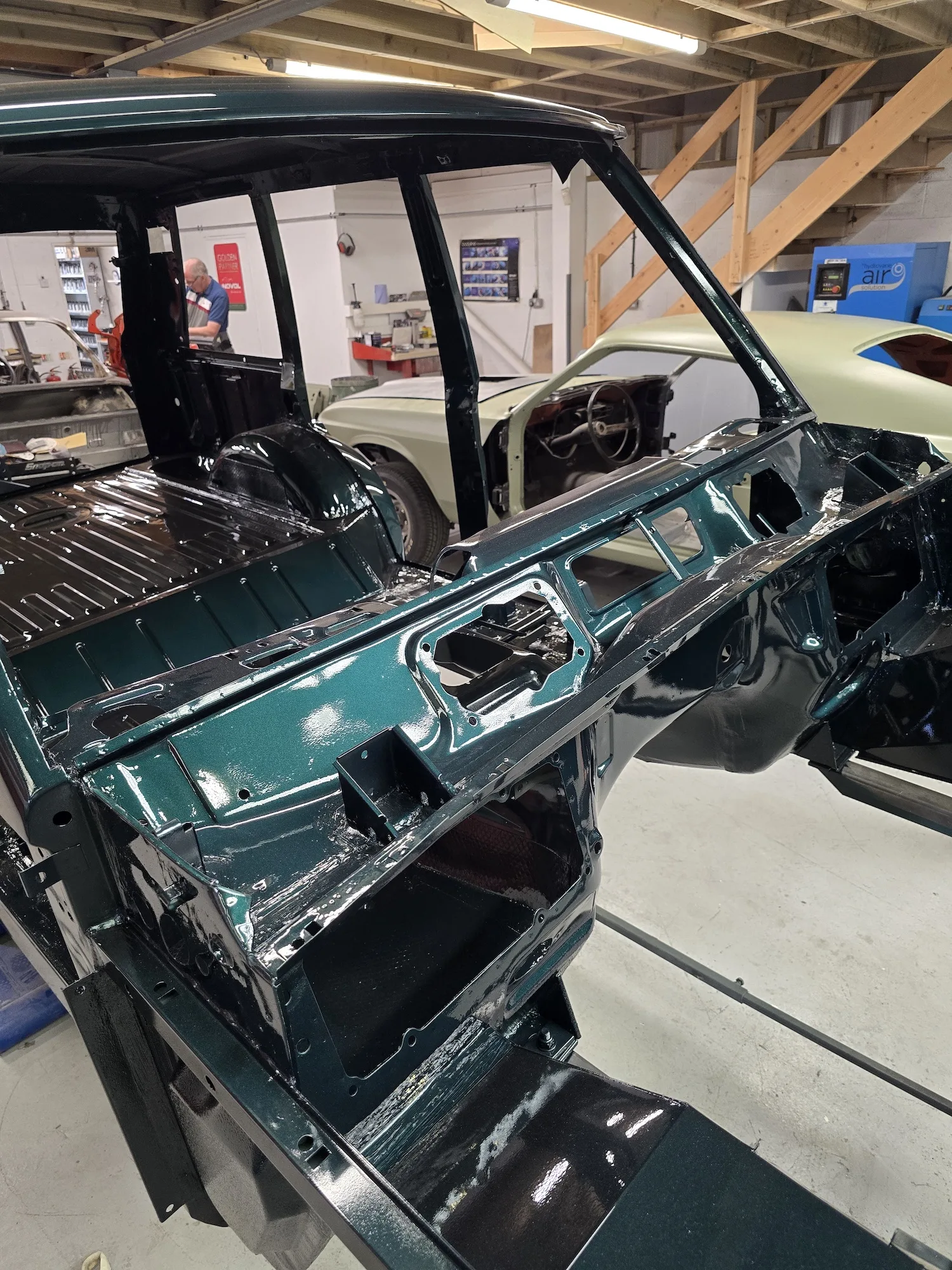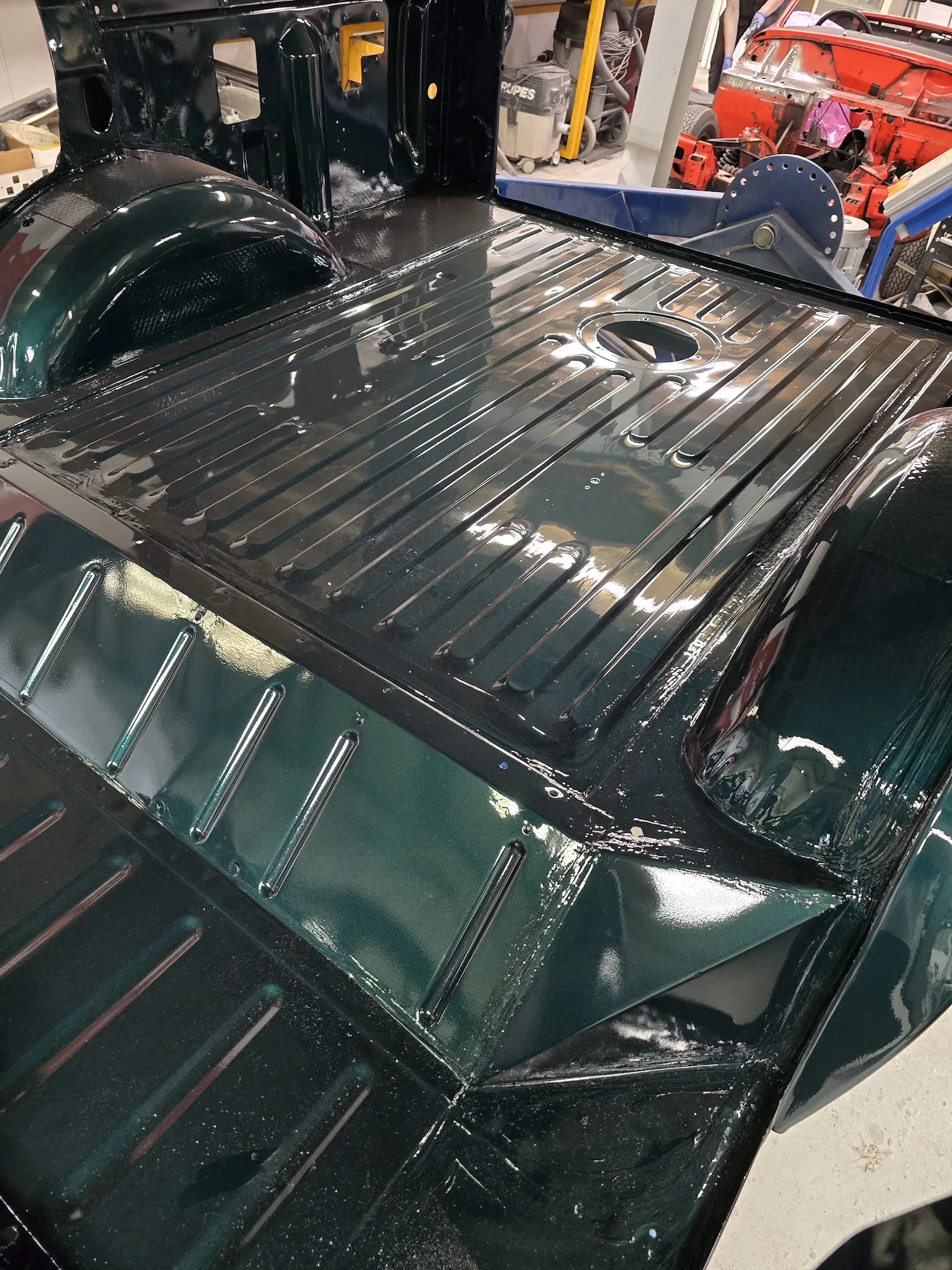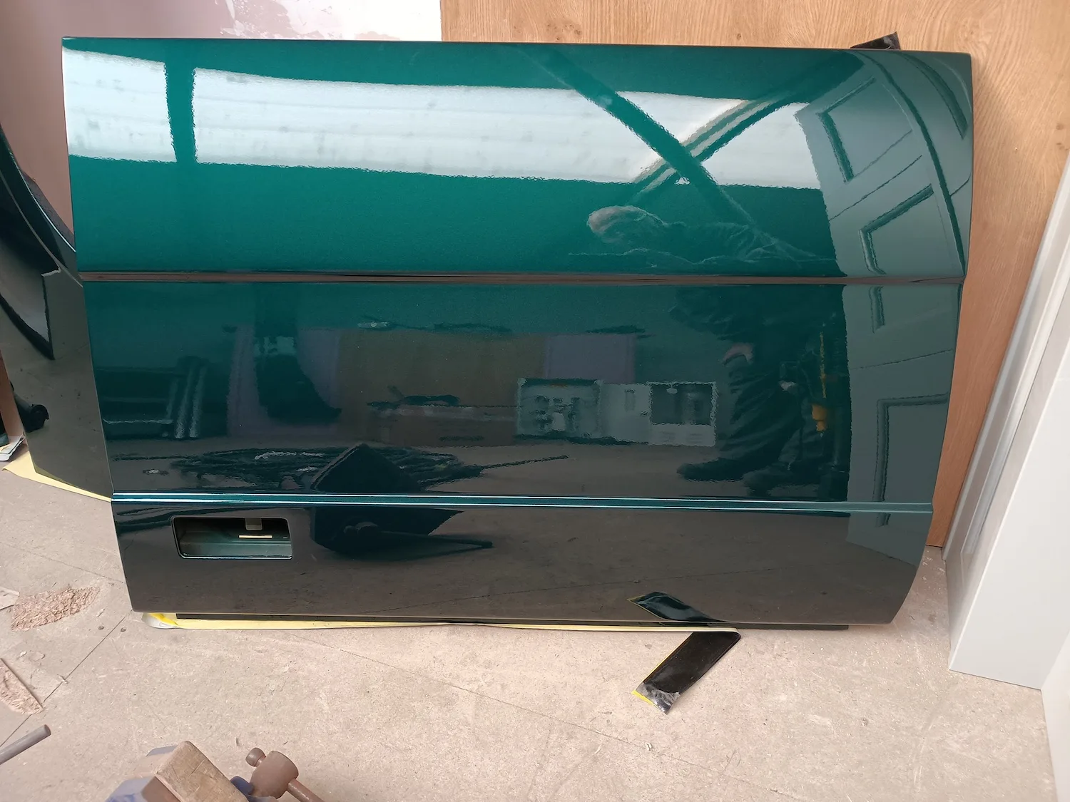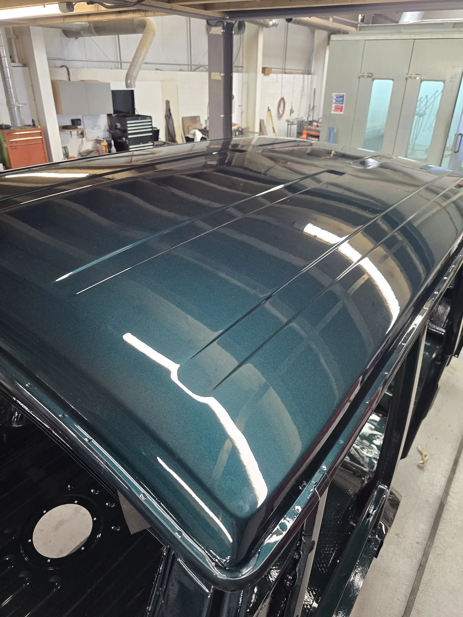 7th November 2025: Panels painted in Matt black, bumpers rear door grille and lower front valance. Green painted on doors, wings, bonnet, grille, and scuttle/wiper panel. Sneak peek of the seats which have been reupholstered in tan leather.
