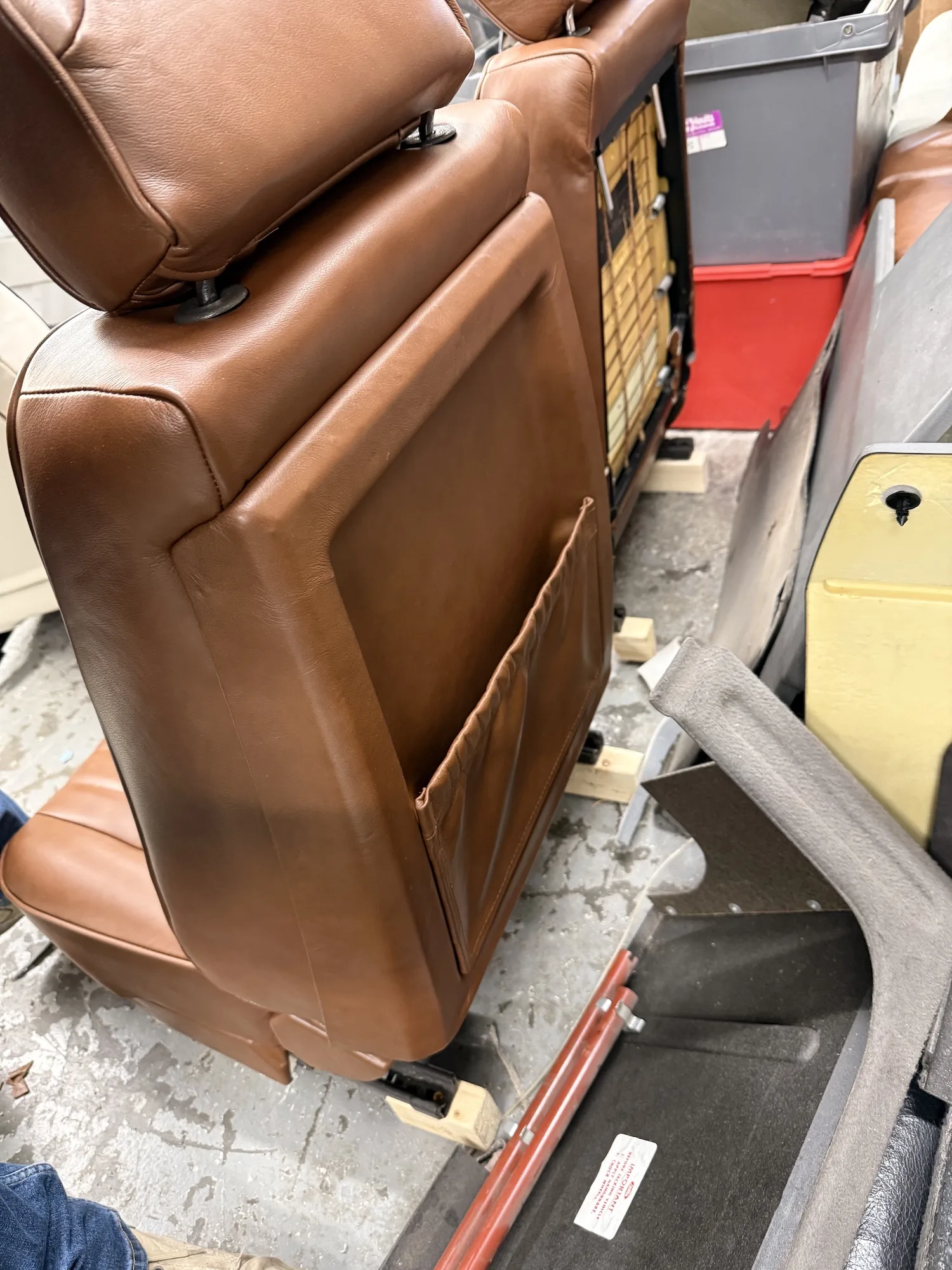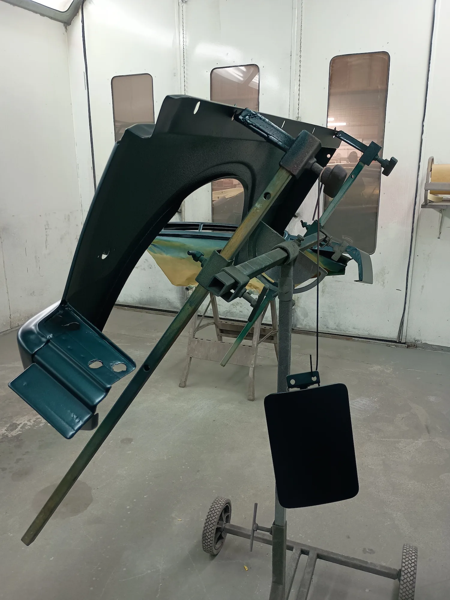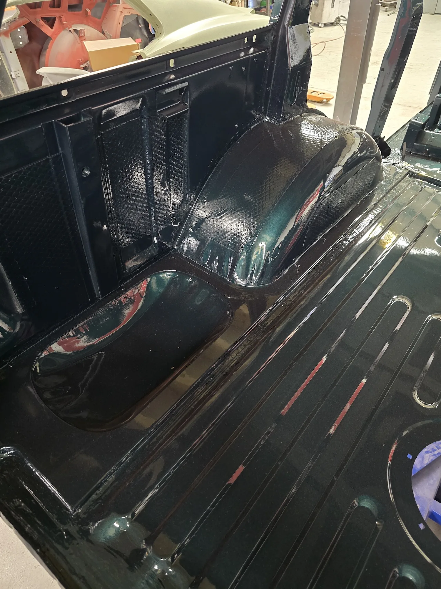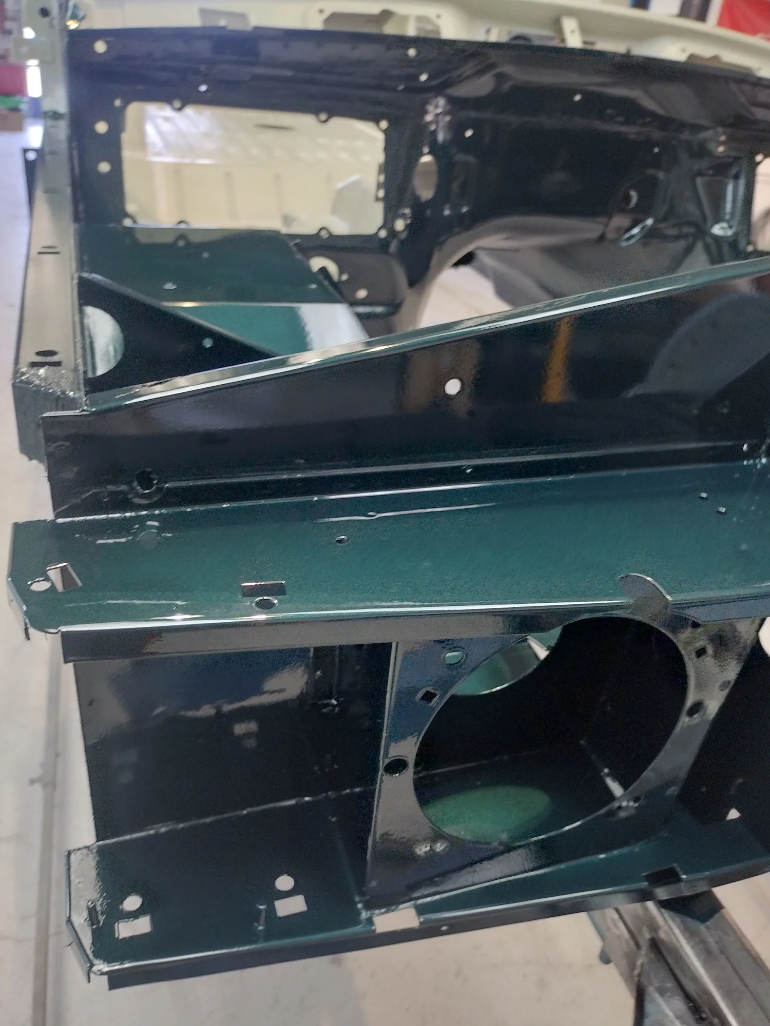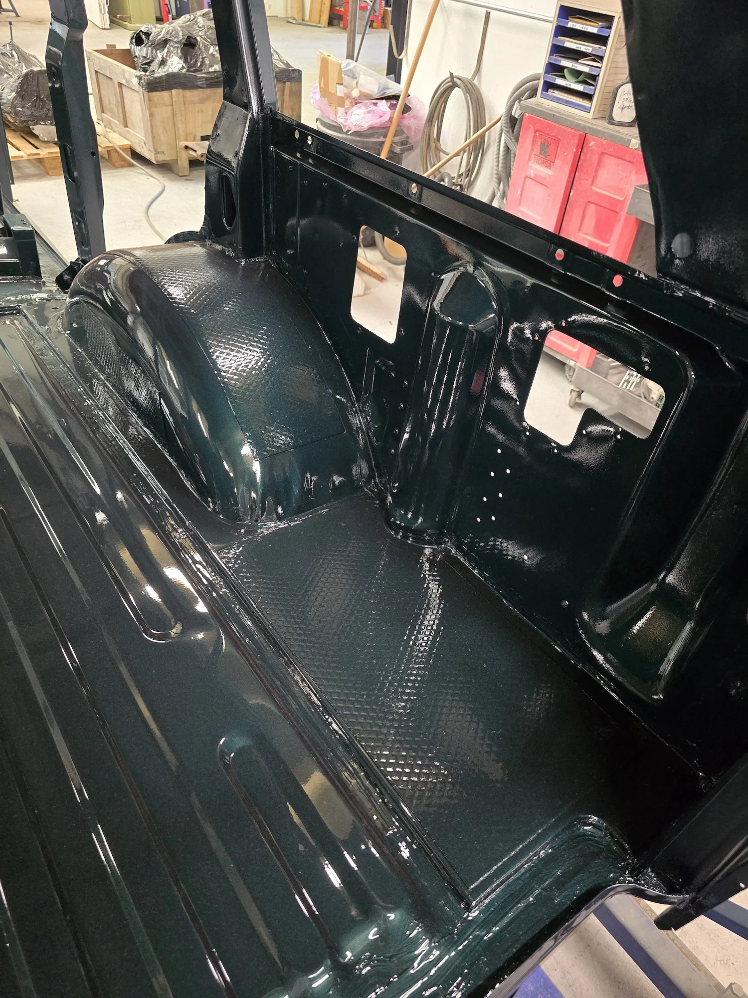 7th November 2025: Panels painted in Matt black, bumpers rear door grille and lower front valance. Green painted on doors, wings, bonnet, grille, and scuttle/wiper panel. Sneak peek of the seats which have been reupholstered in tan leather.