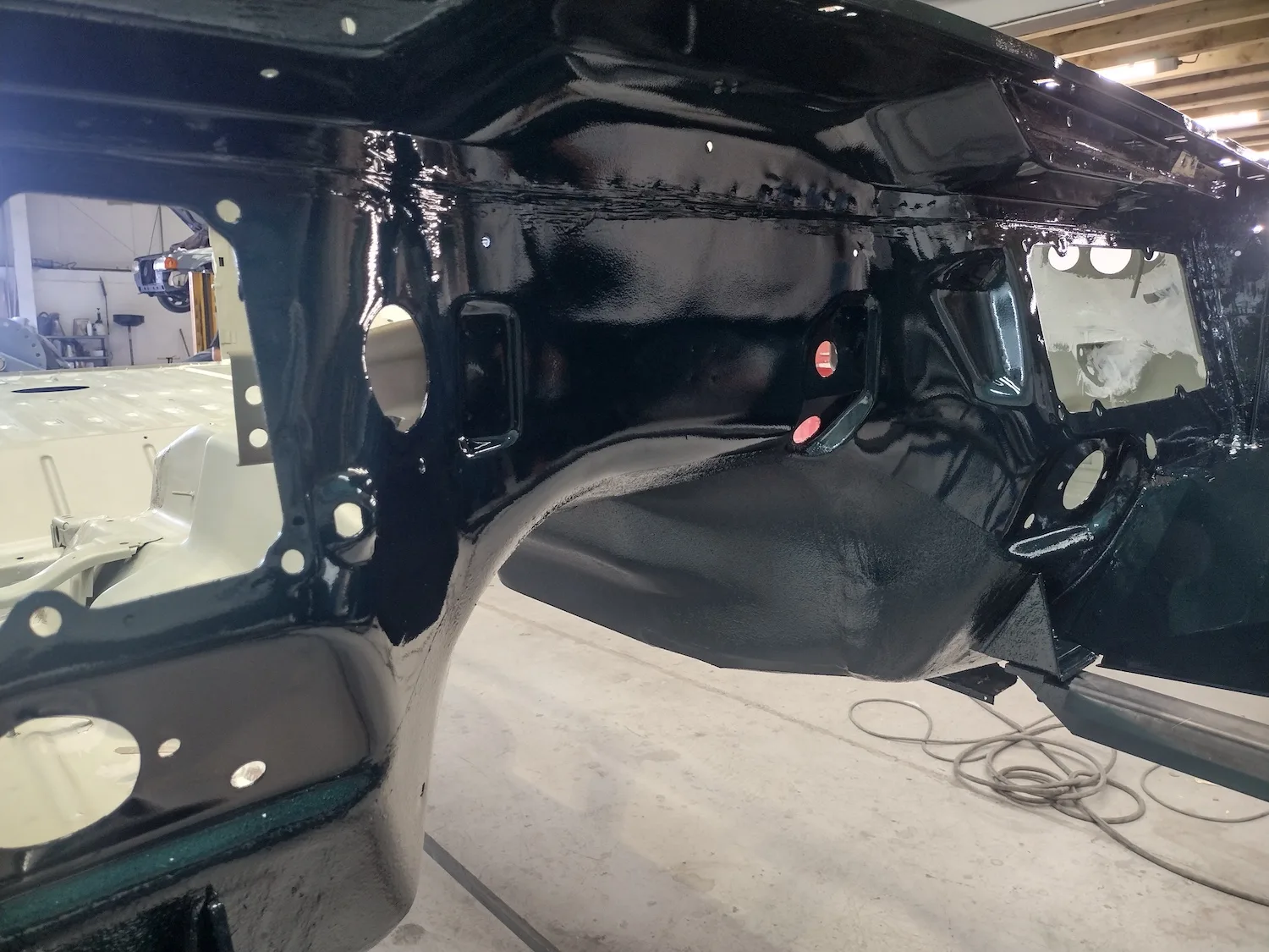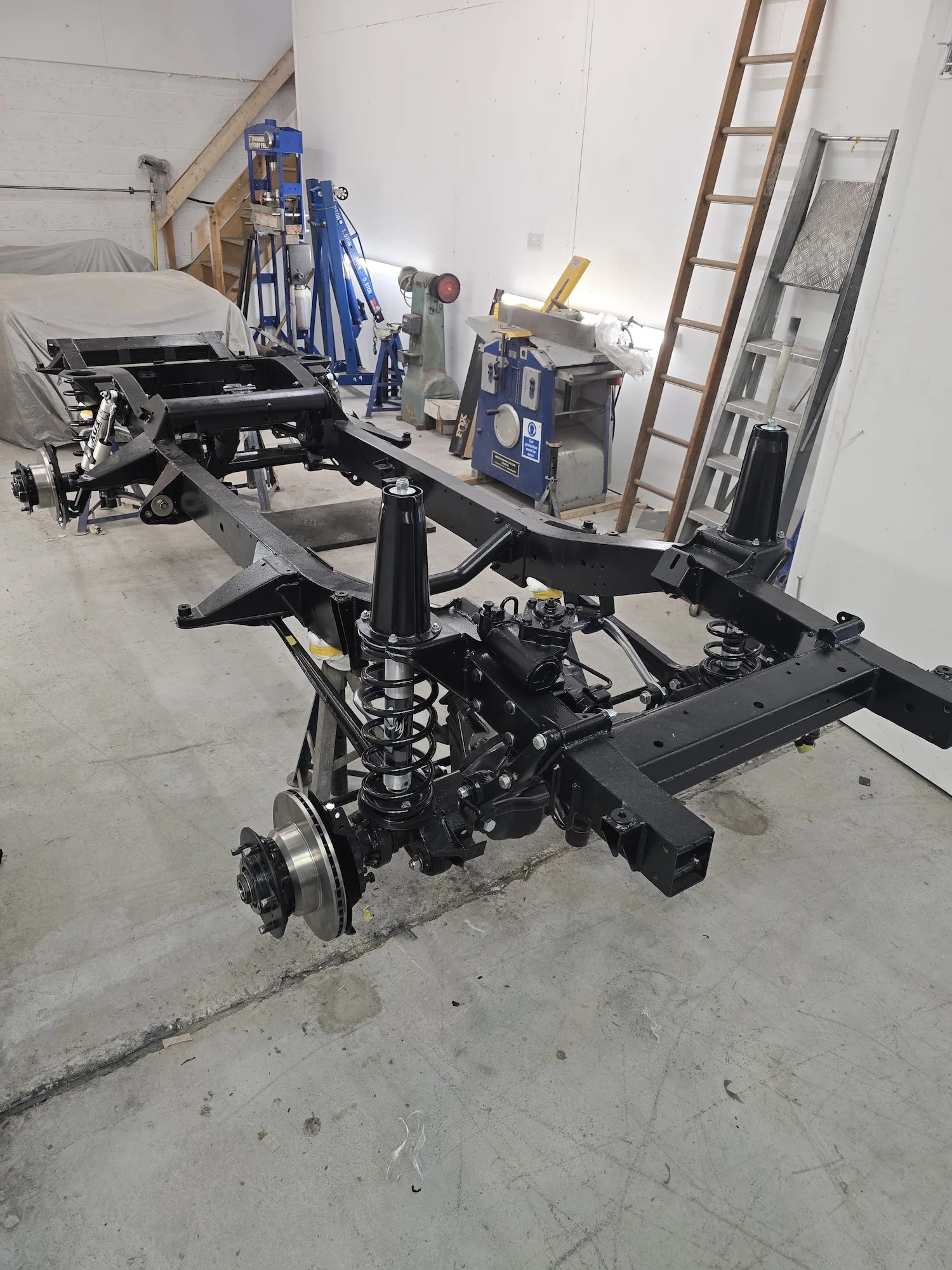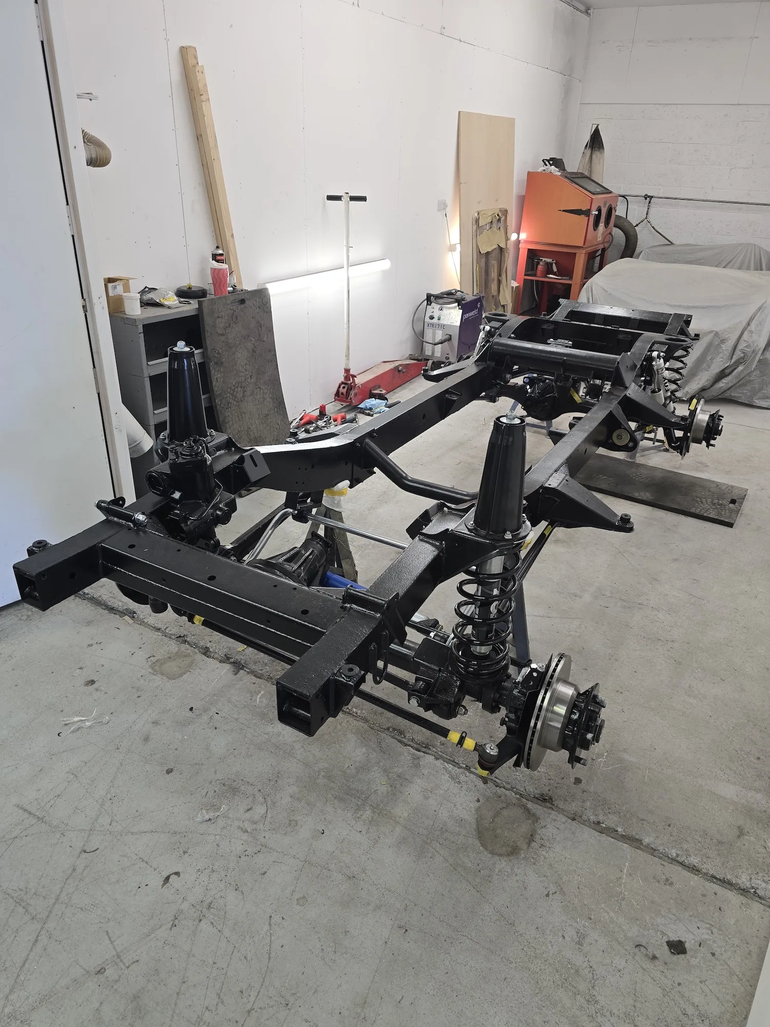 4th August 2025: Suspension/parts were disassembled ready for paint. Front axle fit and suspension assembly to the new chassis. Finished sealer work, stonechip under body, paint under body and engine compartment painted in metallic base coat and clear.