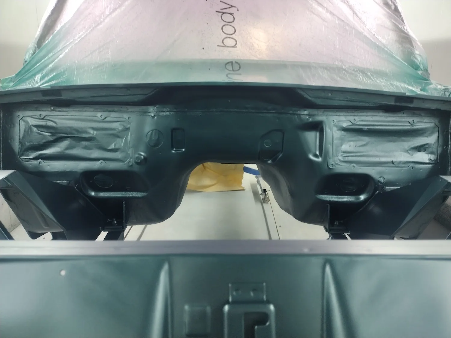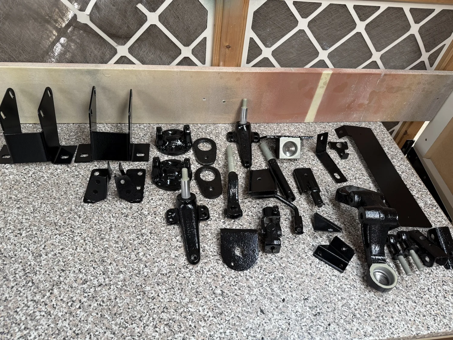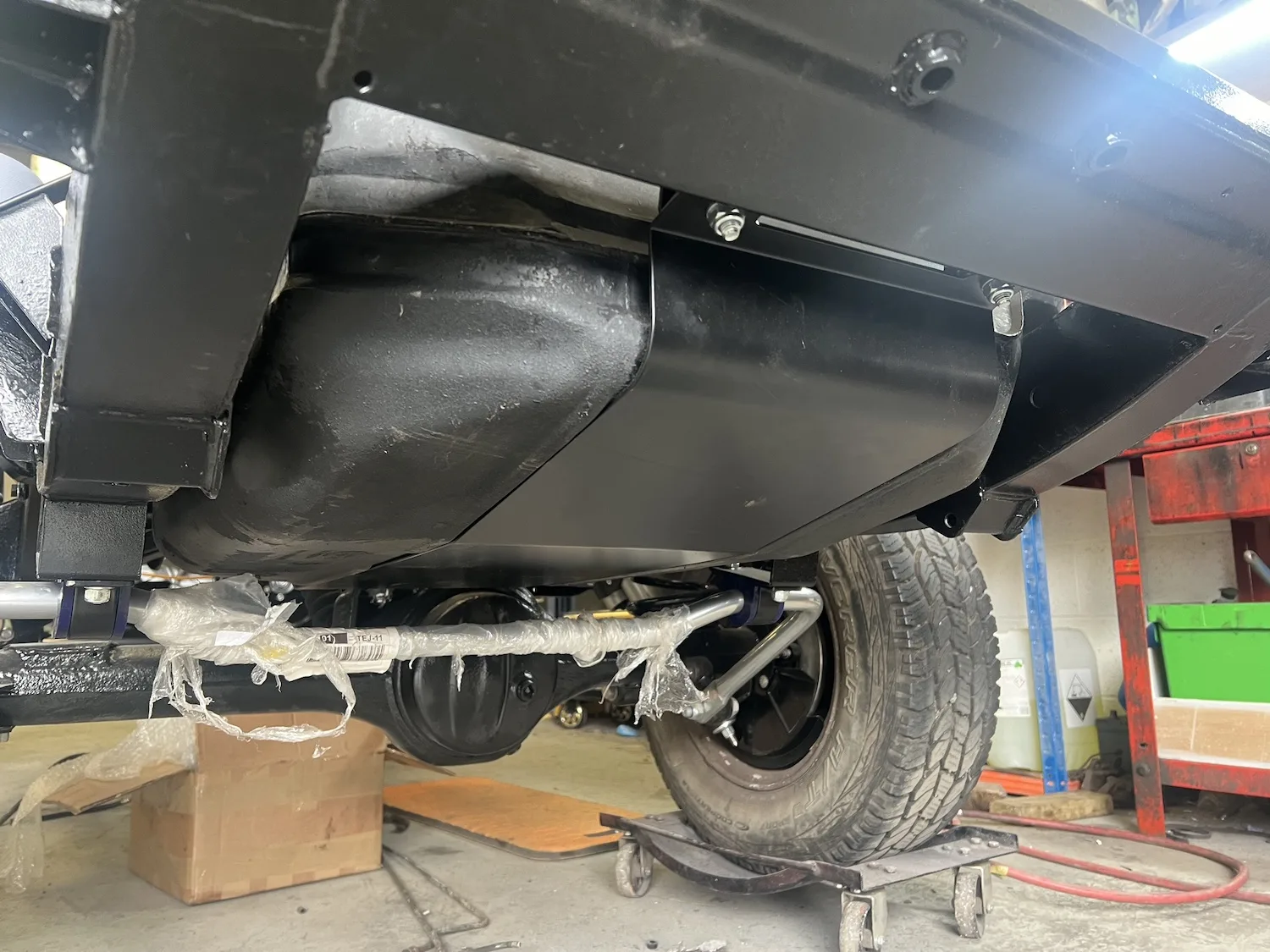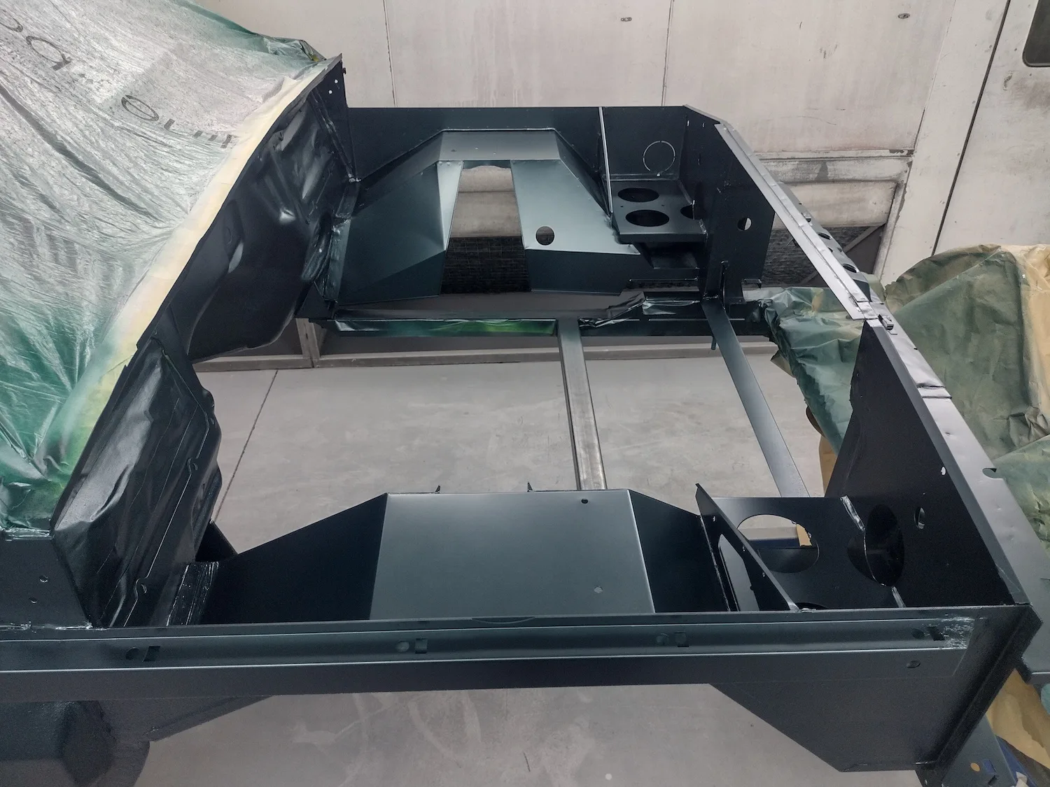 4th August 2025: Suspension/parts were disassembled ready for paint. Front axle fit and suspension assembly to the new chassis. Finished sealer work, stonechip under body, paint under body and engine compartment painted in metallic base coat and clear.
