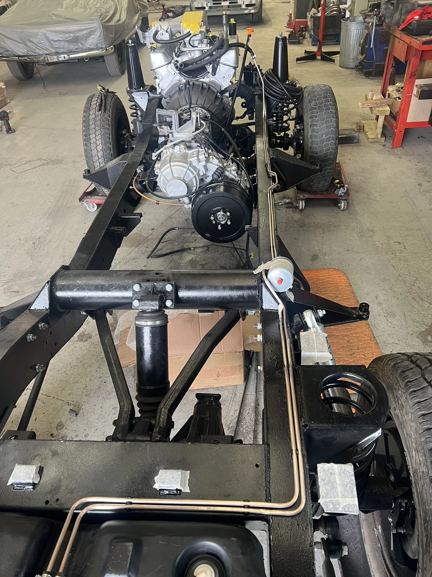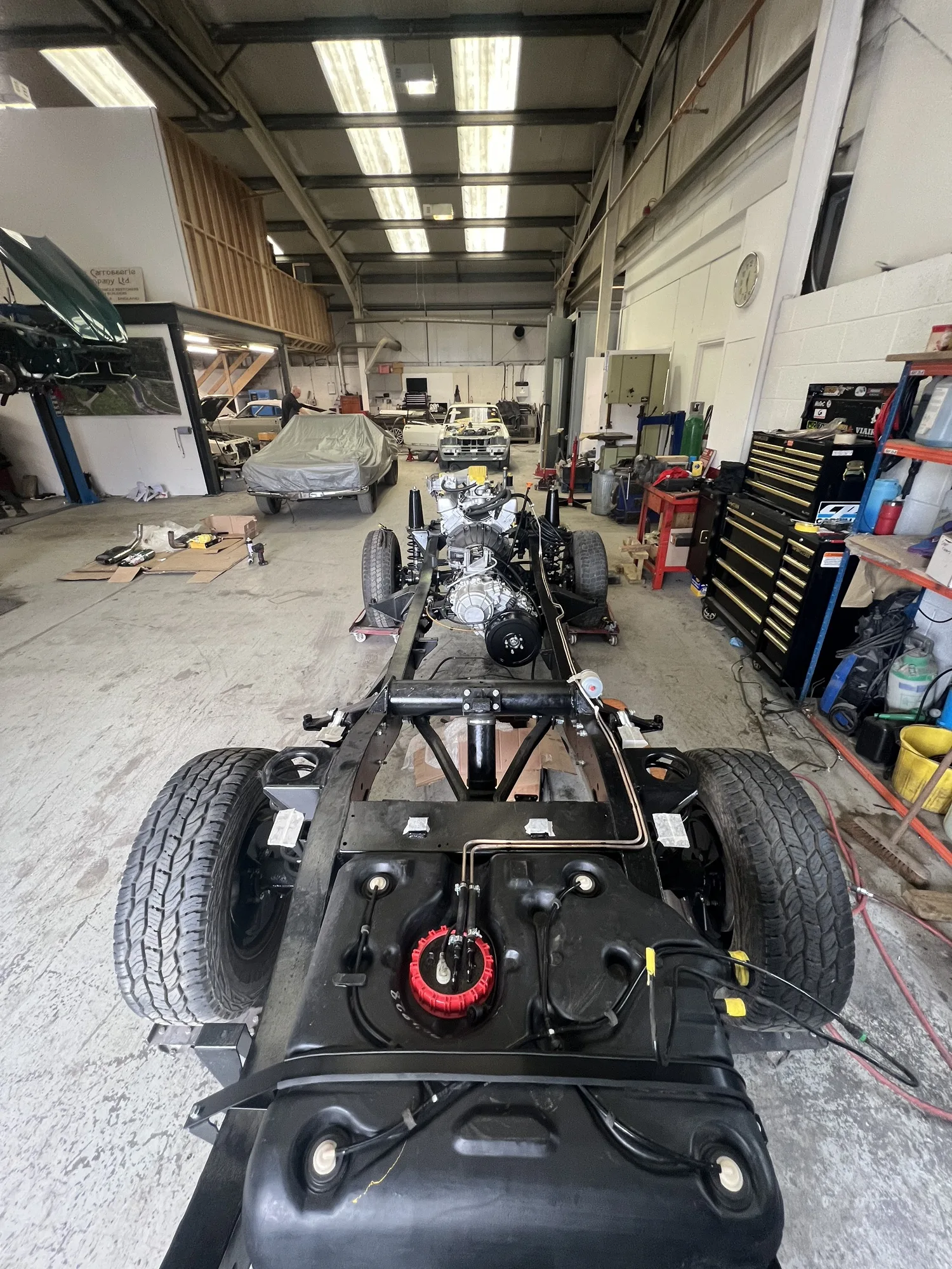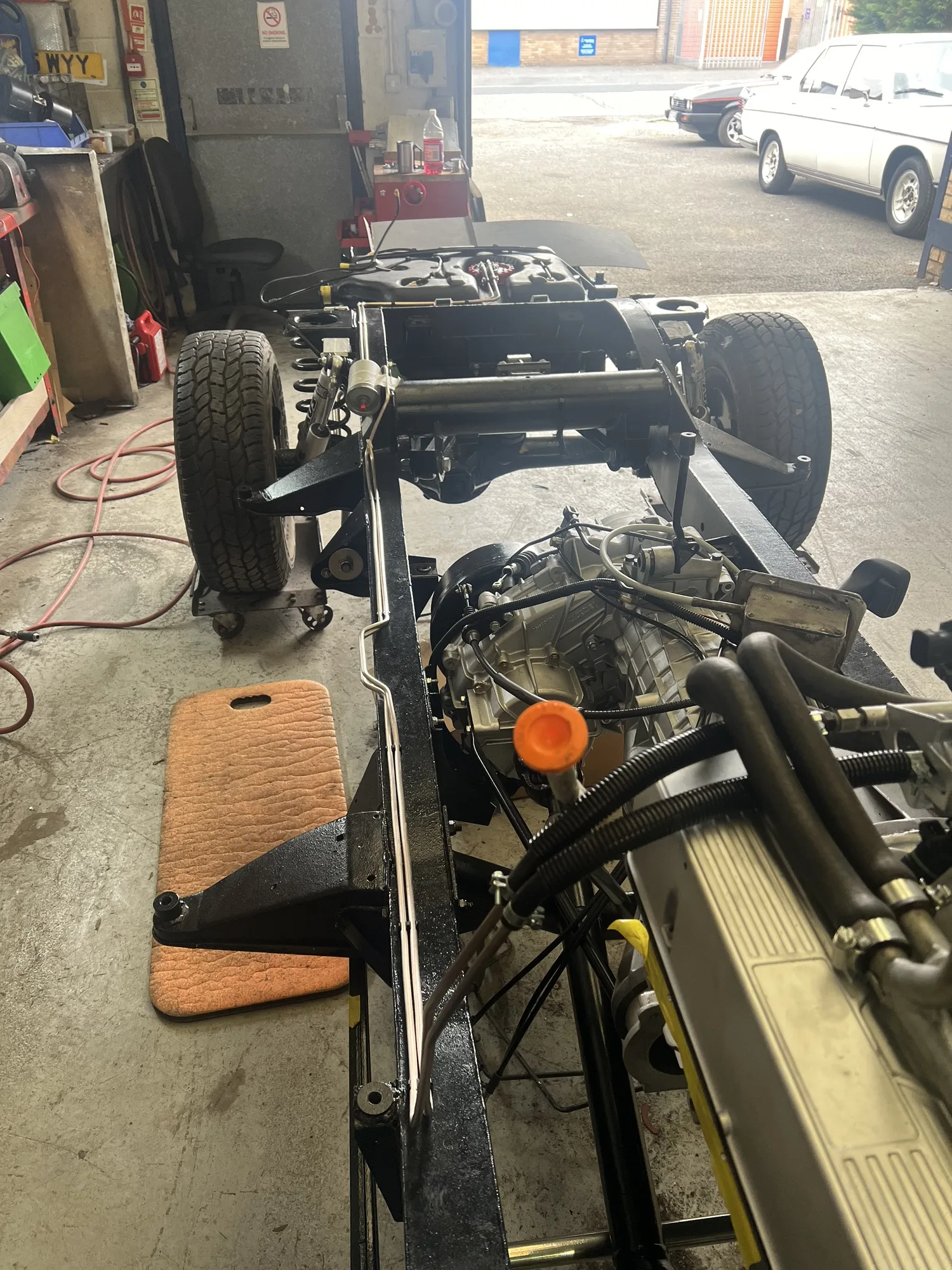 10th October 2025: Chassis with engine and transmission has been fixed to the main body of the car. New brake and fuel lines are just about complete.