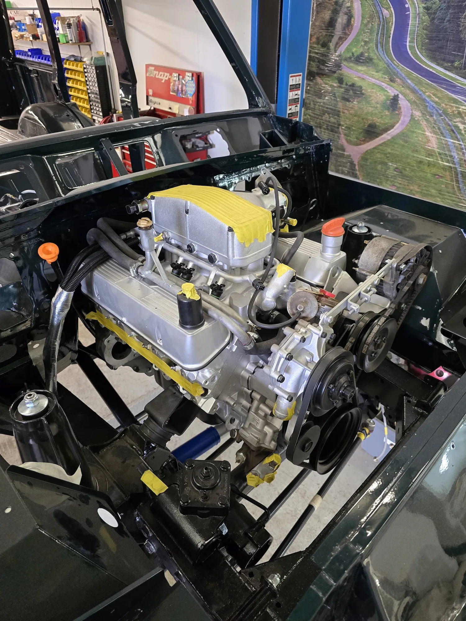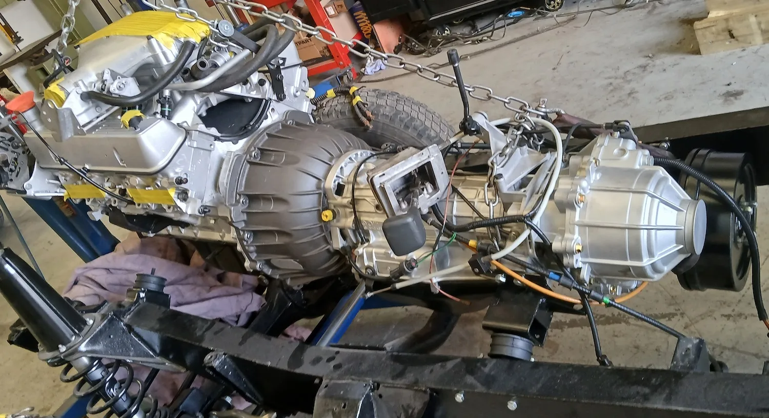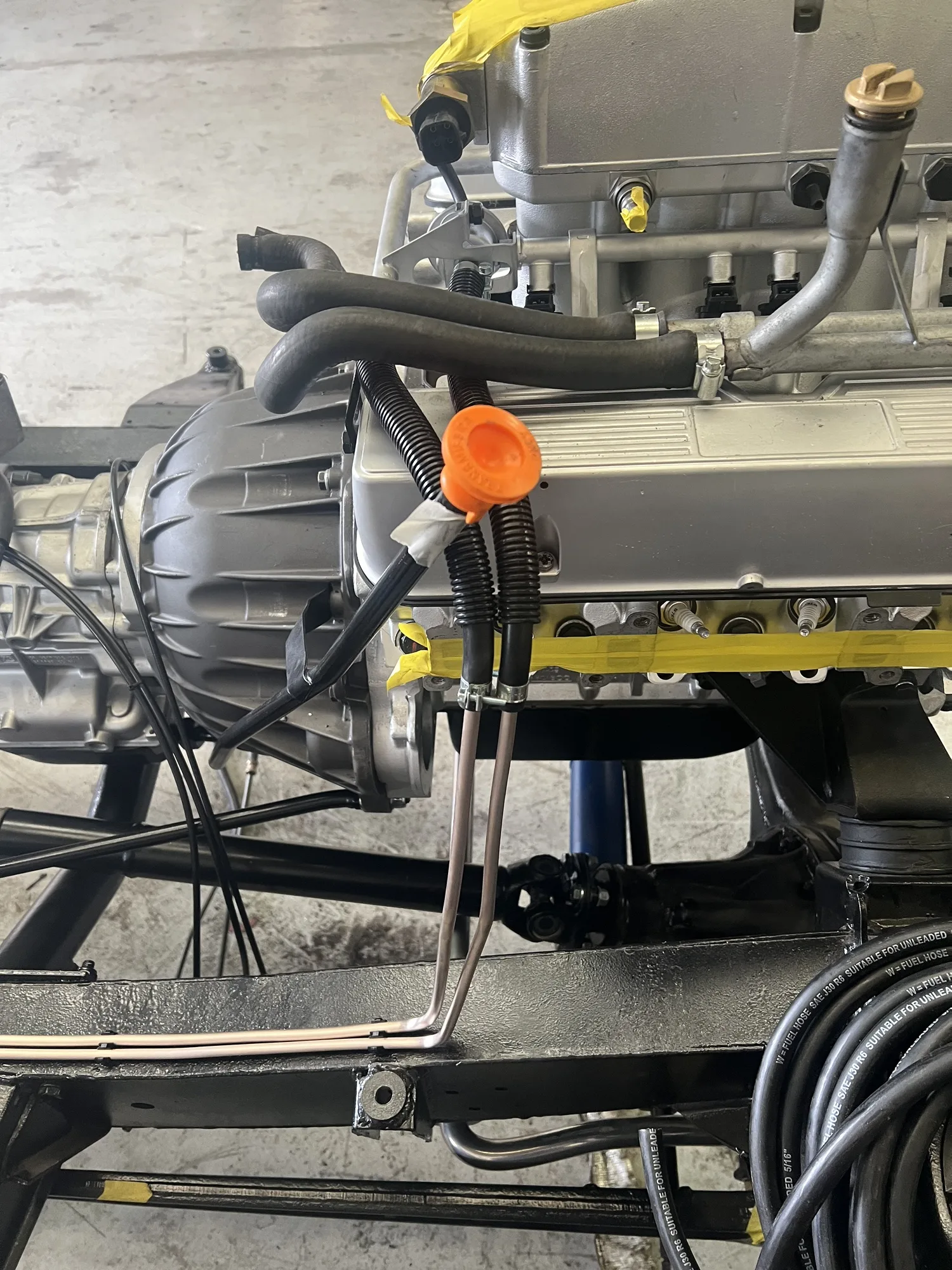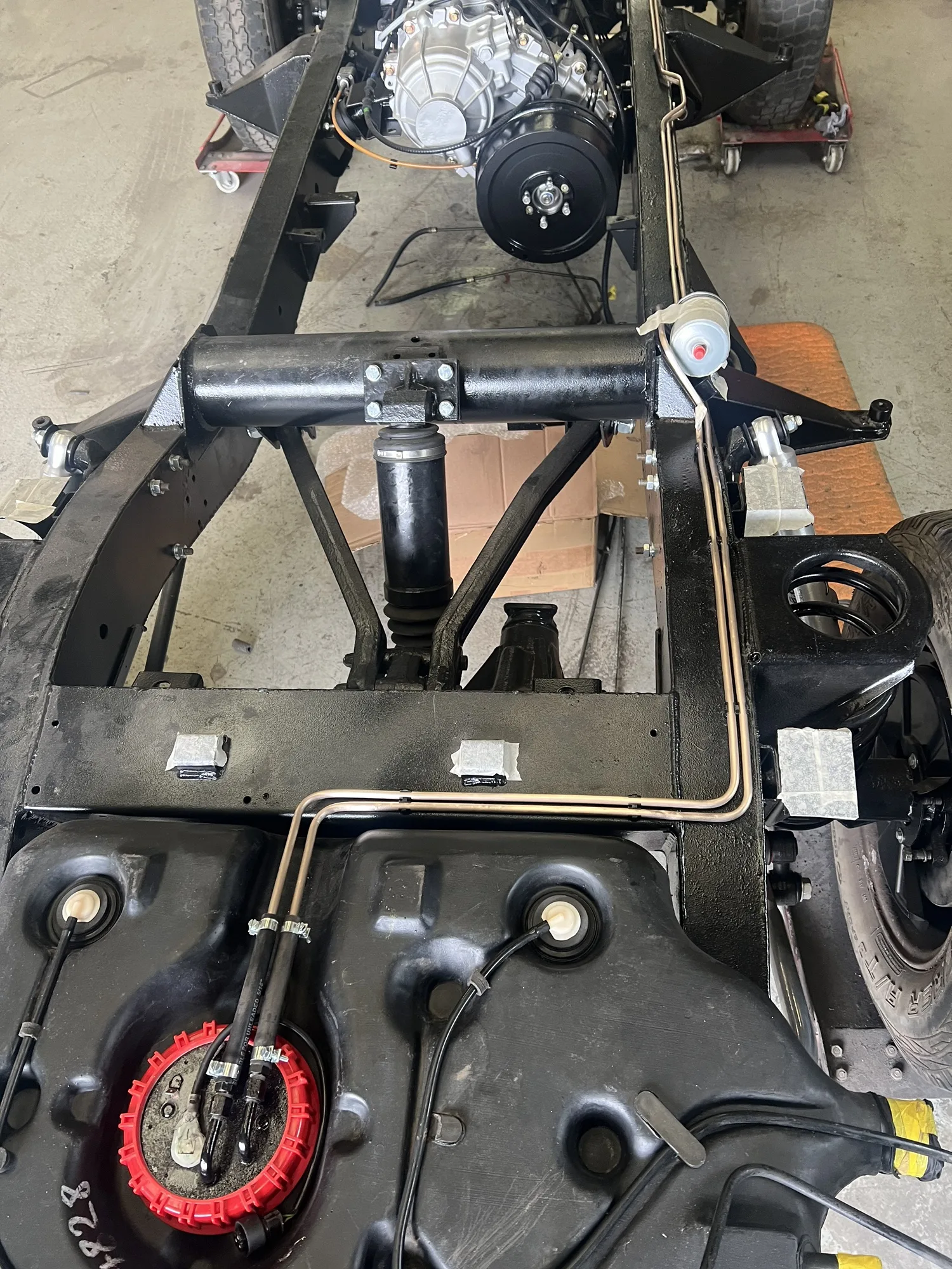 10th October 2025: Chassis with engine and transmission has been fixed to the main body of the car. New brake and fuel lines are just about complete.