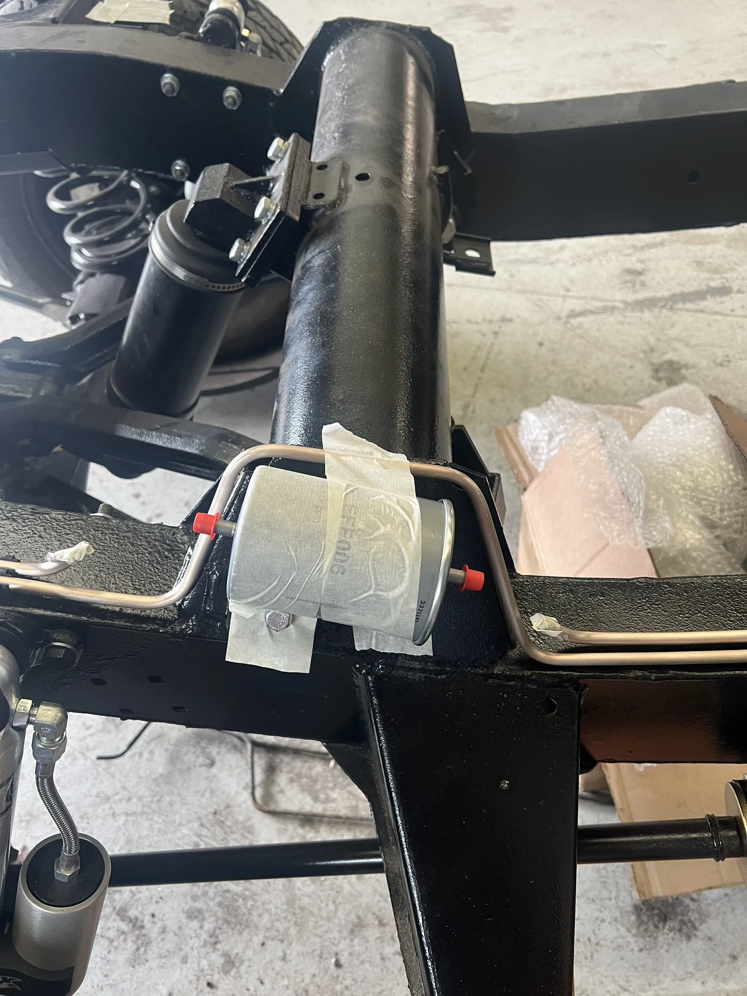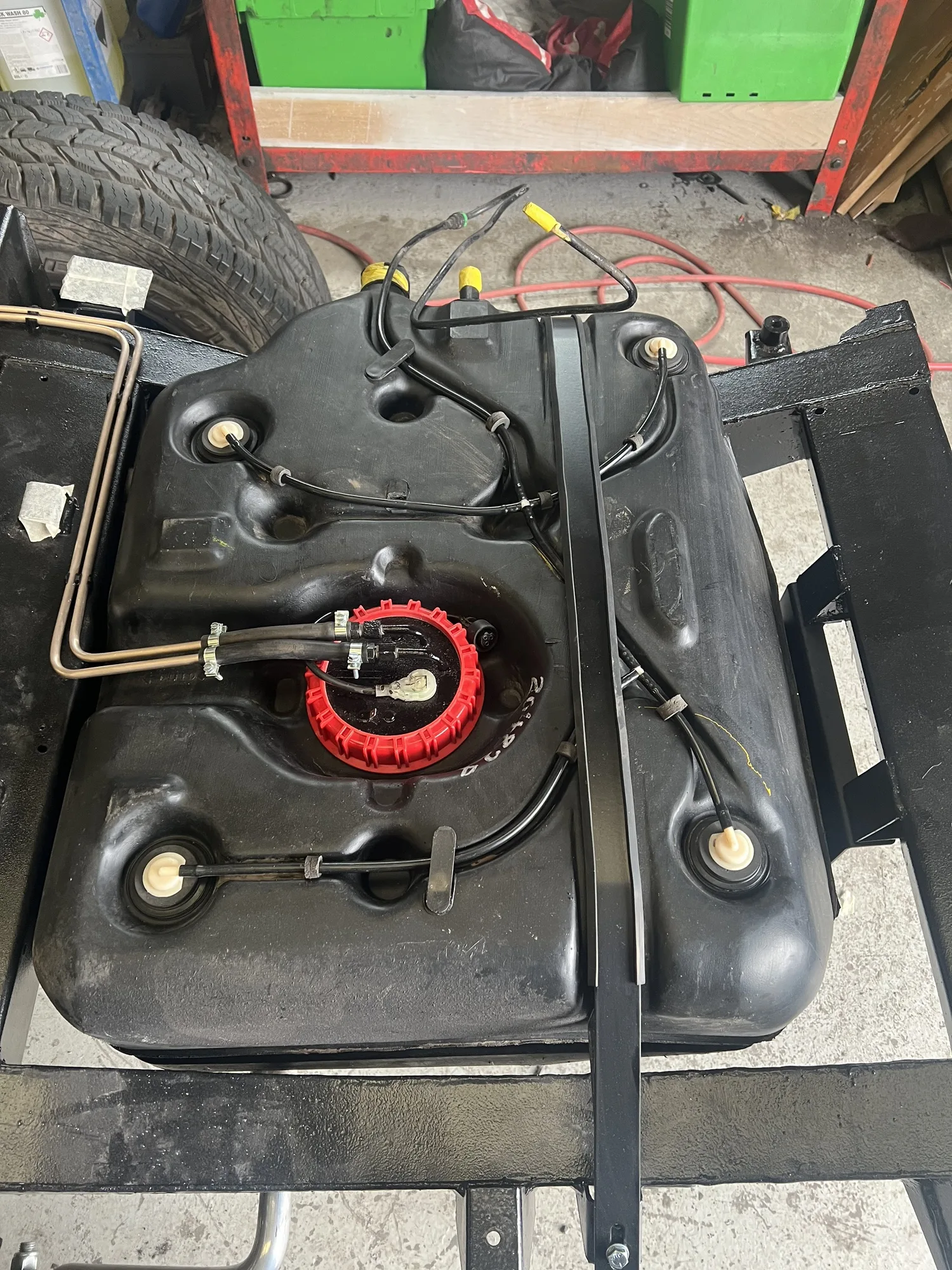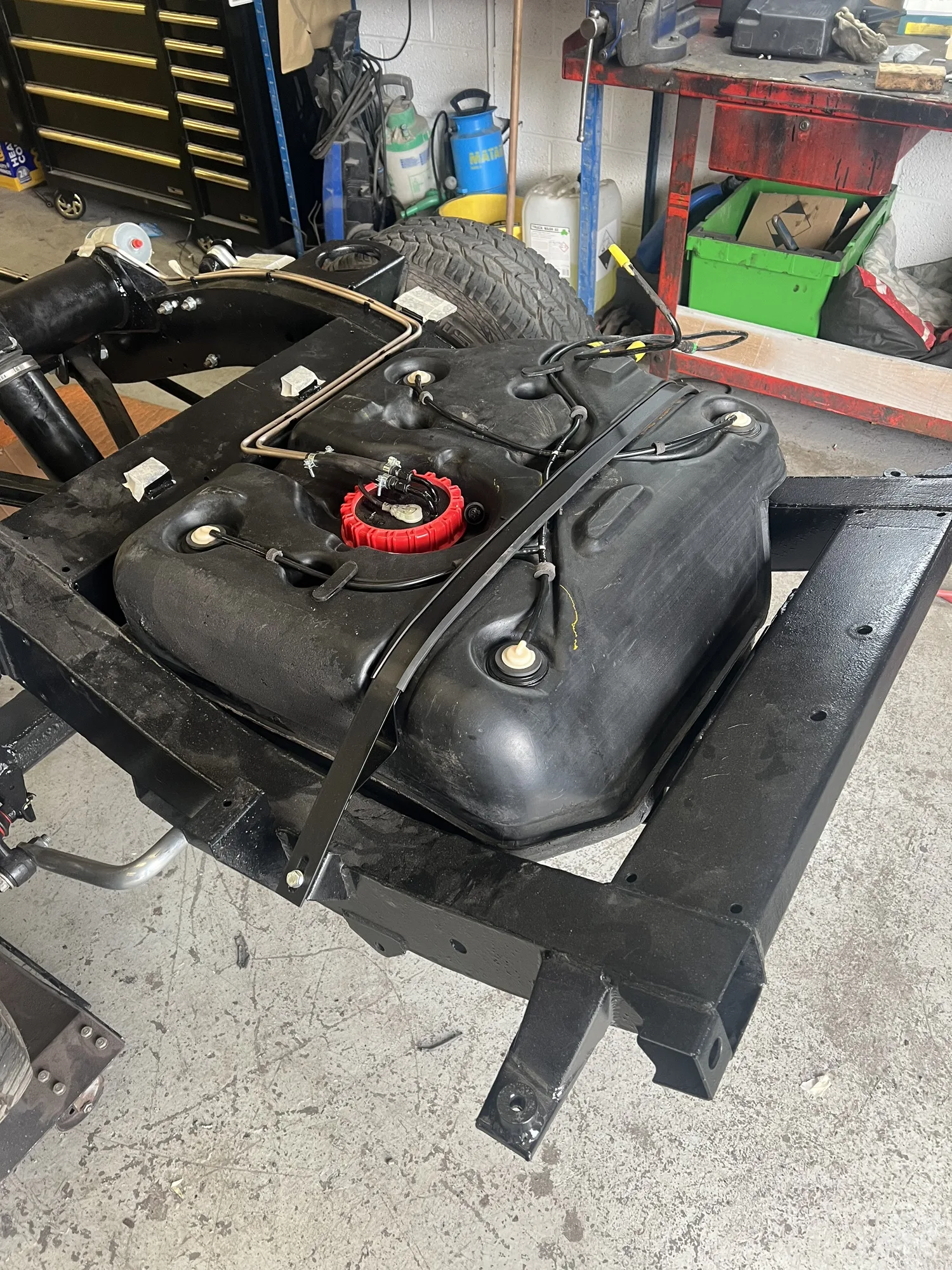 1st October 2025: The gearbox brackets and handbrake unit were removed for paint to freshen the parts up. Once complete they were re-installed and set back up. The door / window frames were then painted matt black. Final prep was also being carried out on the doors before colour. Engine & transmission were then mated to the chassis before the fuel tank was installed and fuel lines made. This included marking and drilling location points for the clips fixed to the chassis. Finally, the door cards have begun to be prepped and trimmed in brown leather.
