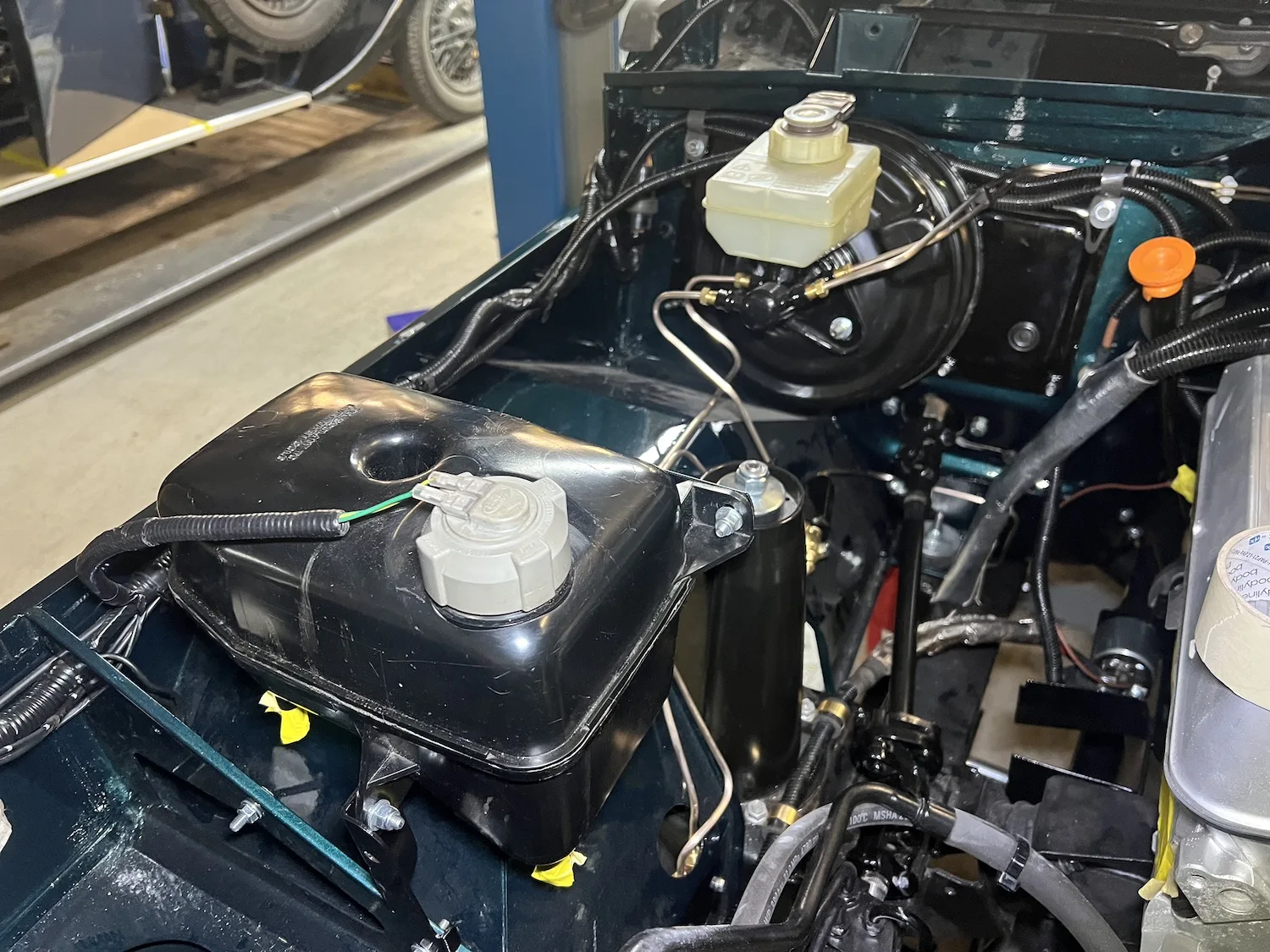 15th October 2025: Rear axle brake pipes and front callipers fitted. OSF Corner brake pipes and wiring loom starting to be fitted. NSF brake pipes routed. Oil cooler mountings made and fitted. Dash insulation and further wiring loom fitted. Oil Cooler, radiator, and oil pipes fitted. Steering column, exhaust, and sound deadening being fitted. Brake pad wear sensor wiring works. Front lights and horn wiring. Brake pipe brackets painted/fitted.